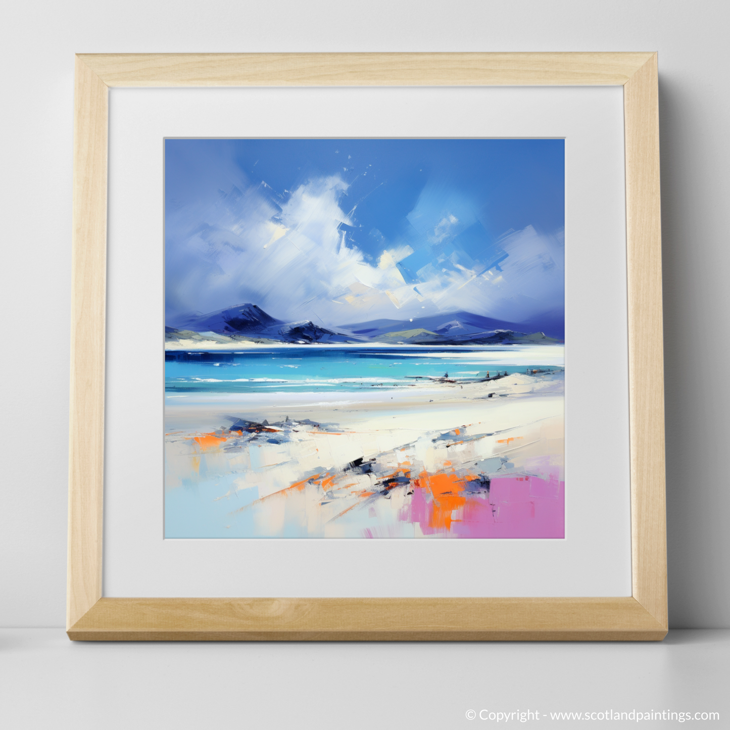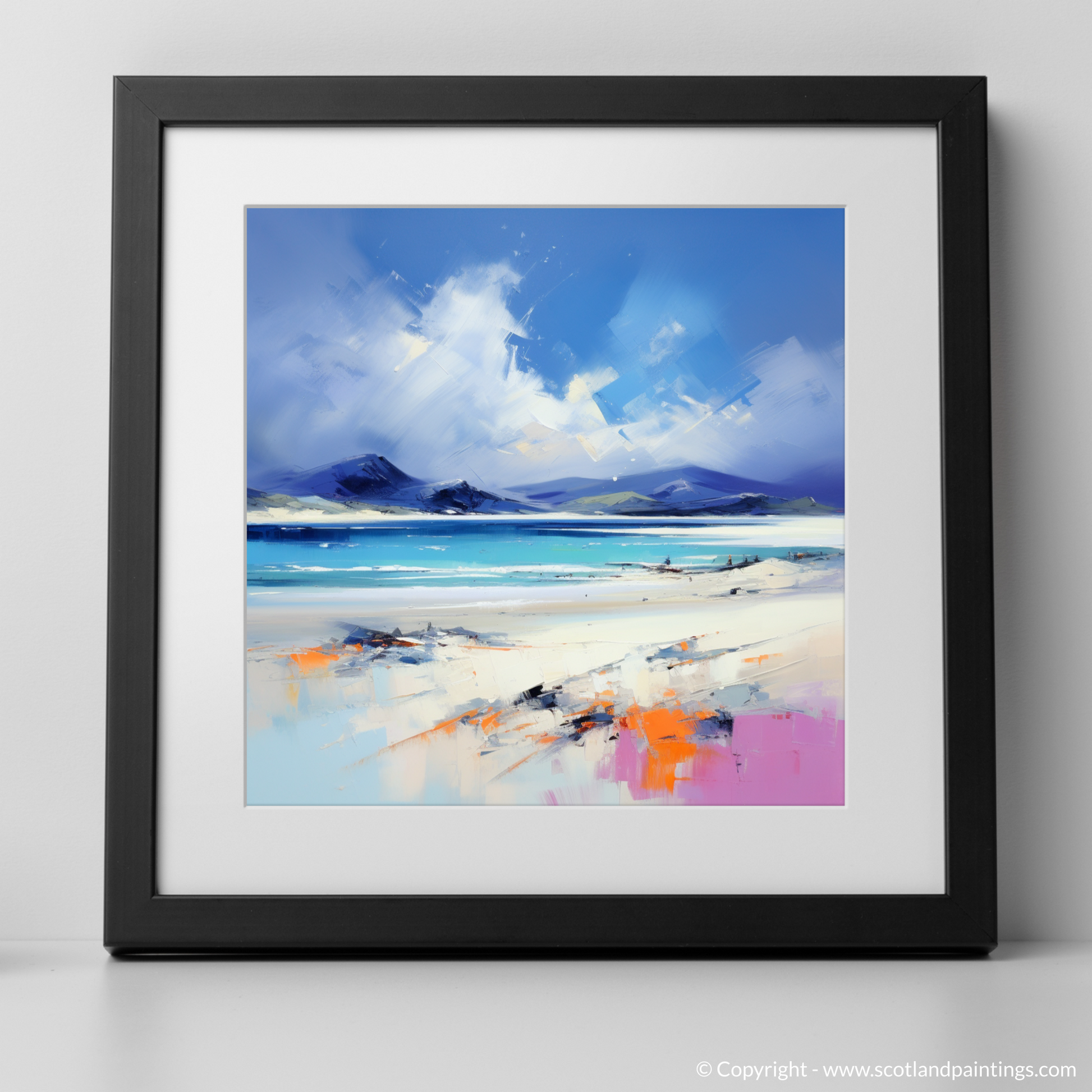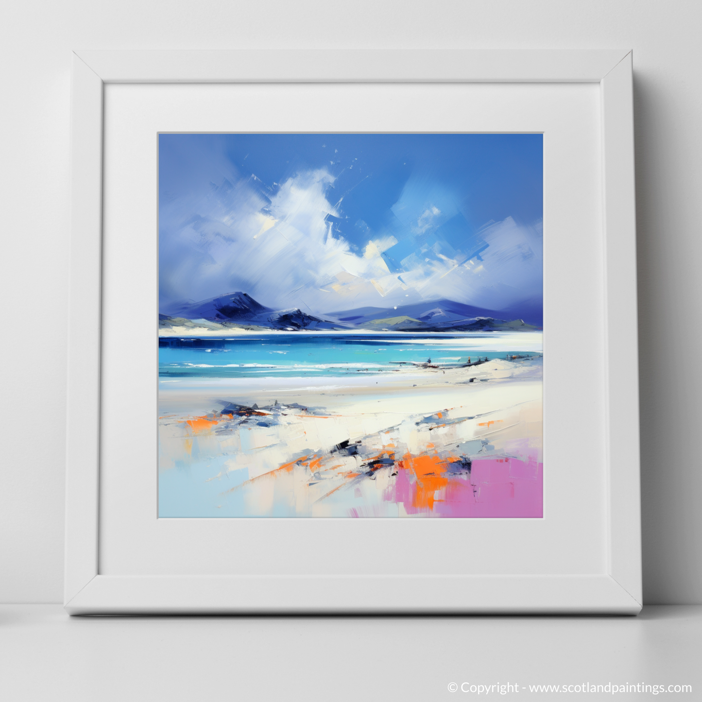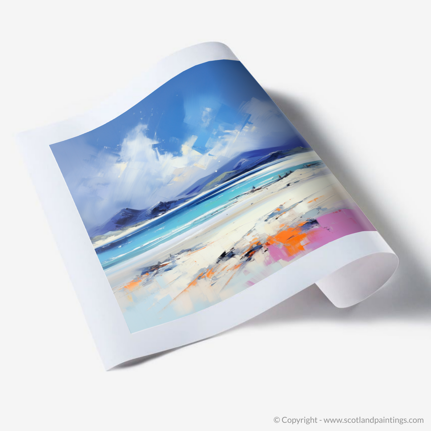 Capturing the wild, untamed beauty of the Isle of Harris, this evocative print brings Luskentyre Beach's stunning vistas right into your space. Bold, sweeping strokes of a cool, radiant blue dominate the sky, hinting at the brisk and invigorating Hebridean air. The horizon is crowned by the distinctive silhouettes of distant hills, their mystical peaks softened by an energetic play of light and shadow, rendered in harmonious shades of blues and whites.