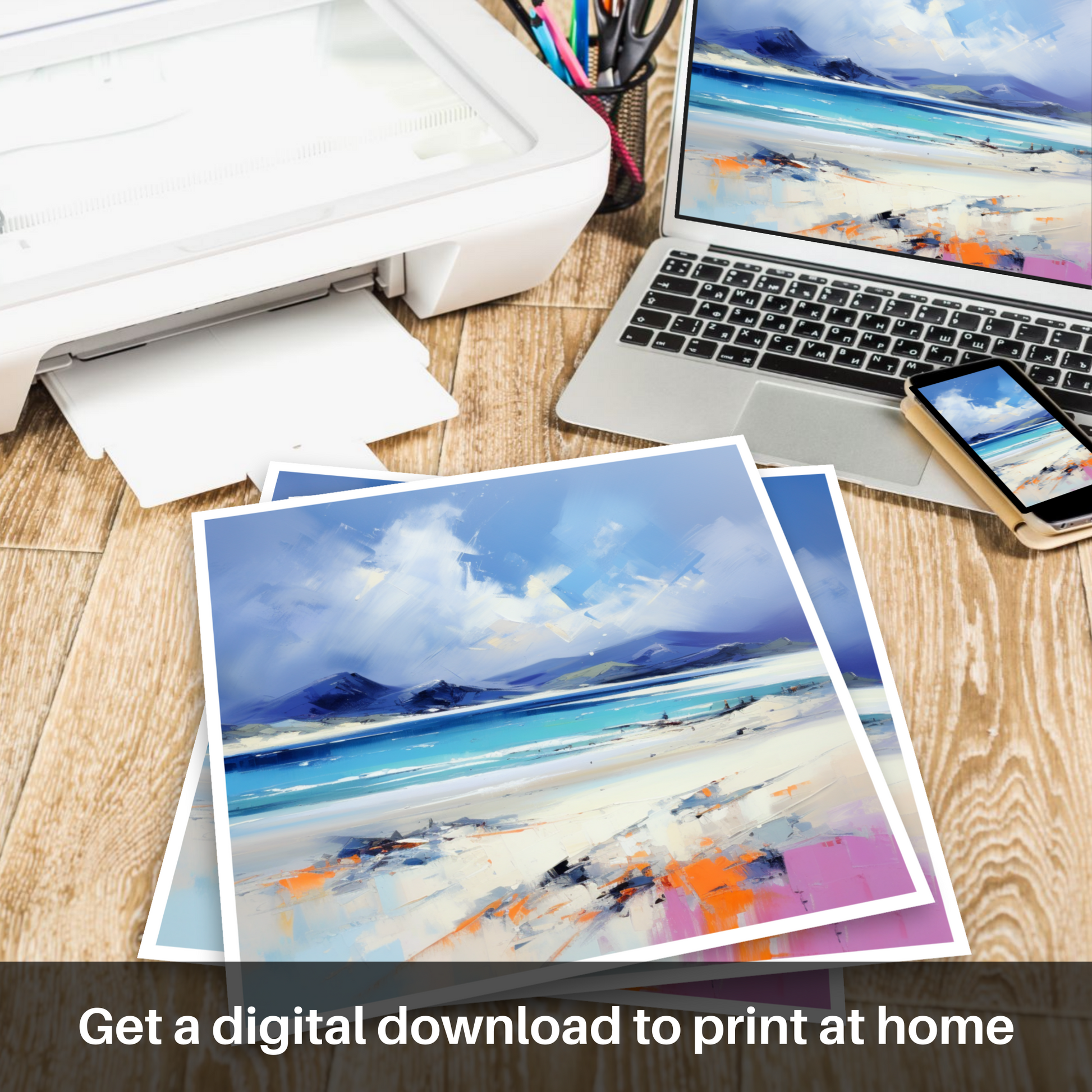This expressive piece channels the spirit of Luskentyre Beach, known for its expansive sands and the ethereal quality of its light. Each brushstroke contributes to a sense of motion and vitality, reflecting the ever-changing moods of Scotland's landscapes. The interplay of colours and the dynamic composition are a celebration of nature's beauty, offering a fresh and modern take on the timeless allure of the Scottish beaches.
