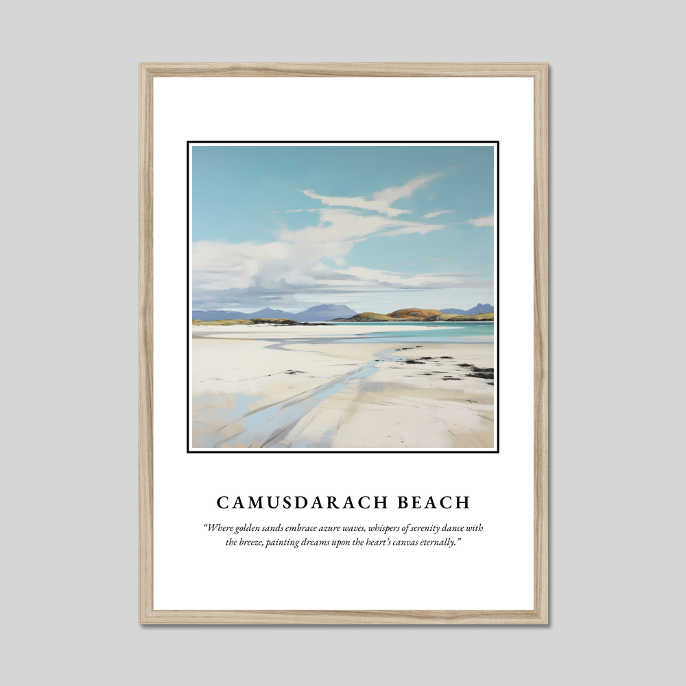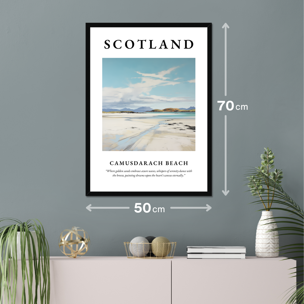 Introducing our captivating framed poster print from the “Scottish Beaches” collection, a stunning celebration of Camusdarach Beach in the minimalism style. Measuring an impressive 50cm x 70cm, this piece makes a bold statement, offering wall-to-wall elegance without the hefty price tag. Available in sleek black, crisp white, or charming natural wood-effect, this versatile poster complements any décor, making it a perfect addition to your home or office.