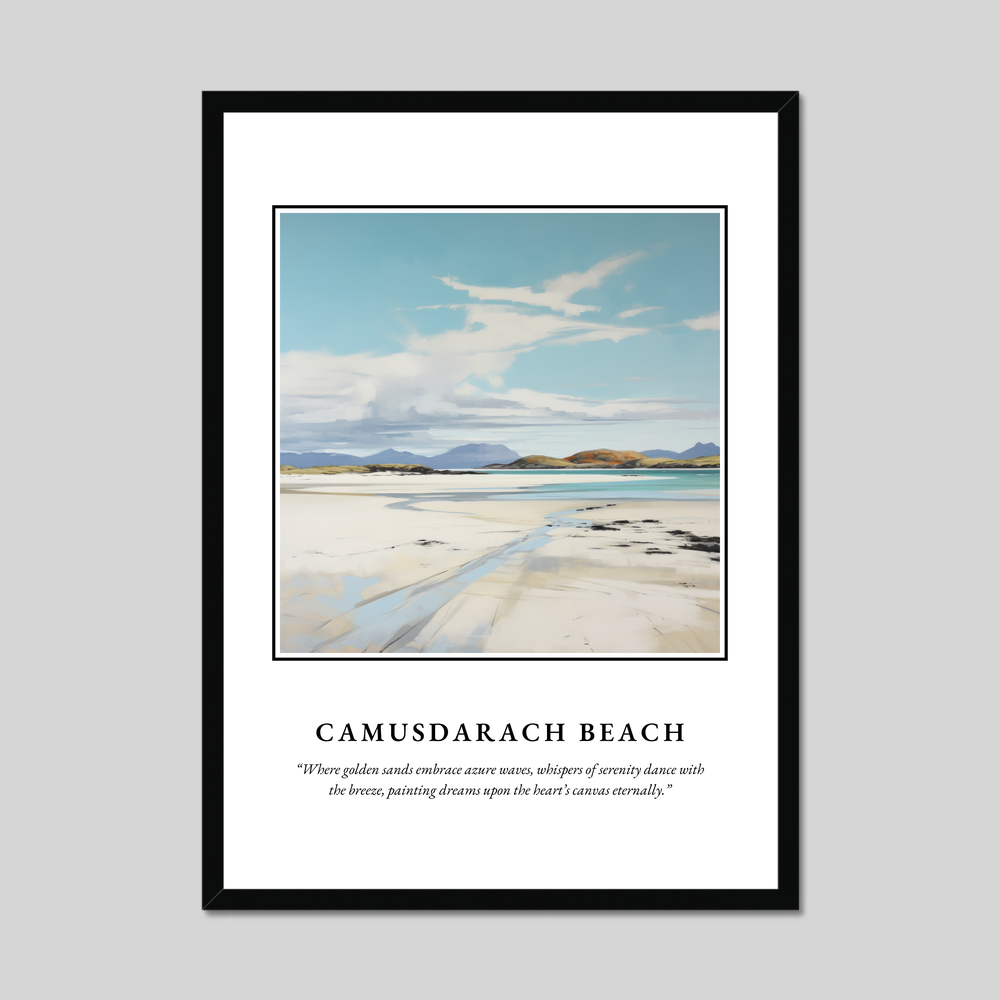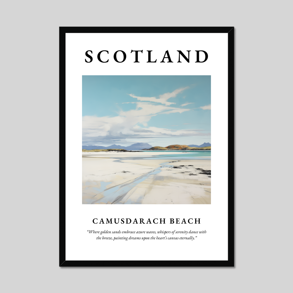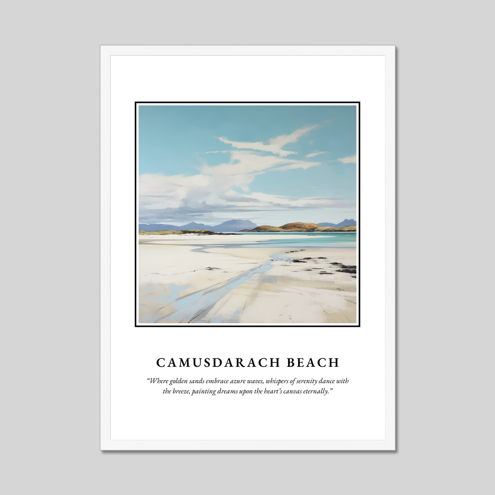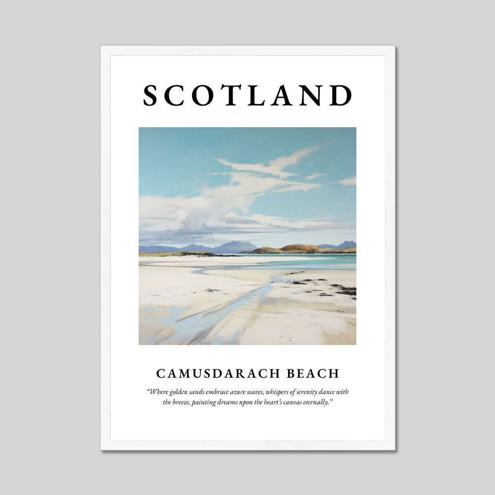 Camusdarach Beach, nestled in the west coast of Scotland, is renowned for its breathtaking scenery and peaceful ambiance. Known for glimmering golden sands set against the backdrop of turquoise sea, this beach is a haven for those seeking tranquillity and natural beauty. The gentle lapping of waves and whisper of the breeze offer a rejuvenating escape, perfectly captured in our art poster.