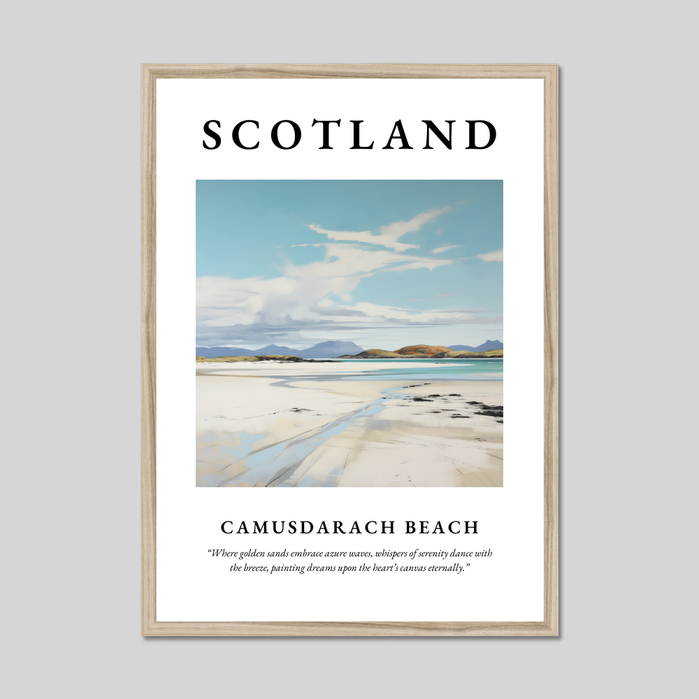 Displaying the word “SCOTLAND” in bold above a serene depiction of Camusdarach Beach, this art piece effortlessly bridges the gap between modern chic and timeless beauty. Below, the evocative quote “Where golden sands embrace azure waves, whispers of serenity dance with the breeze, painting dreams upon the heart’s canvas eternally,” captures the tranquillity and allure of this cherished location.