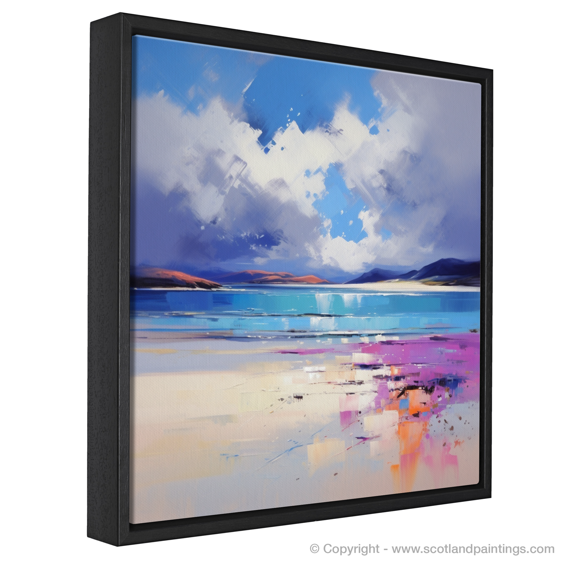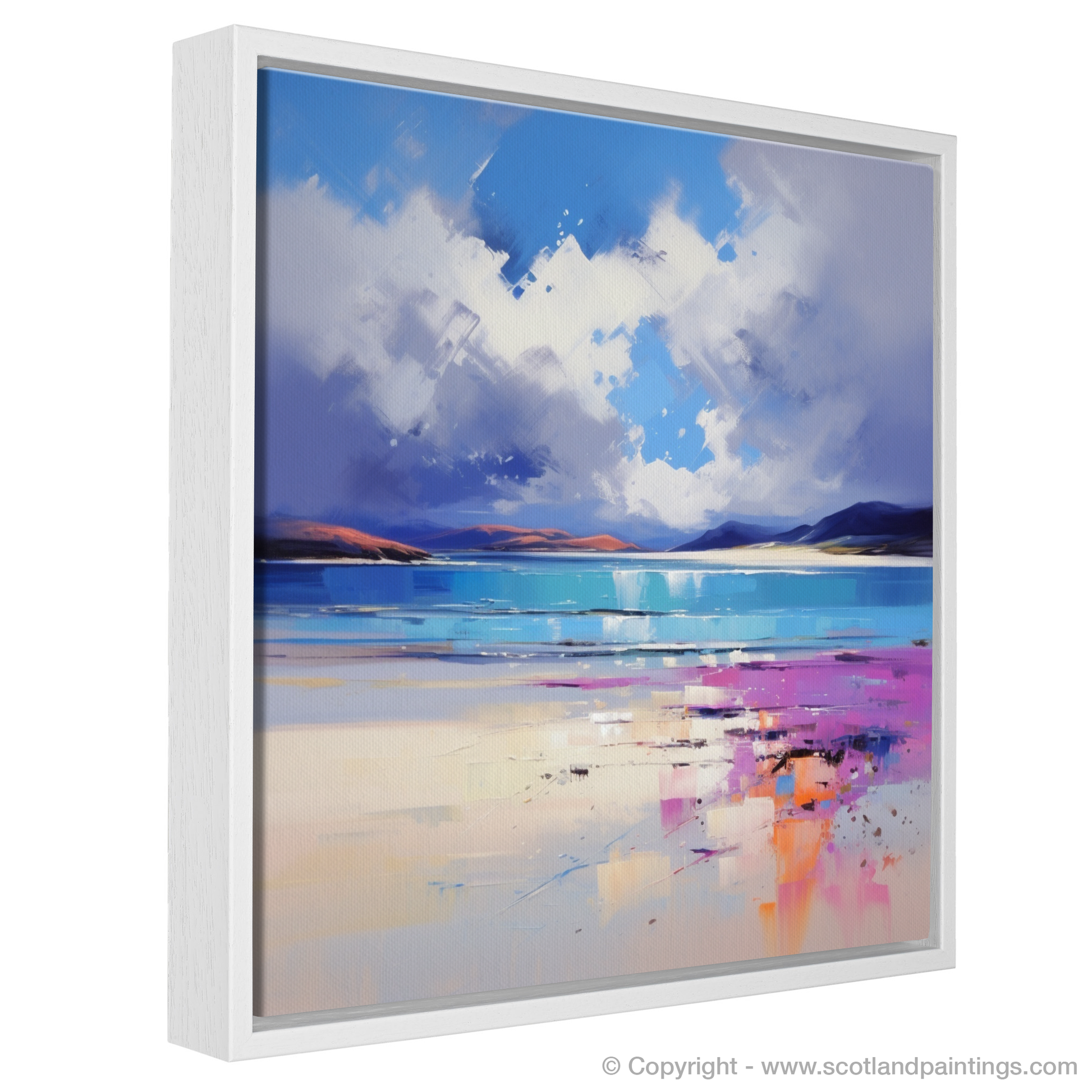 Capturing the untamed beauty of Scotland's coast, this expressive print takes inspiration from the mesmerising Luskentyre Beach on the Isle of Harris. With its bold strokes and vivid palette, the artwork evokes the wild spirit of the place, where azure skies meet the crisp horizon in a dance of colour and light.