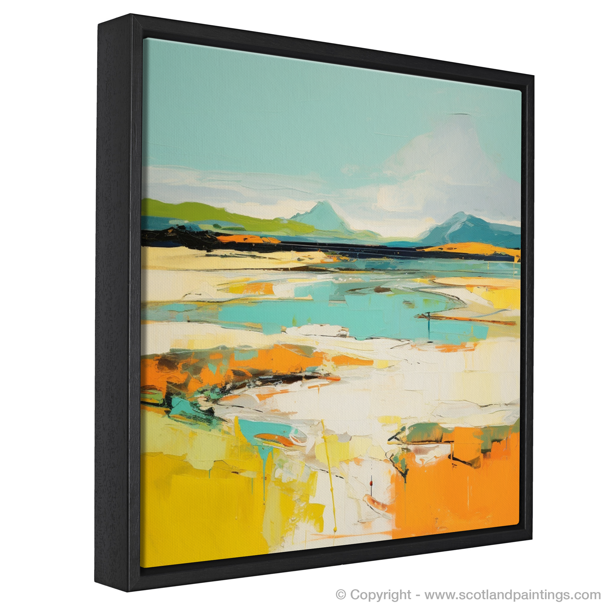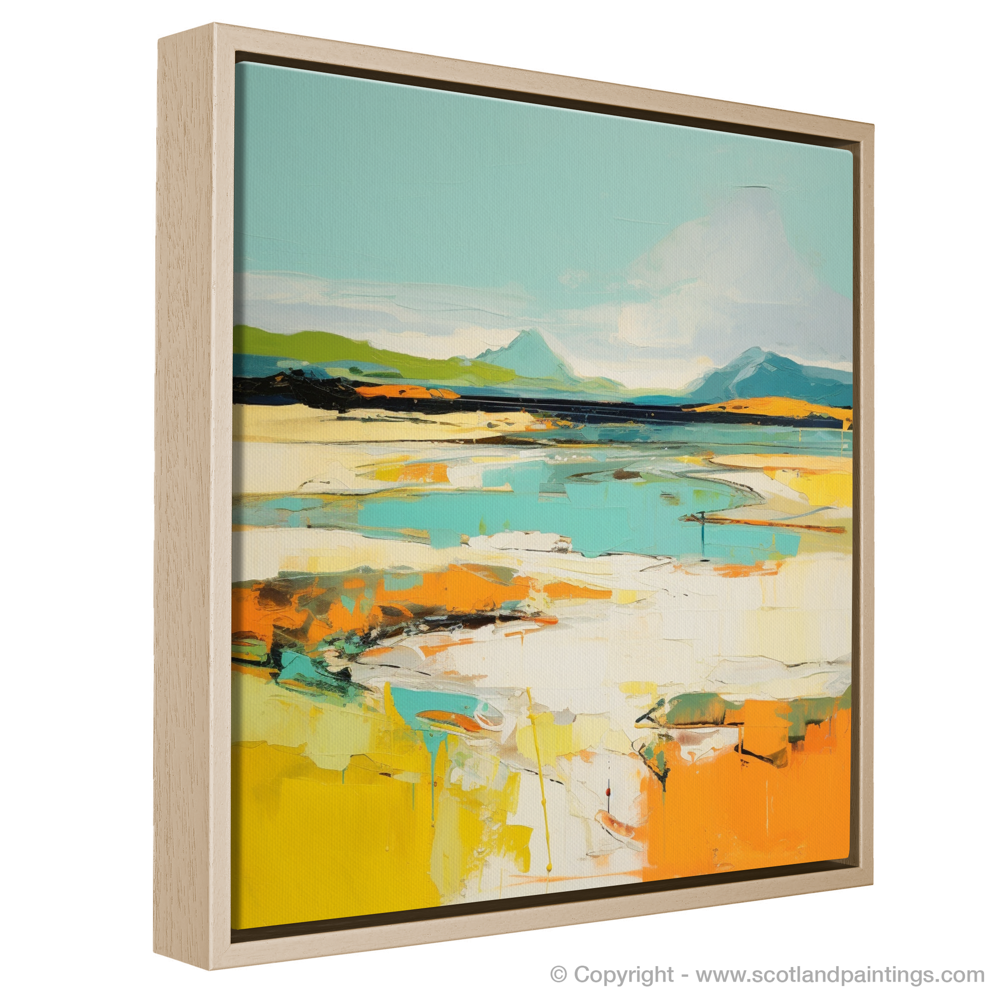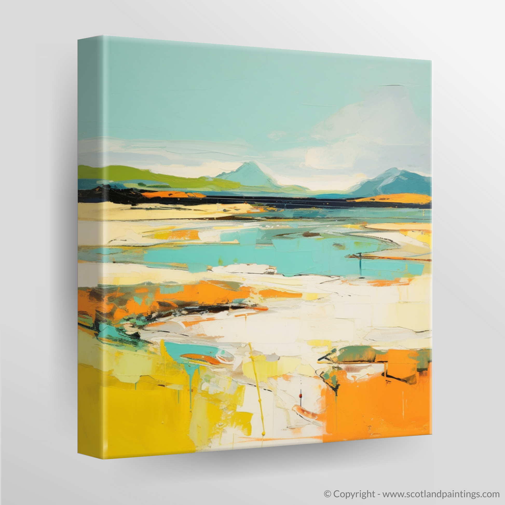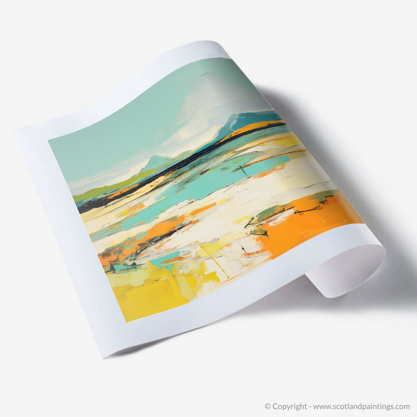 Captured within this abstract portrayal of Camusdarach Beach near Arisaig is a vibrant amalgamation of colours and shapes that summon the spirit of Scotland's rugged coastal beauty. The piece conveys the essence of the shoreline through bold strokes and a lively palette, where cerulean and azure meet the horizon in an embrace of sky and sea, while the warmth of golden hues and sunlit oranges reflects the sandy beach's glow.