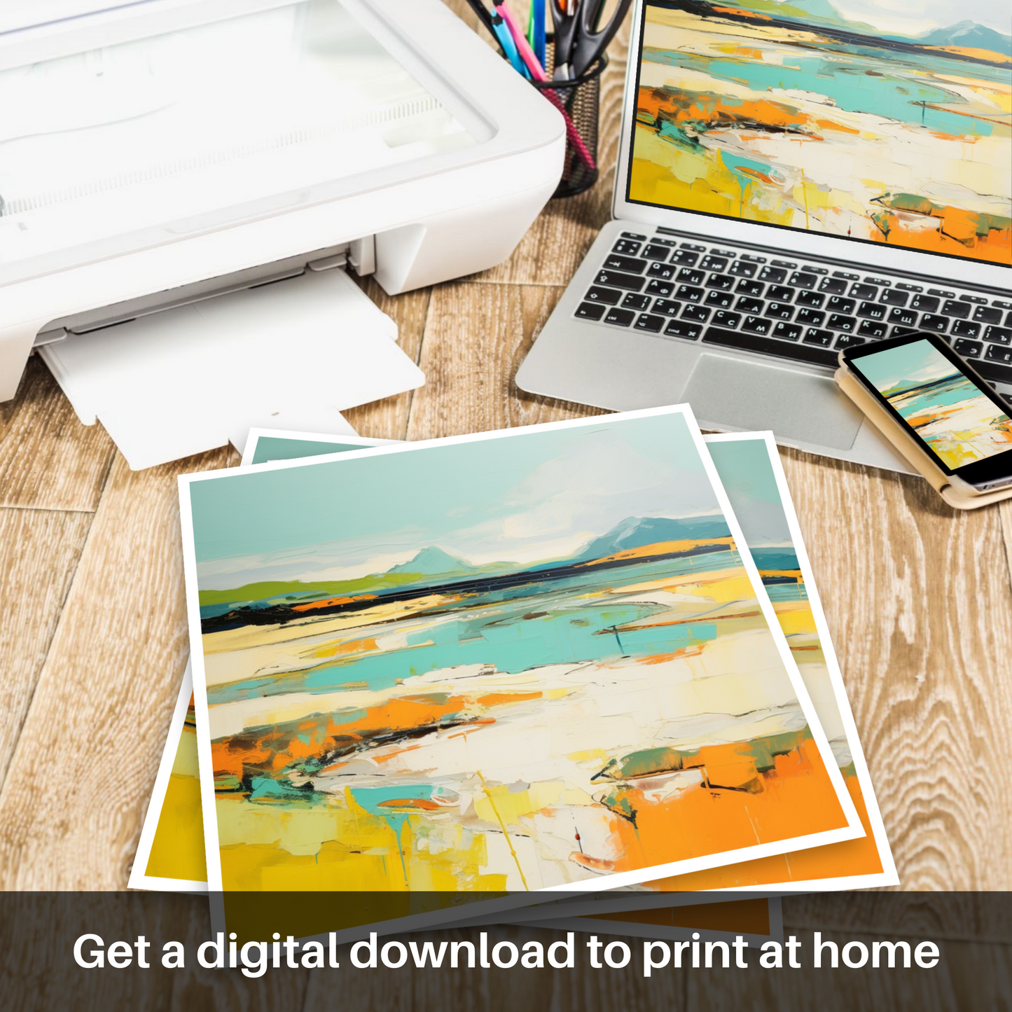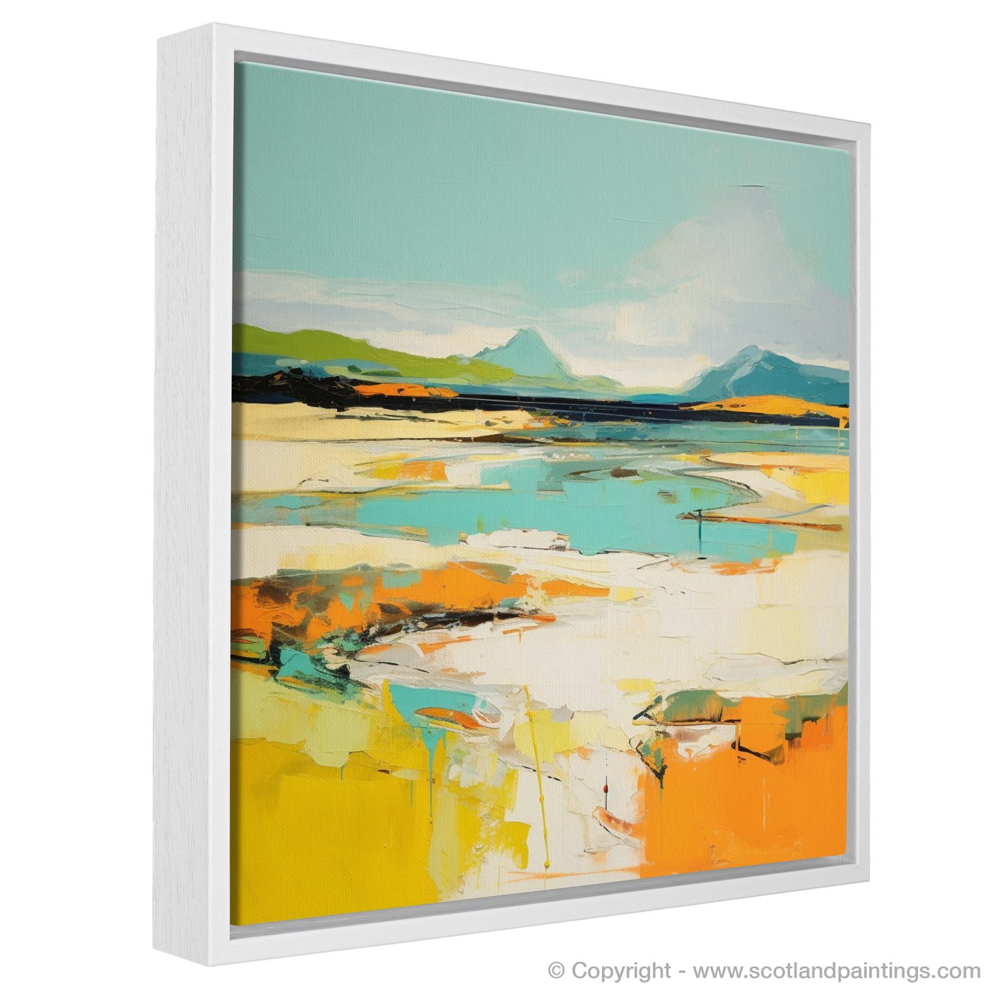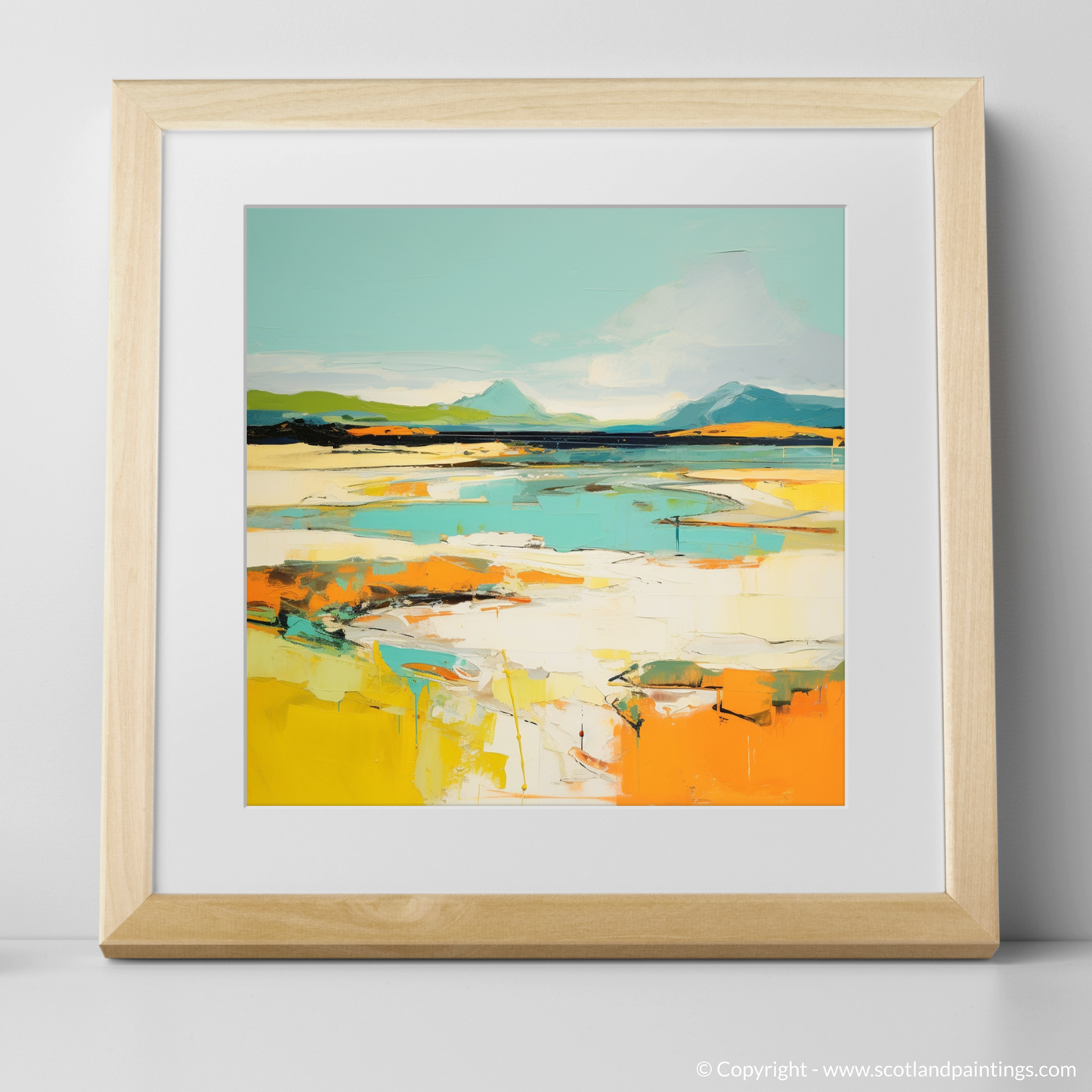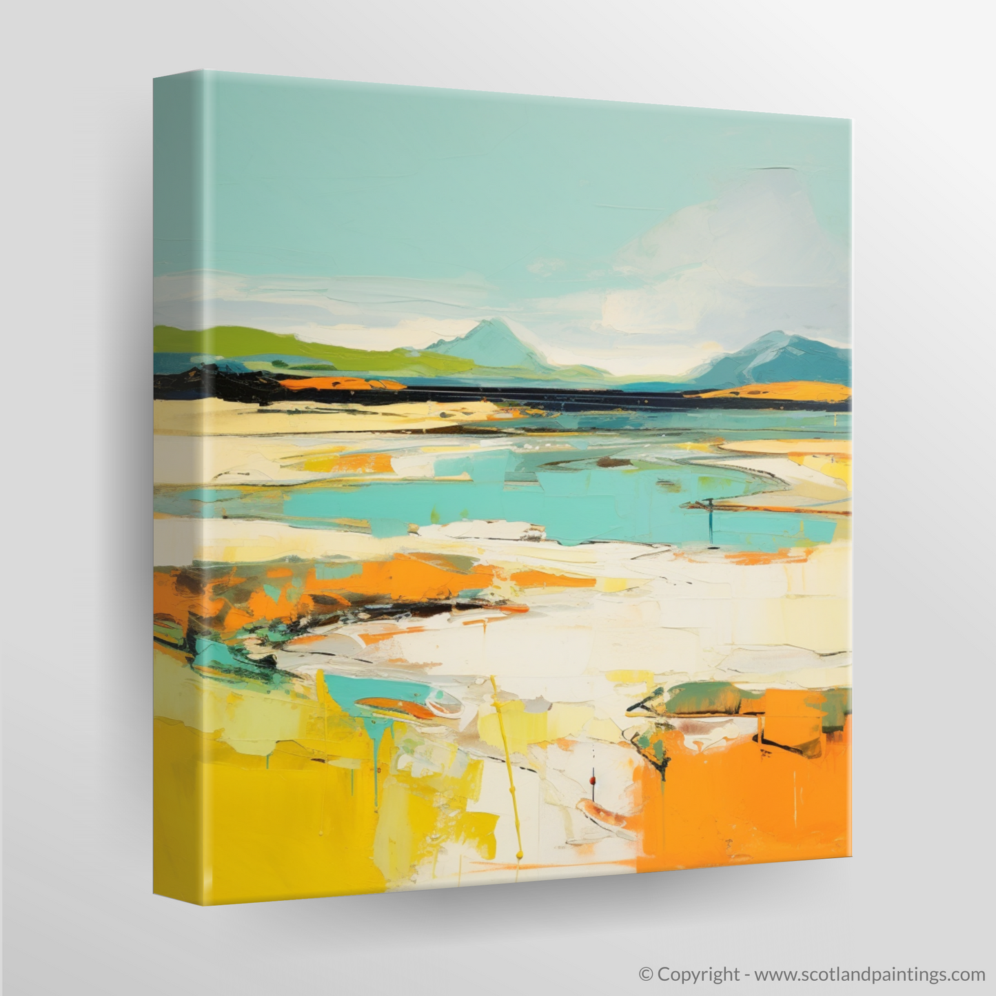 Captured within this abstract portrayal of Camusdarach Beach near Arisaig is a vibrant amalgamation of colours and shapes that summon the spirit of Scotland's rugged coastal beauty. The piece conveys the essence of the shoreline through bold strokes and a lively palette, where cerulean and azure meet the horizon in an embrace of sky and sea, while the warmth of golden hues and sunlit oranges reflects the sandy beach's glow.