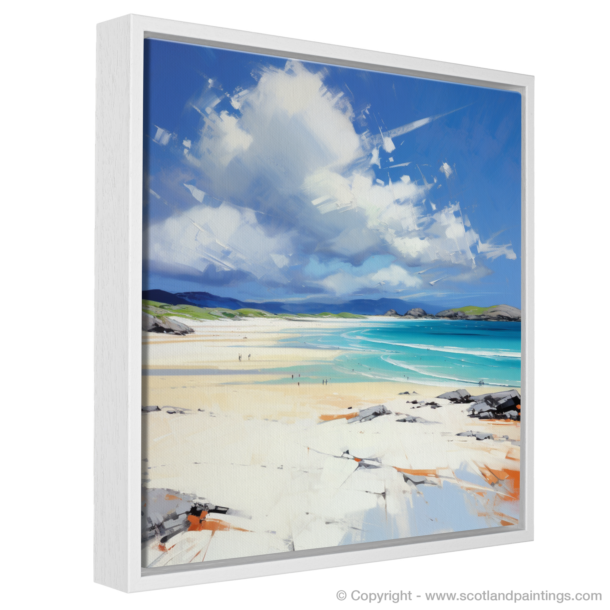 Capture the serene beauty of Luskentyre Beach with this evocative contemporary print, a part of the 'Scottish Beaches' collection. This piece splendidly conveys the expansive sands and crystal-clear azure waters that make this beach a jewel of the Isle of Harris. The dynamic brushstrokes lend a vibrant energy to the scene, while the delicate interplay of light and shadow brings to life the picturesque landscape.