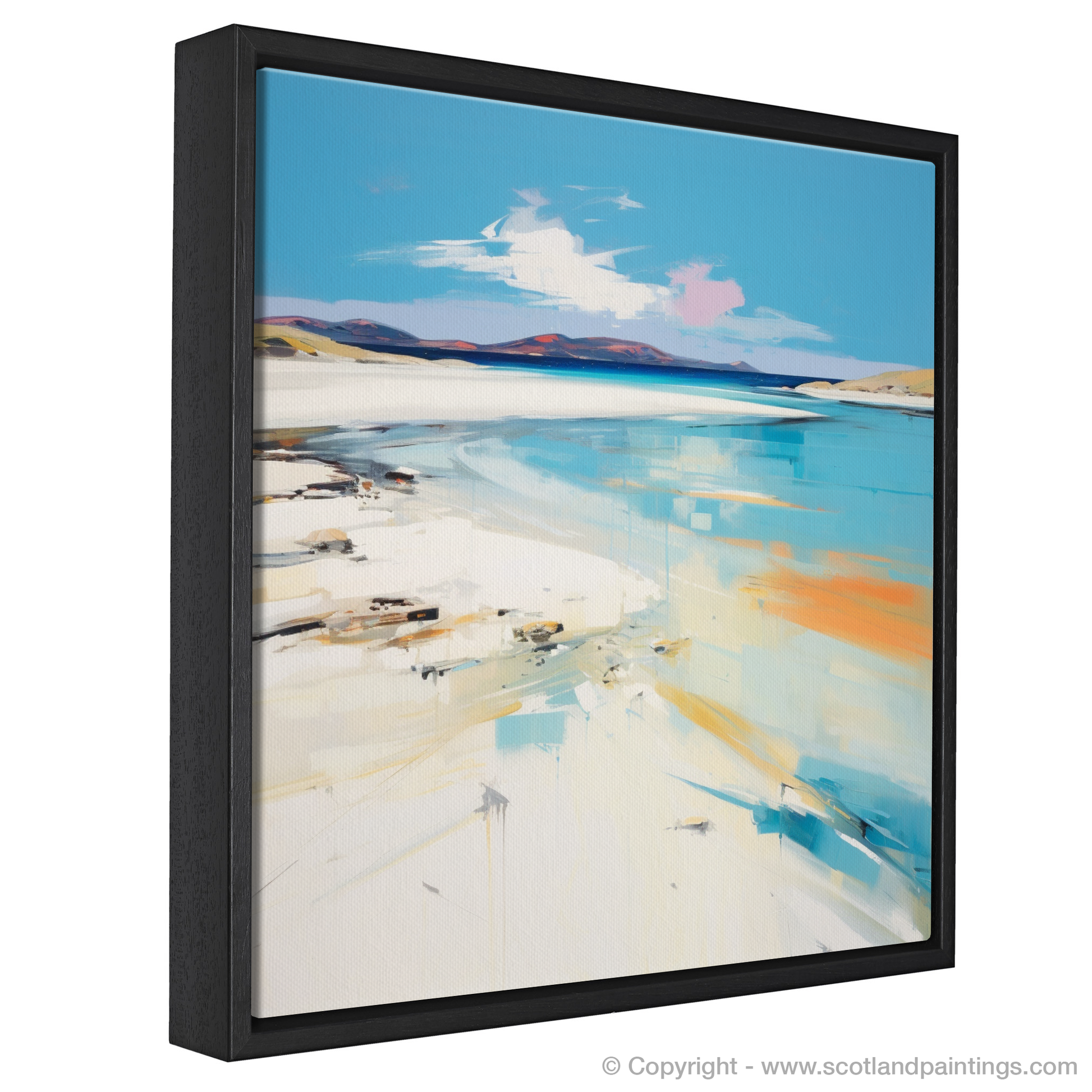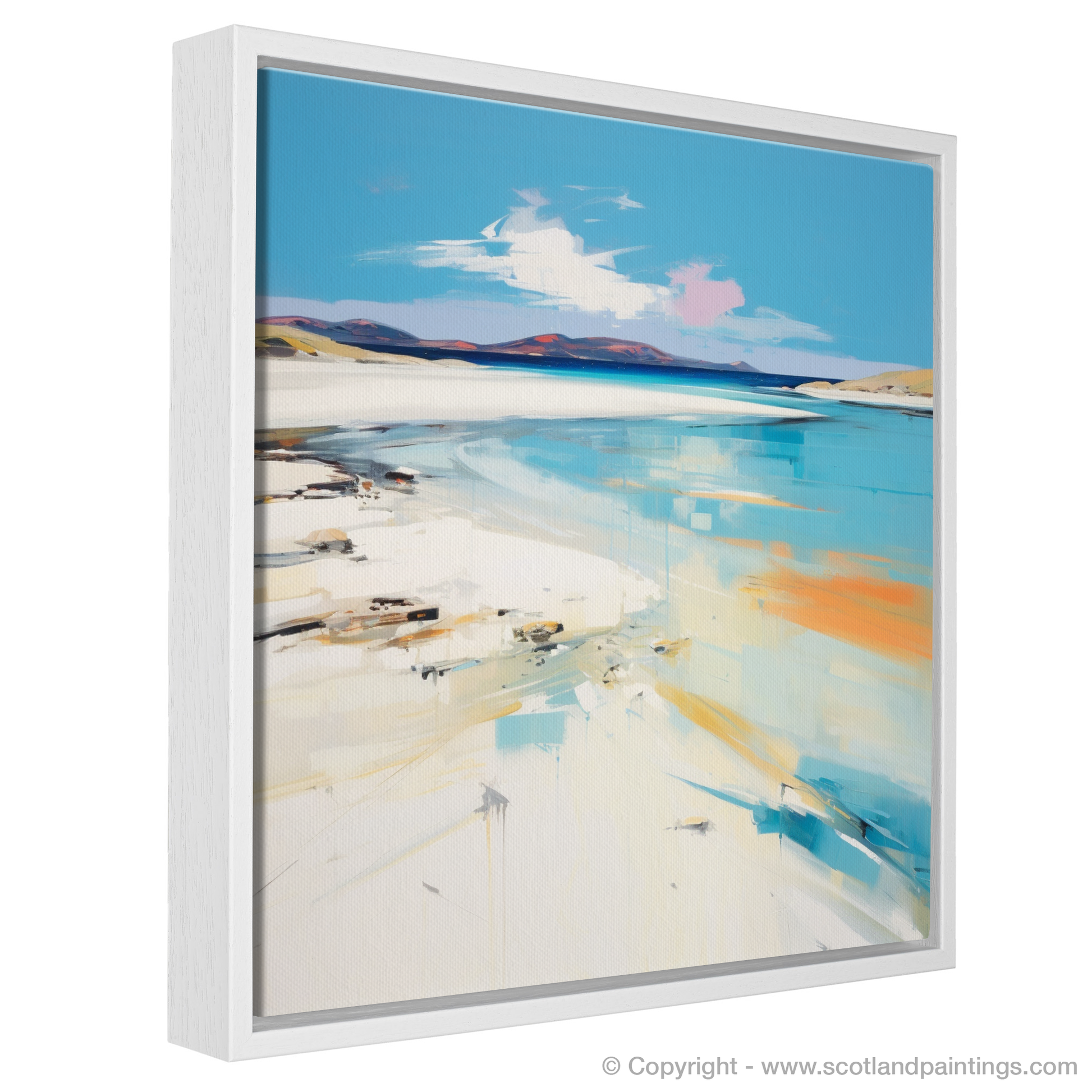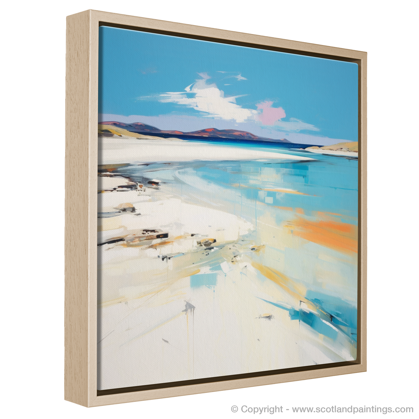 With a harmonious blend of azure and turquoise, the water is portrayed with a dynamic interplay of colour that reflects the pristine quality of the Hebridean sea. Broad, expressive brushstrokes evoke the gentle ebb and flow of the tides, while the pure white sands are illustrated with a freshness that conveys the unspoiled nature of the locale. Subtle hints of warm ochres and delicate peach tones suggest the soft touch of sunlight across the scene, enhancing the tranquil atmosphere.