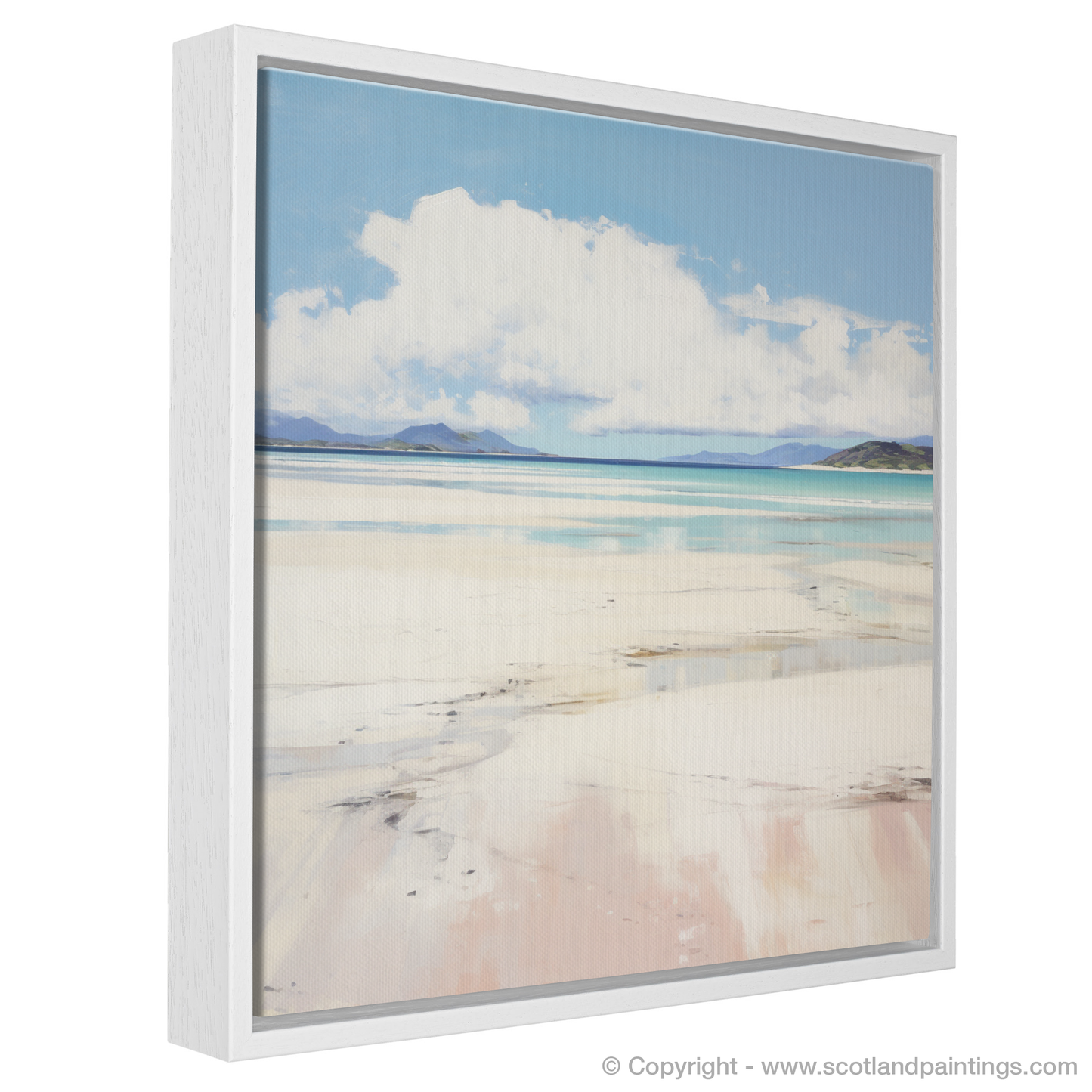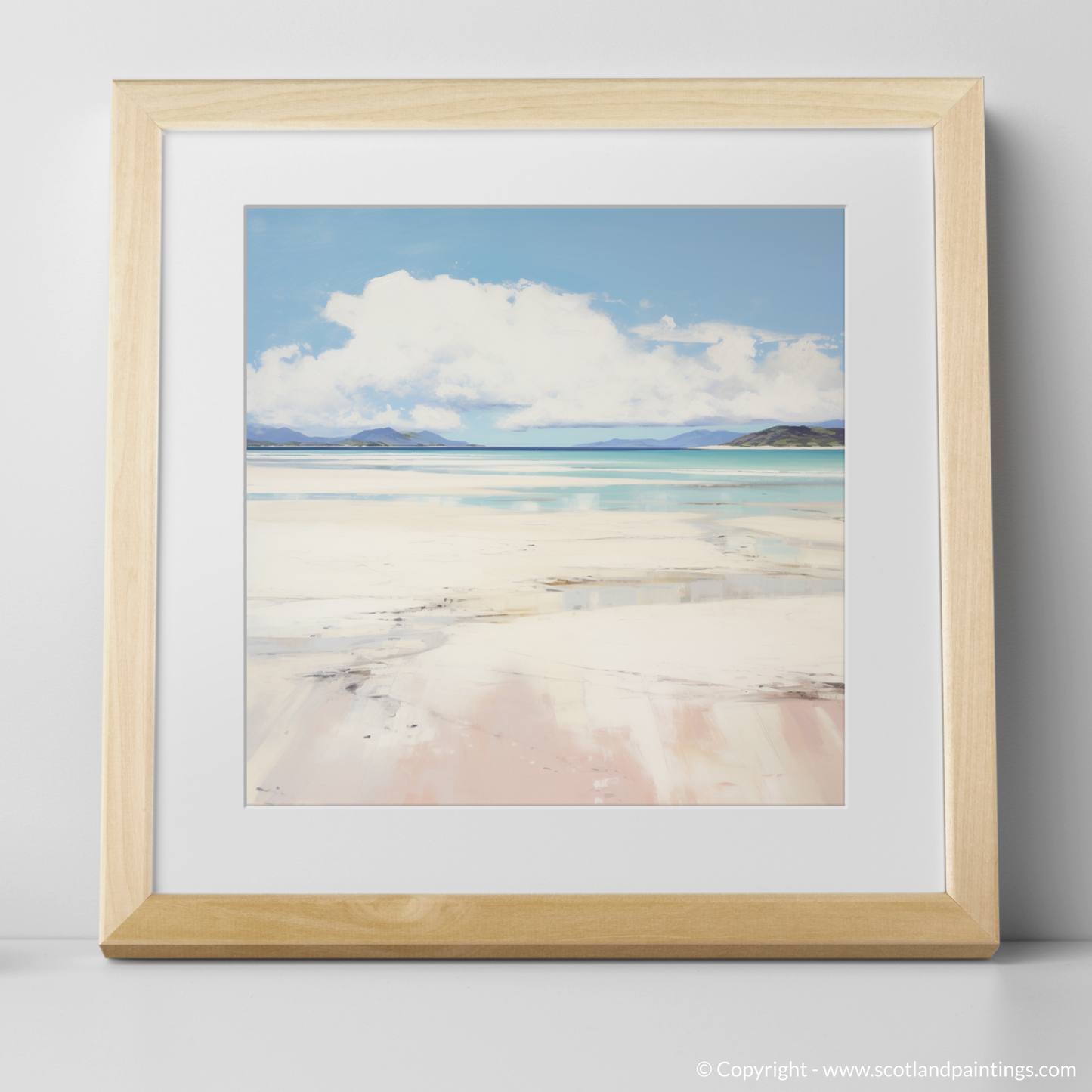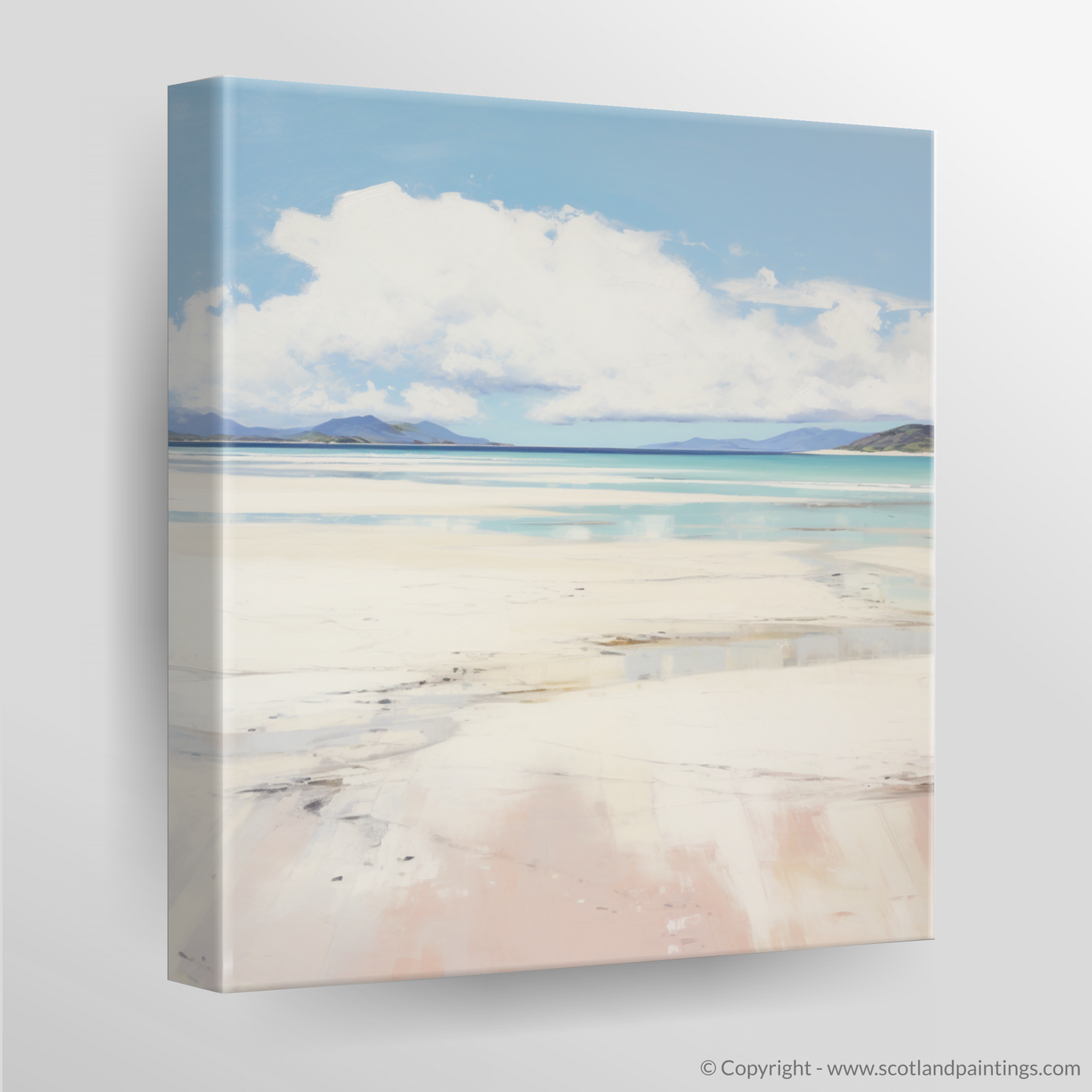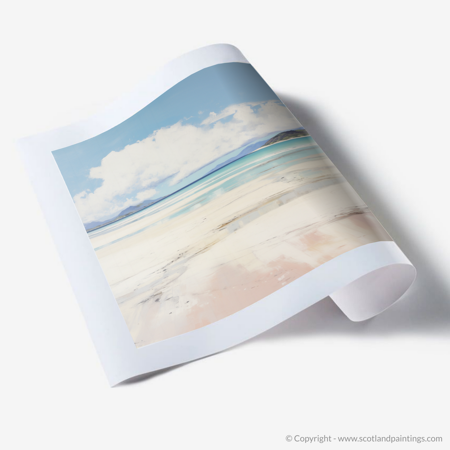 A spectrum of subtle hues embodies the gentle interplay of light and shadow across the beachscape, evoking a sense of calm and contemplation. The delicate blush of the sands, washed by the tide, blends into the soft whites and grays, creating a visual poetry that's both simple and striking. Against the grandeur of the distant mountains, the print preserves a moment of natural splendour, offering a window to the soul of Scotland's rugged coastline.