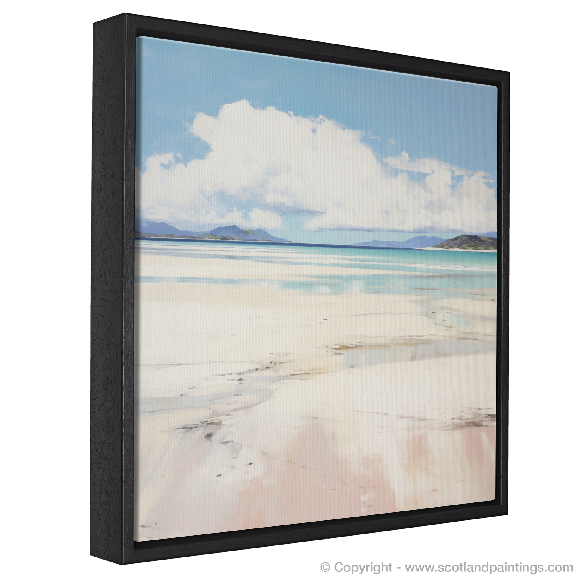 Experience the serene beauty of the Scottish coast with this evocative minimalist print inspired by Camusdarach Beach in Arisaig. With a harmonious balance of colour and space, this piece captures the expansive sky dominated by billowing clouds, the tranquillity of the azure sea, and the pristine white sands that have defined the beach's timeless allure.