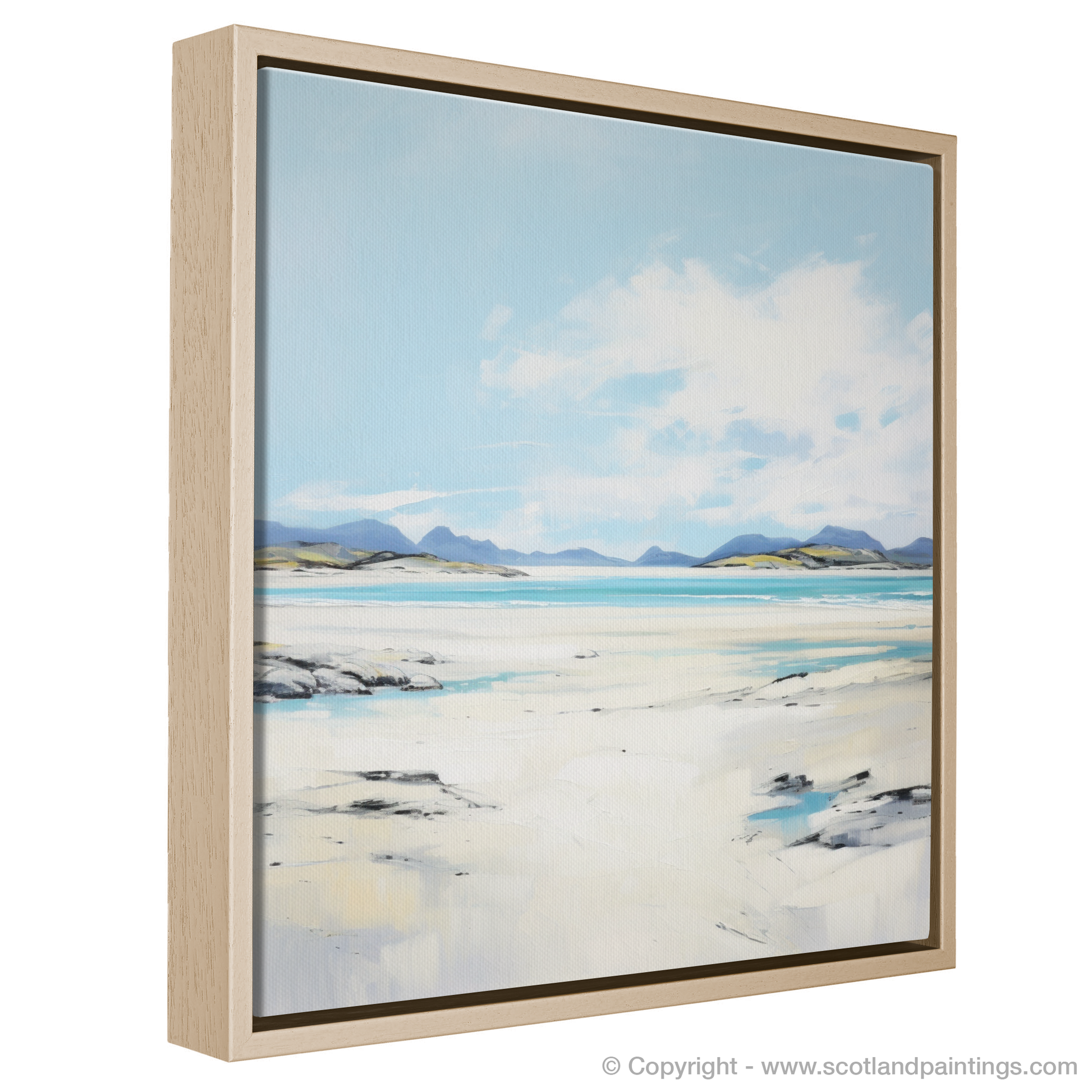 Captured in a serene minimalistic style, this exquisite print presents the tranquil beauty of Camusdarach Beach in Arisaig. With an expansive canvas dominated by soft hues, the artwork invites the viewer to embrace the calmness of the Scottish shoreline. The sands, rendered in a spectrum of whites and subtle greys, stretch towards the horizon, reflecting the gentle light in a dance of understated elegance.