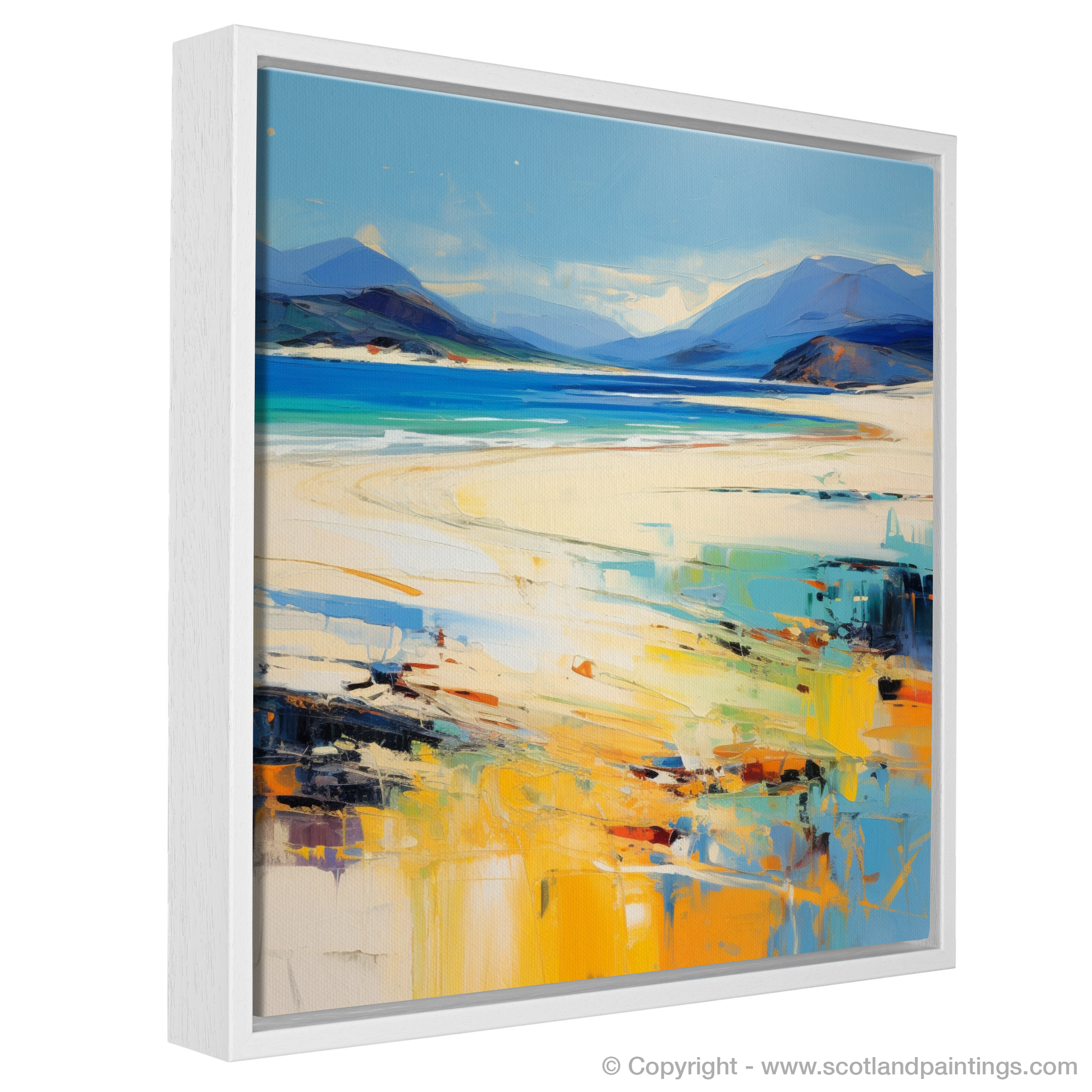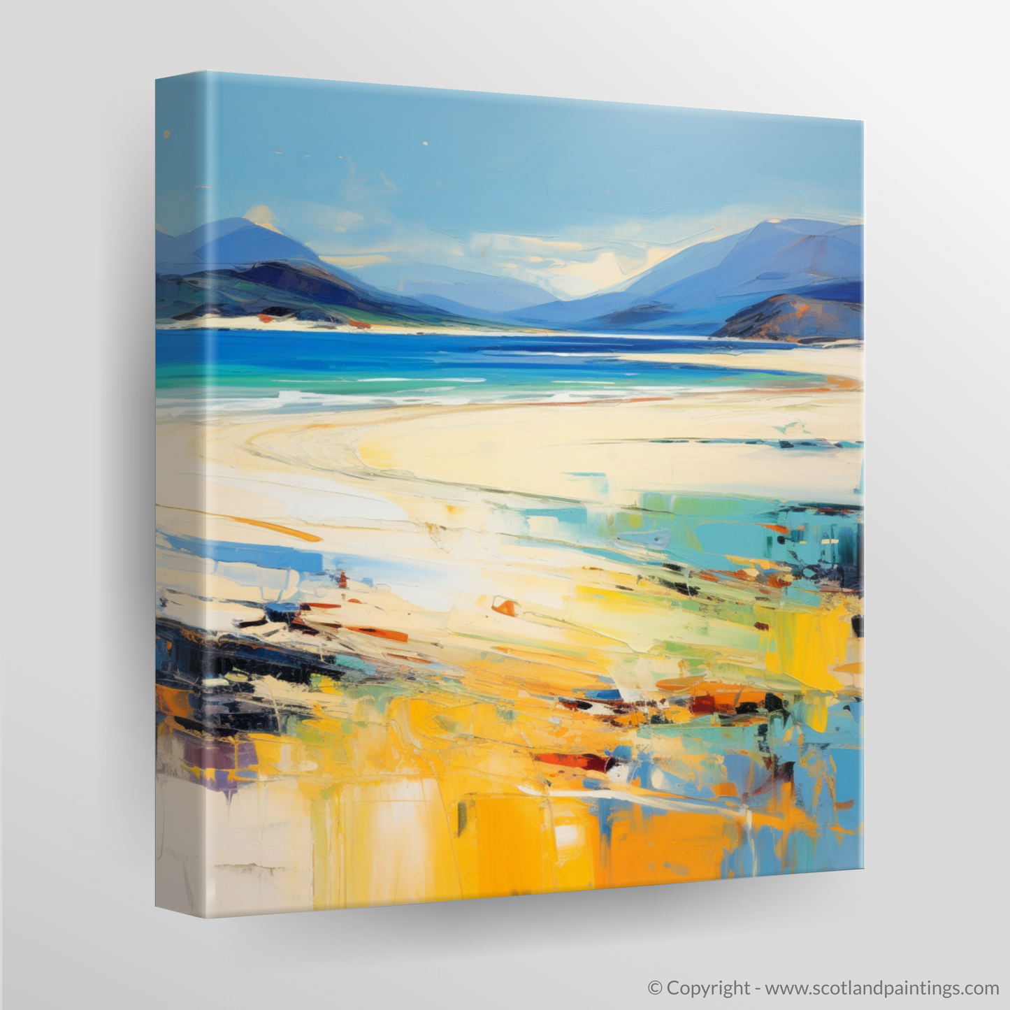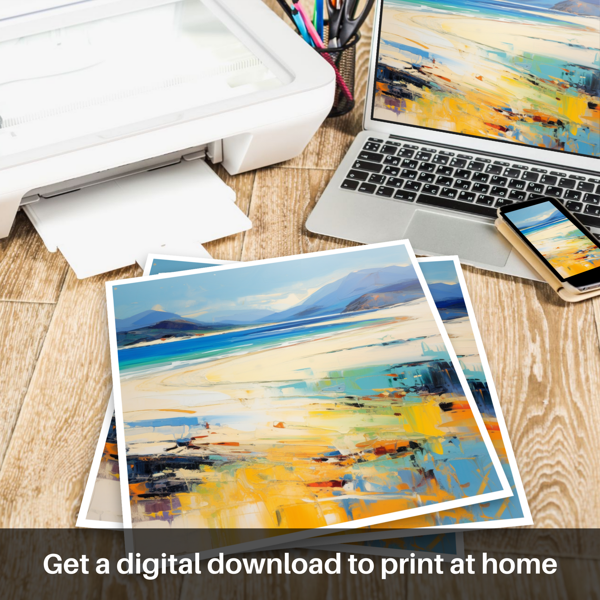 Capturing the essence of the pristine Luskentyre Beach on the Isle of Harris, this splendid print embodies the raw beauty of one of Scotland's most idyllic coastal settings through the dynamic lens of Abstract Expressionism. Broad, evocative brushstrokes in a kaleidoscope of colours suggest the interplay of light and shadow across the expansive sands and undulating dunes.
