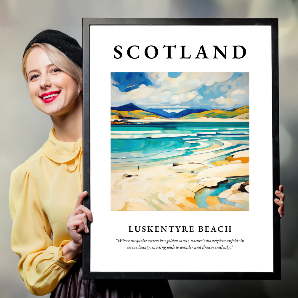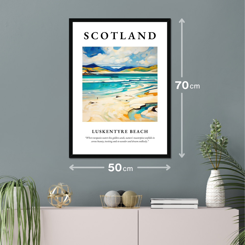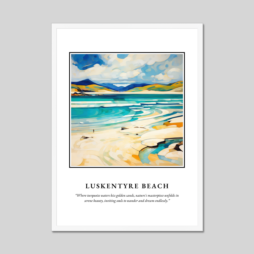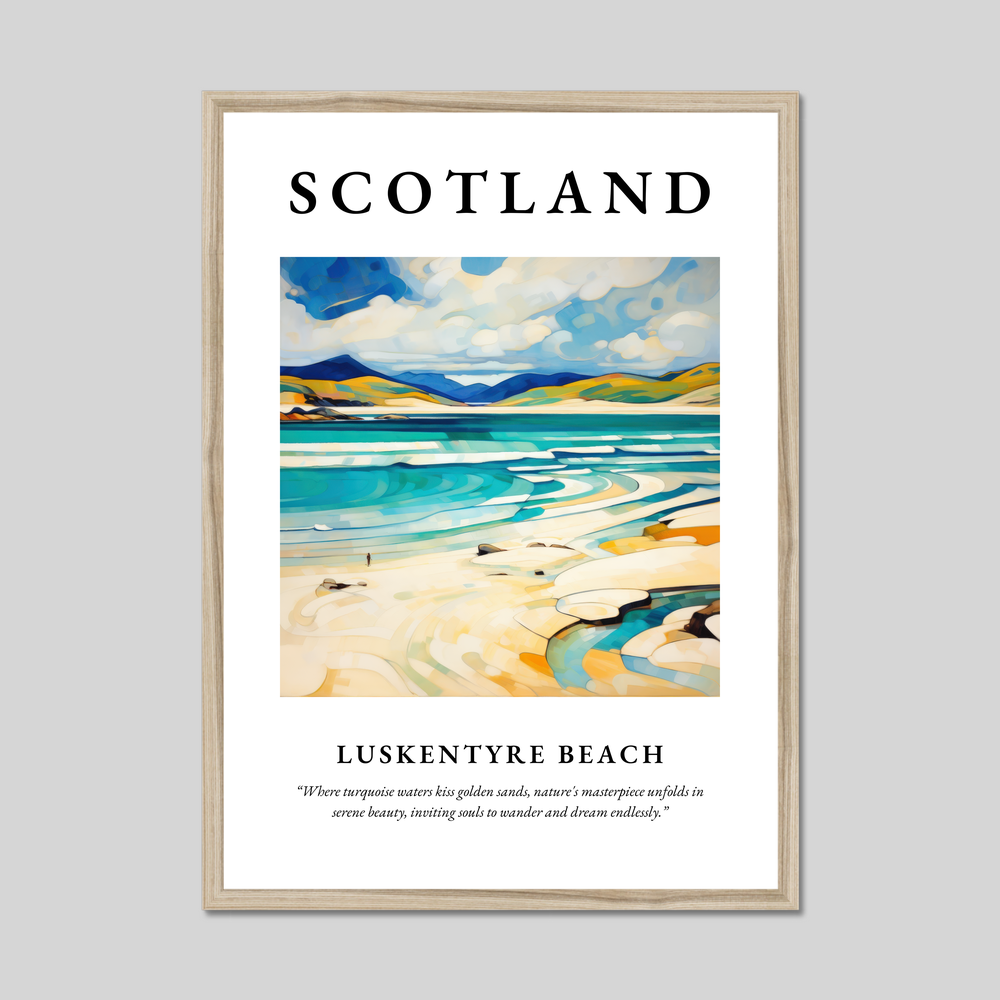 Choose from elegant black, crisp white, or a warm natural wood-effect frame to complement your decor. Displayed in bold lettering, the word "SCOTLAND" crowns the piece, drawing you into the vivid depiction of Luskentyre Beach rendered in an exquisite abstract style. Below the painting, a poetic quote whispers of a place "where turquoise waters kiss golden sands," encapsulating the serene beauty and dreamy allure of the scene.