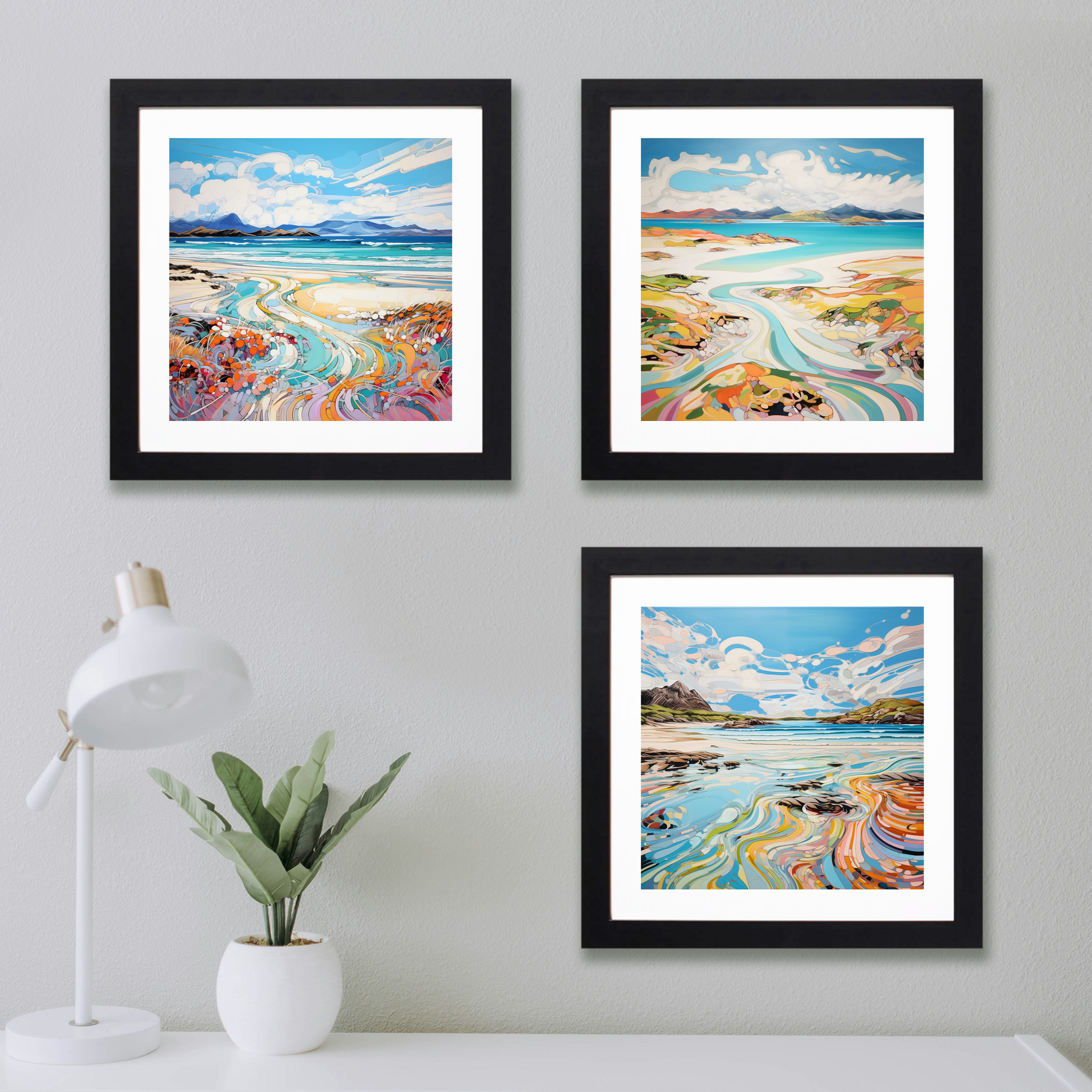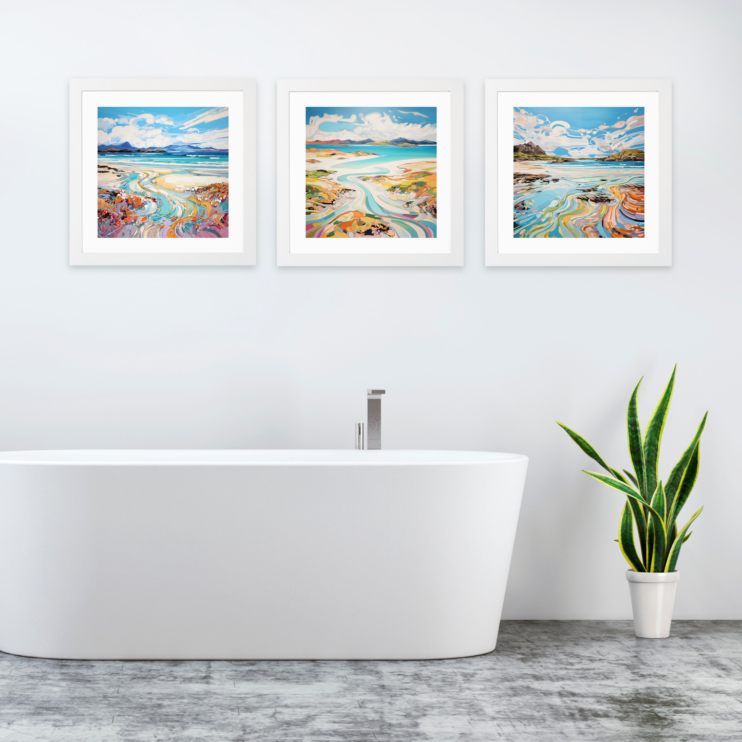The collection is a vivid celebration of coastal charm, showcasing a kaleidoscope of colours that vividly bring to life the sweeping sands, crystal-clear waters, and dynamic skies. Each piece adds a touch of nature's artistry to your home, inviting a serene coastal atmosphere into any room. Whether displayed in your kitchen, above a cosy fireplace, as a calming presence above your bed, or making a statement up a staircase or as part of a gallery wall, this set offers boundless versatility and elegance.