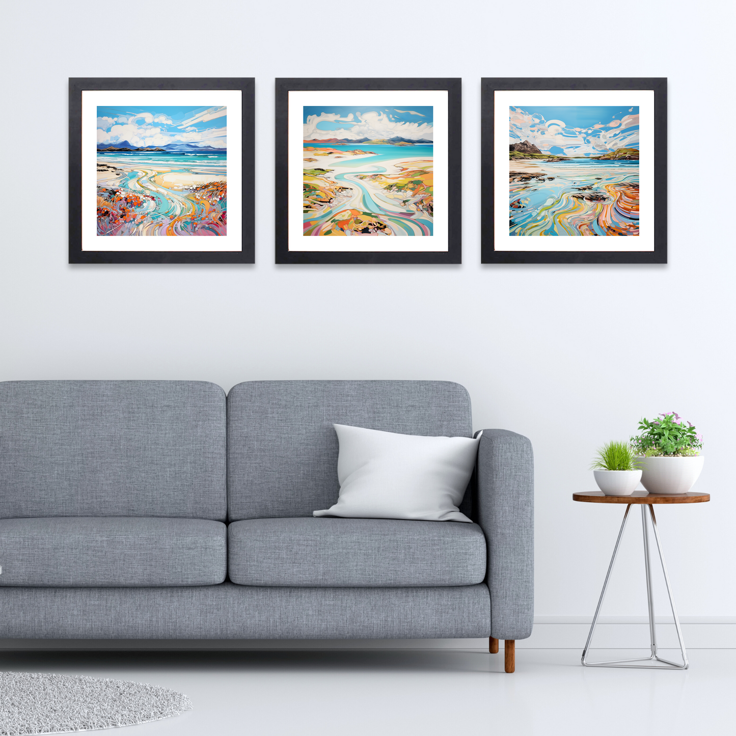 Transform your living space with the tranquil beauty of the Scottish seascape through our exquisite set of three framed prints from the Scottish Beaches Collection, featuring Camusdarach Beach, Arisaig. These stunning prints capture the serene yet vibrant essence of one of Scotland's most picturesque beaches, embodying the harmonious dance of sky, sand, and sea.