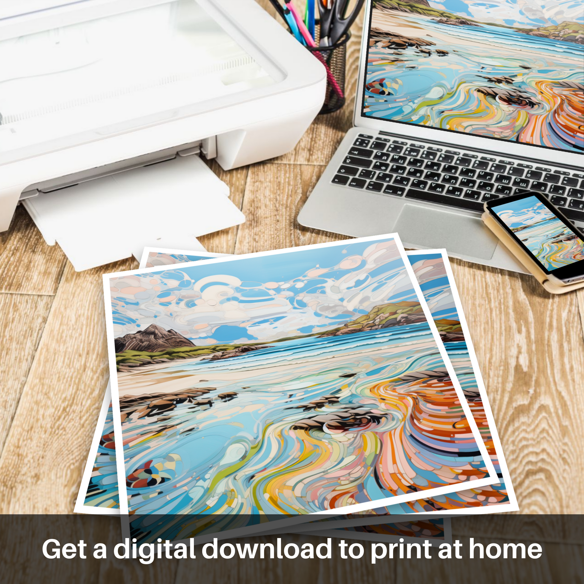 The intersection of land, sea, and sky in this invigorating composition creates a harmonious blend of elements - a testament to the wild and untamed grace of Scotland's coastal landscapes. This print is a tribute to the enchanting vistas of Camusdarach Beach, offering a contemporary and imaginative interpretation that will draw viewers into its mesmerising depths.