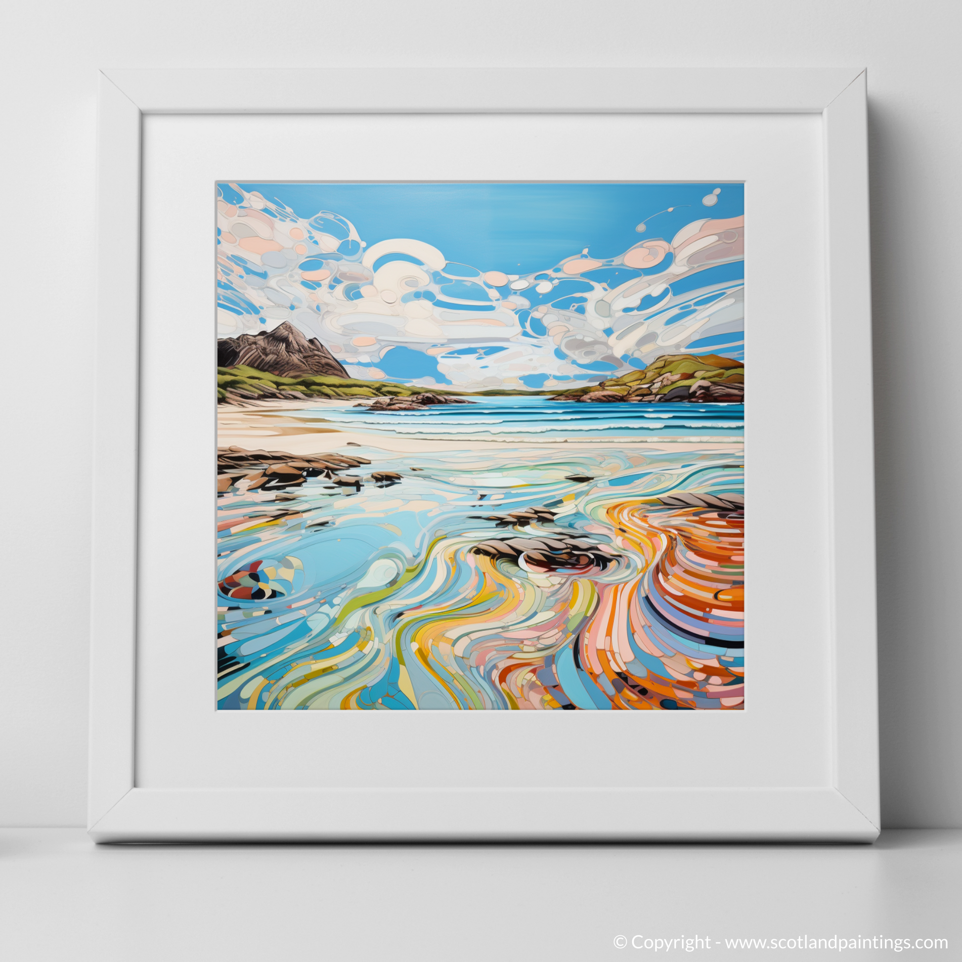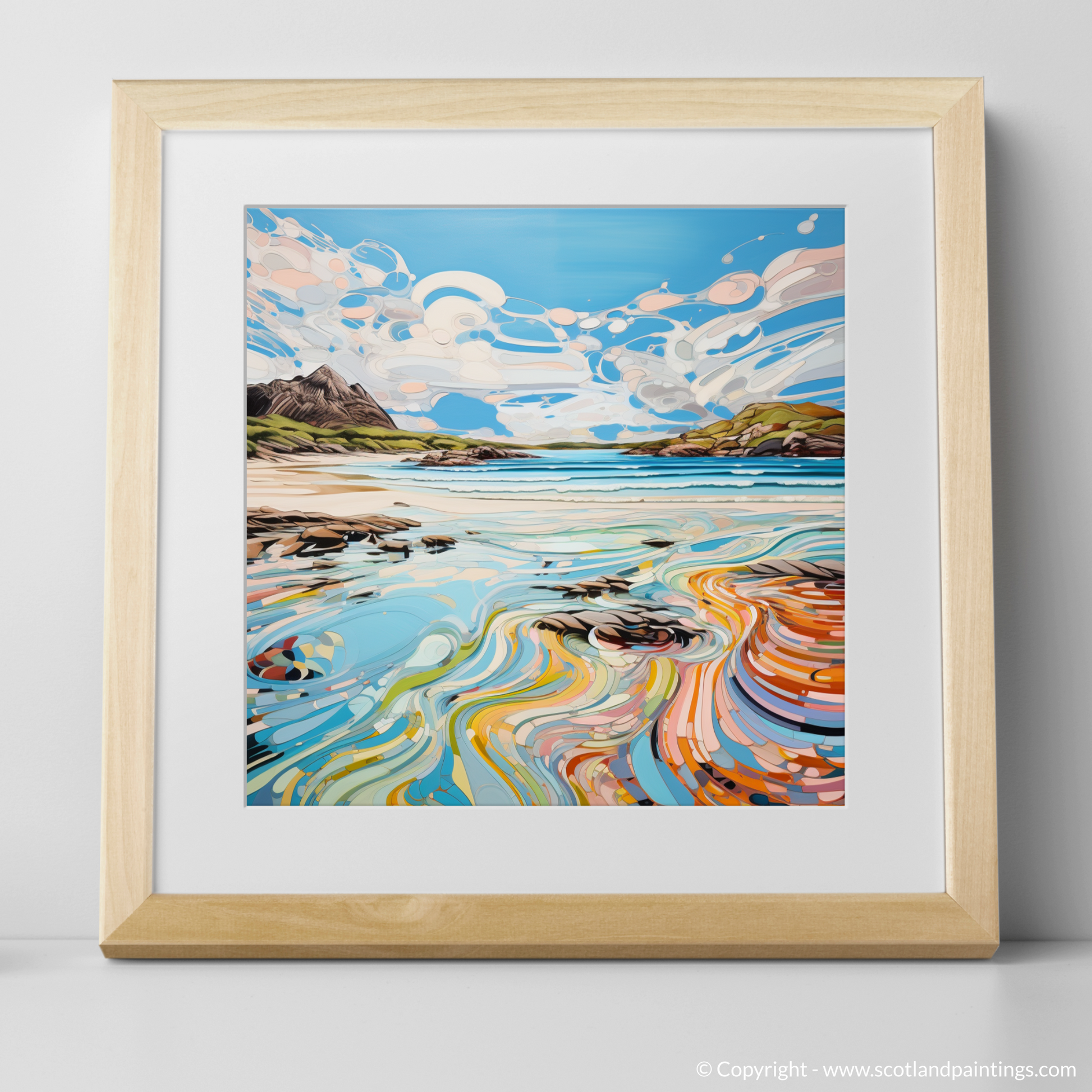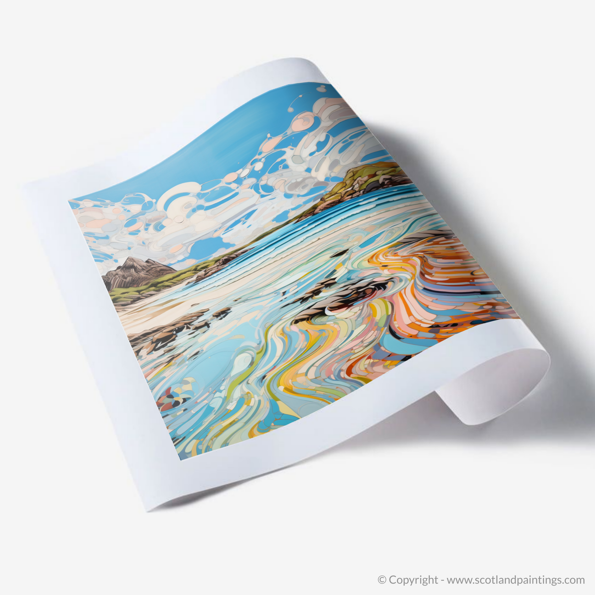 Capturing the ephemeral beauty of Camusdarach Beach in Arisaig, this stirring abstract print invites the viewer into a swirling dance of colour and form. The work features an exuberant blend of azure blues, sandy beiges, and earthy browns that evoke the natural palette of a Scottish shoreline. Dynamic, undulating patterns in the water lead the eye towards a tranquil horizon where calm seas kiss a powder-blue sky.