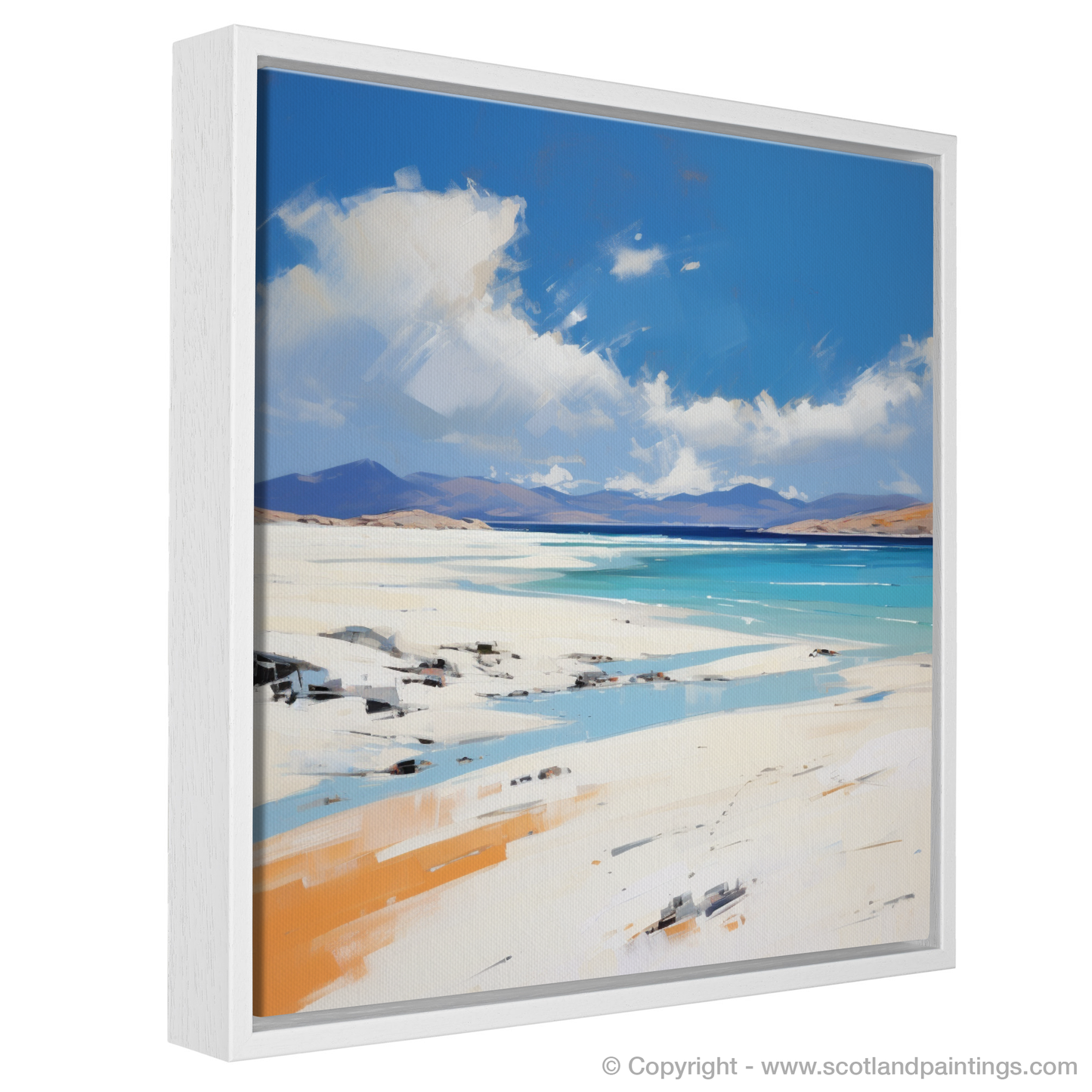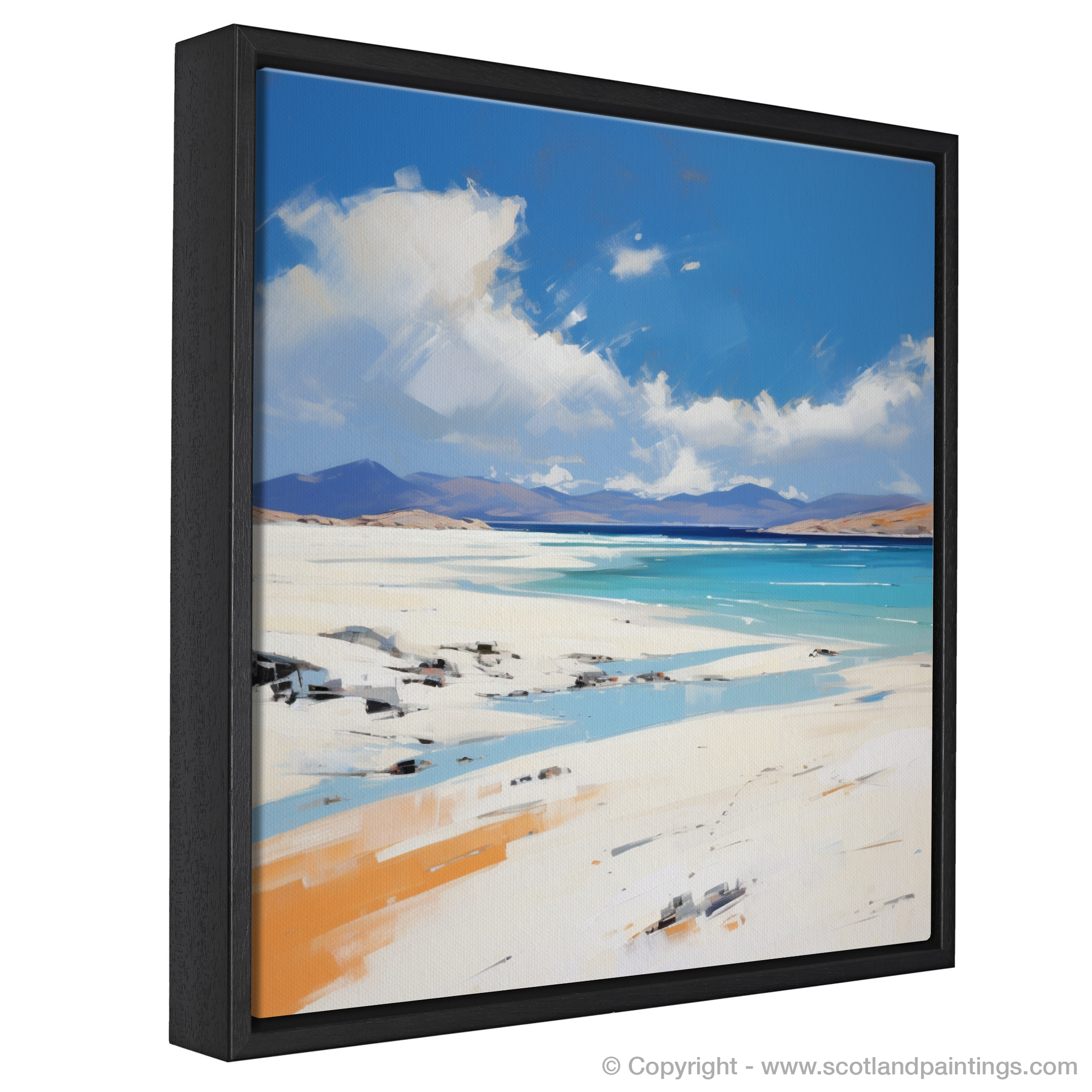 This captivating print captures the essence of the serene Luskentyre Beach on the Isle of Harris with a contemporary flair. The exquisite artwork portrays an expansive view of the shoreline, where the purity of the white sands merges seamlessly with the tranquil turquoise waters. Dynamic brushstrokes in shades of blue, azure, and aquamarine depict the calm sea, suggesting gentle waves that softly lap against the shore.