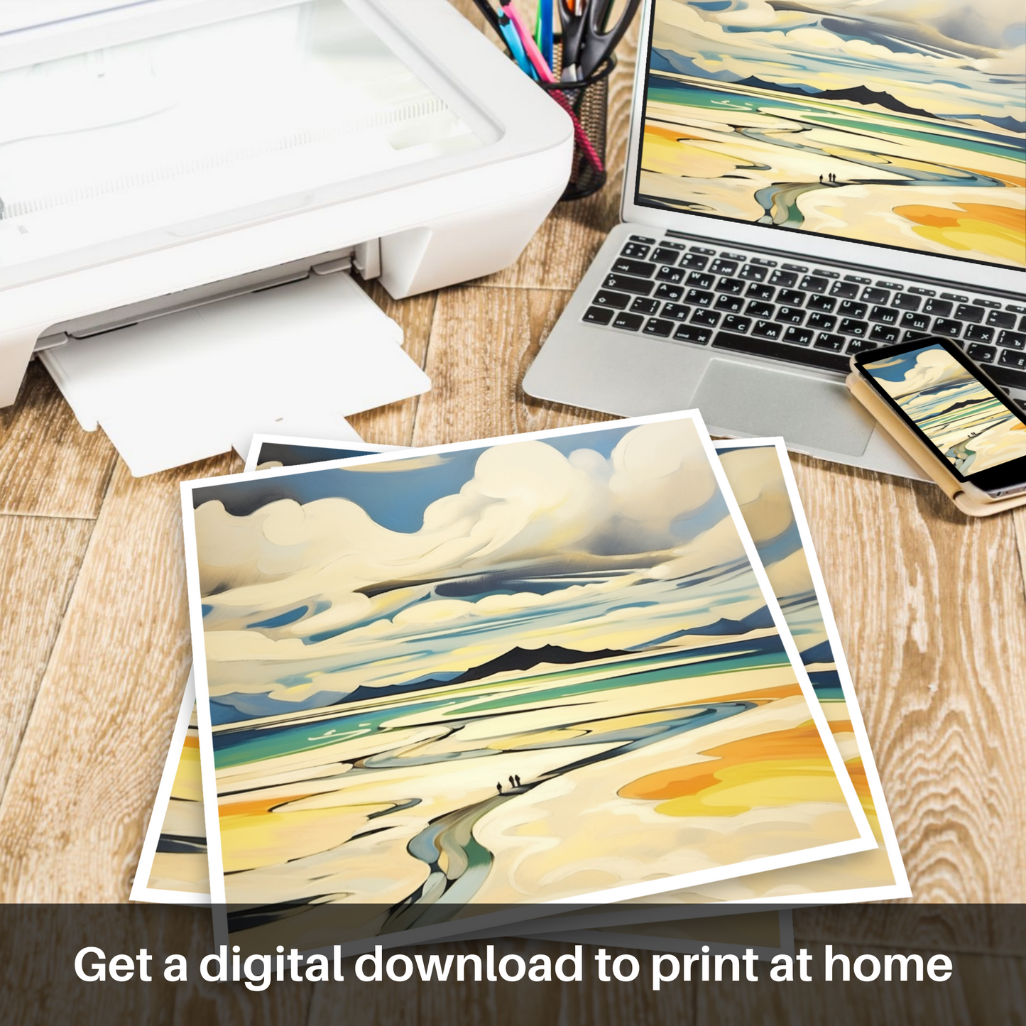 This abstract interpretation of Luskentyre Beach is not just a visual feast but an invitation to ponder the serene and sublime qualities of Scotland's coastal landscapes, creating a piece that would complement any space with its depth and complexity.