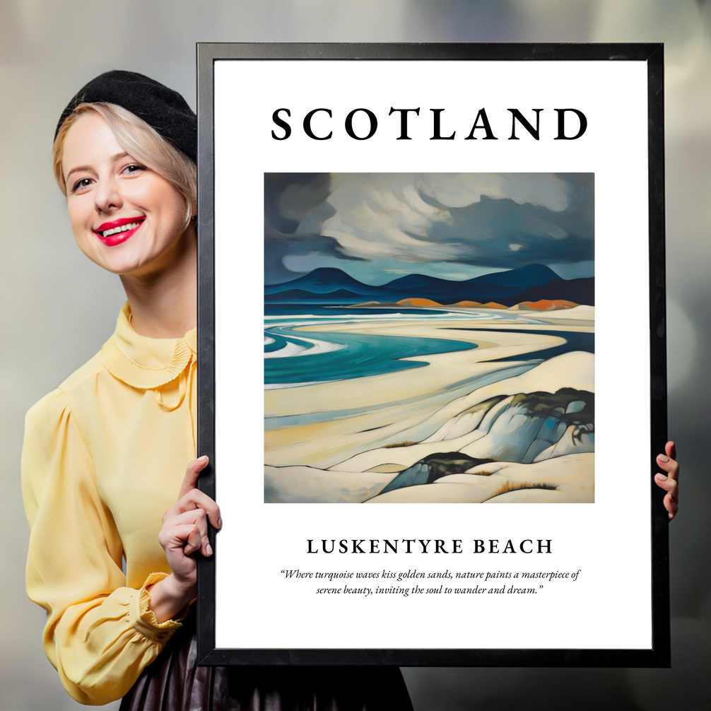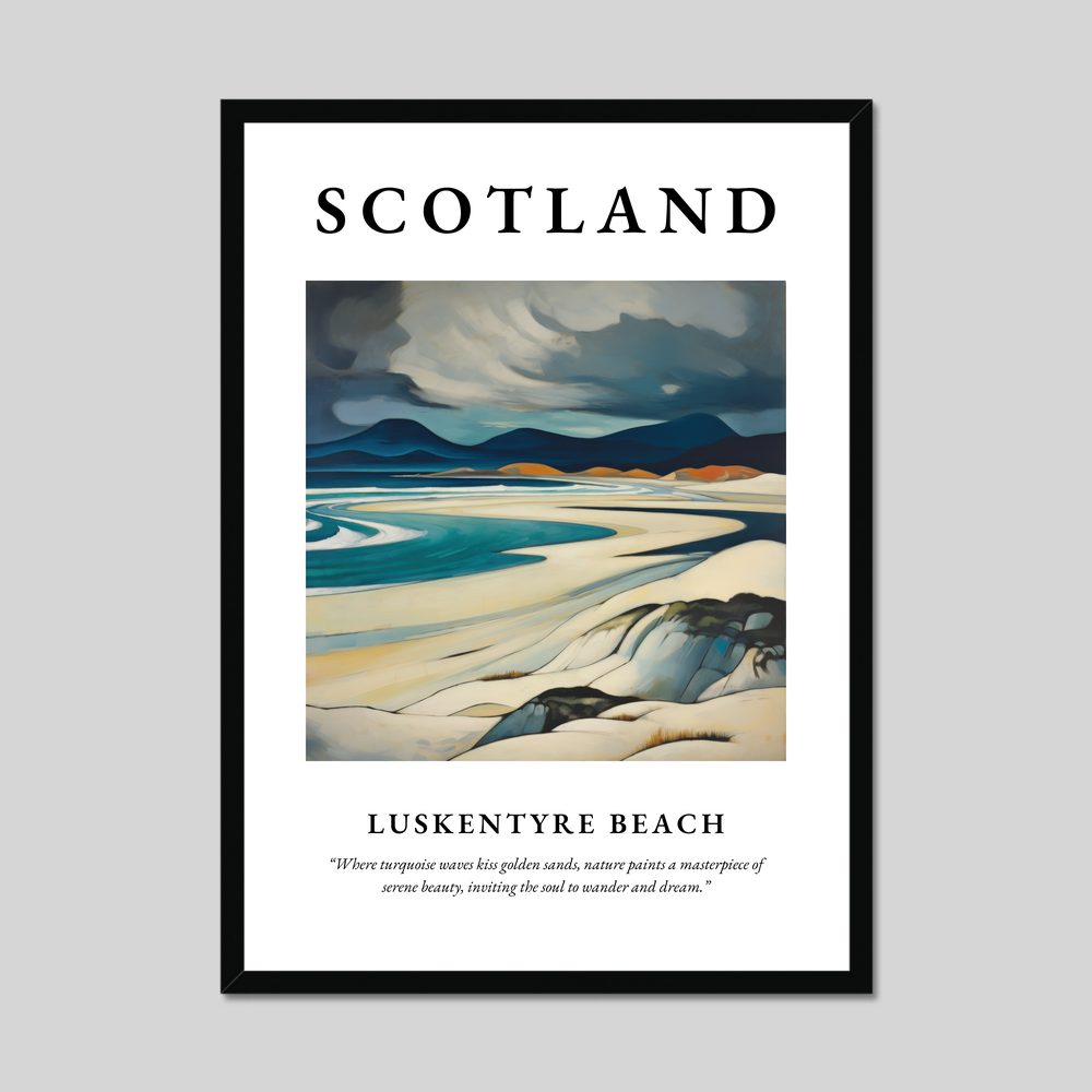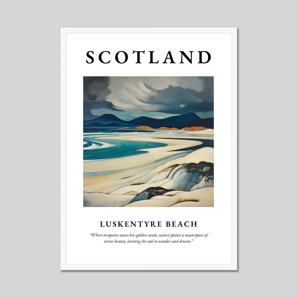 Bring a touch of Scotland’s enchanting beauty into your space with our stunning framed poster print, designed to captivate the hearts of art lovers and Scottish enthusiasts alike. The word "SCOTLAND" graces the top in commanding bold lettering, drawing you into a world where nature's artistry unfolds in abstract style. This large 50cm x 70cm masterpiece features a mesmerizing portrayal of Luskentyre Beach, capturing the swirling dance of turquoise waves and golden sands with an ethereal touch. Beneath this vivid painting lies the poetic quote, “Where turquoise waves kiss golden sands, nature paints a masterpiece of serene beauty, inviting the soul to wander and dream.”