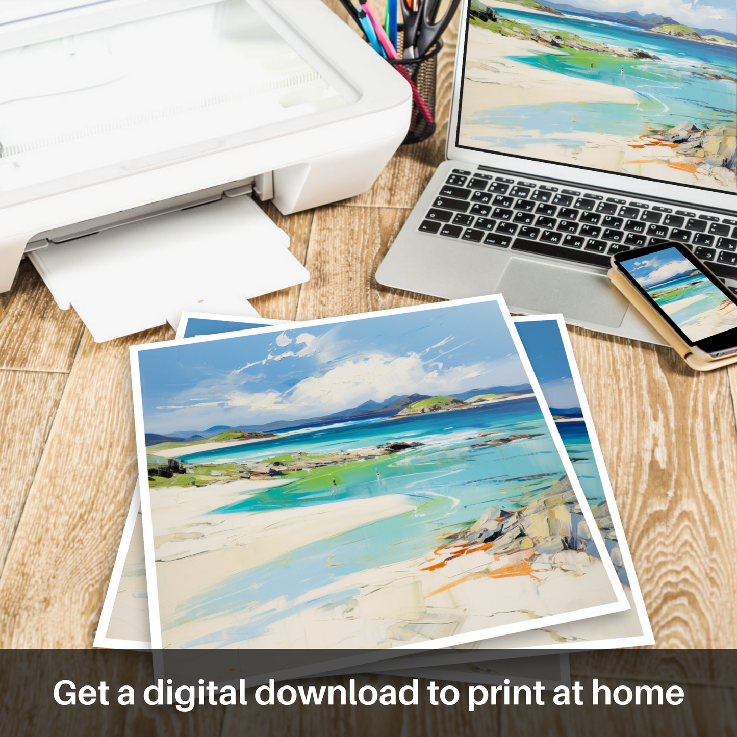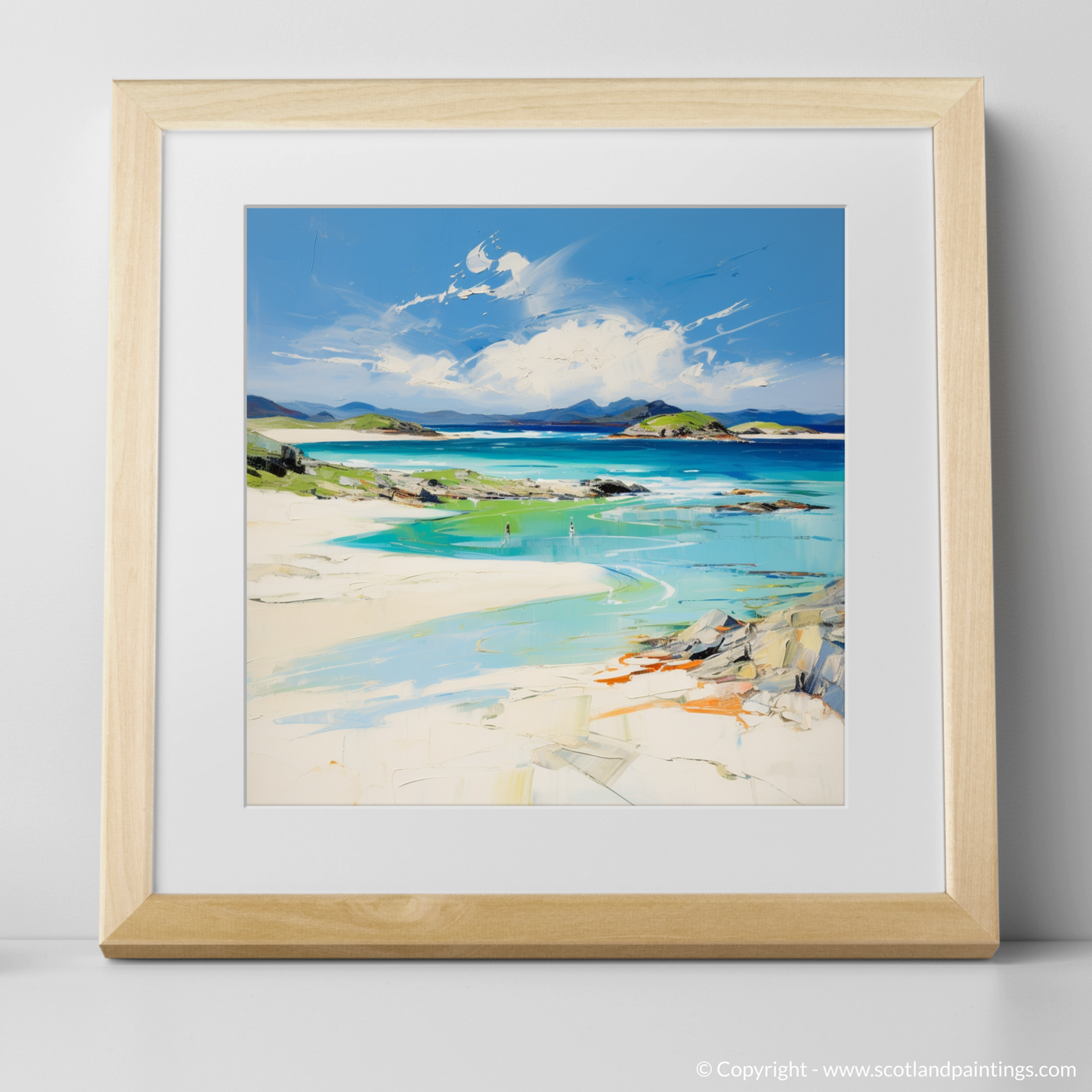 This arresting print invites the viewer to experience the dynamic beauty of Camusdarach Beach, Arisaig, through the lens of Abstract Expressionism. The canvas is alive with the undulating dance of vibrant hues and bold strokes that evoke the wild, unspoilt nature of one of Scotland's most picturesque beaches.