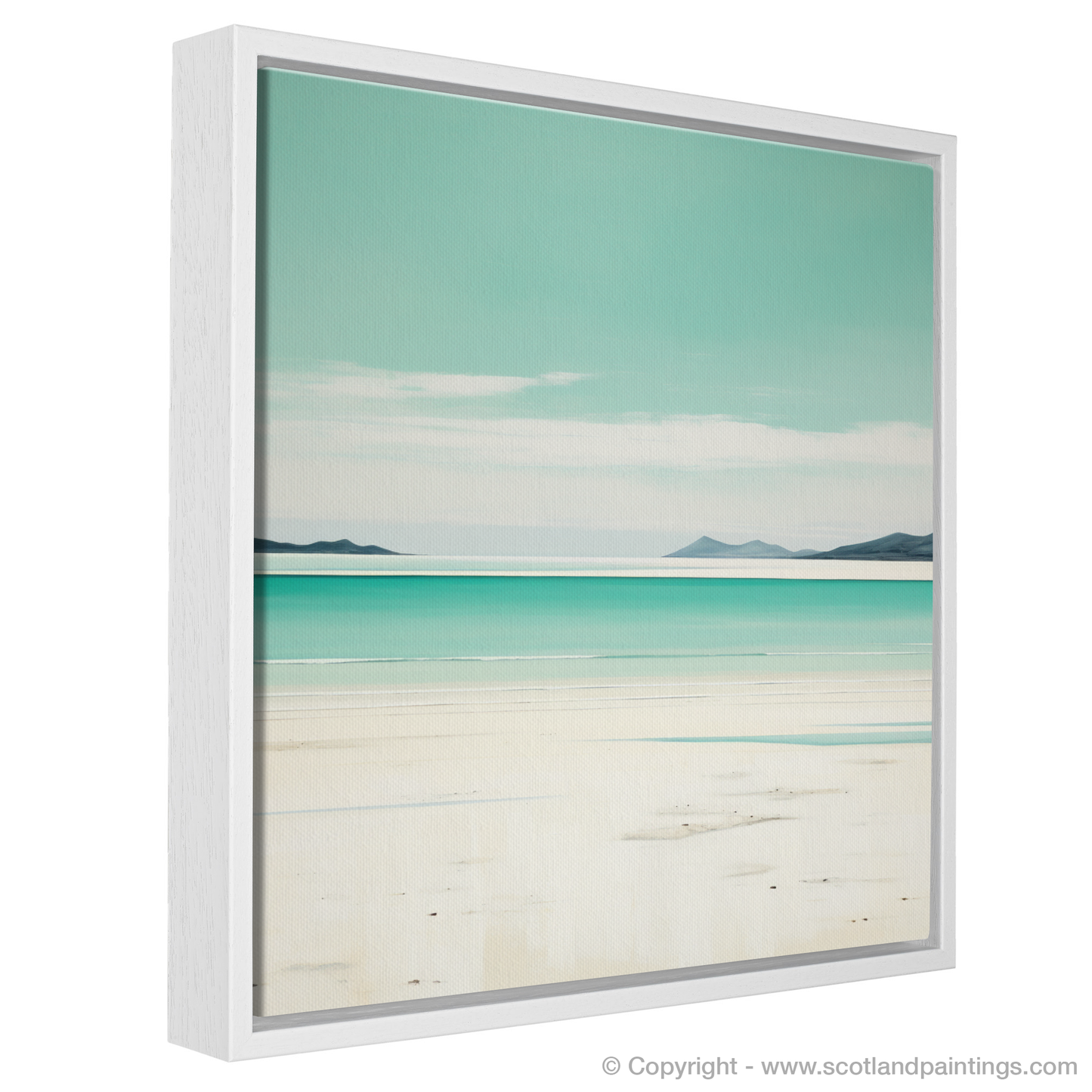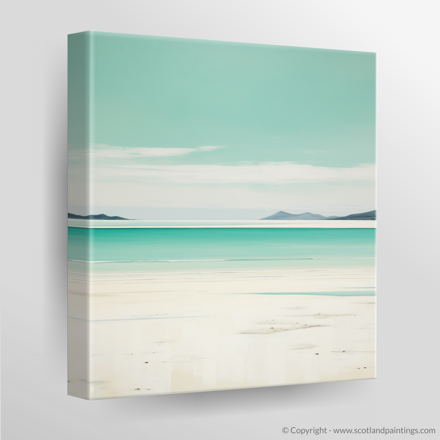 The composition is a symphony of simplicity and calm, using a harmonious palette of soft turquoise, aqua, and gentle cream hues, reflecting the crystal-clear waters and pristine sands of Luskentyre. The horizon line is subtly delineated by a strip of darker turquoise, contrasting sharply with the paler shades of the sky and sea, while the silhouette of distant hills adds depth to the otherwise flat landscape.