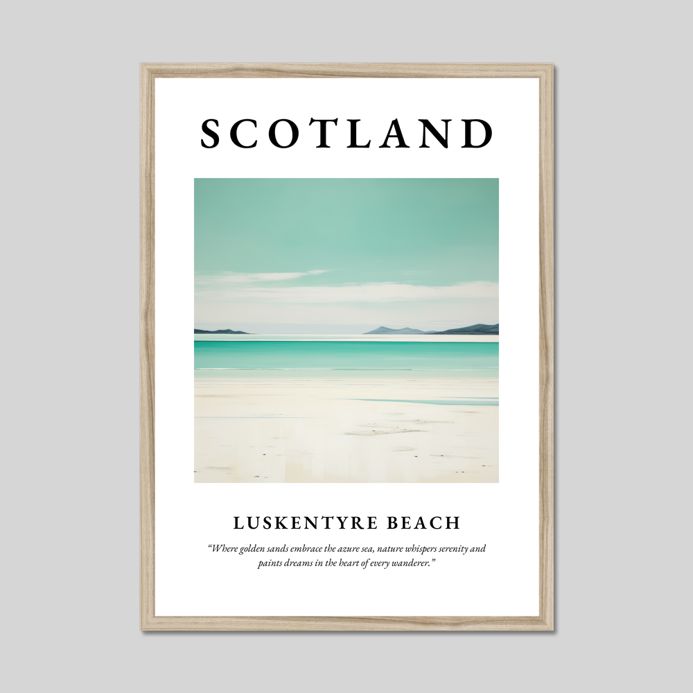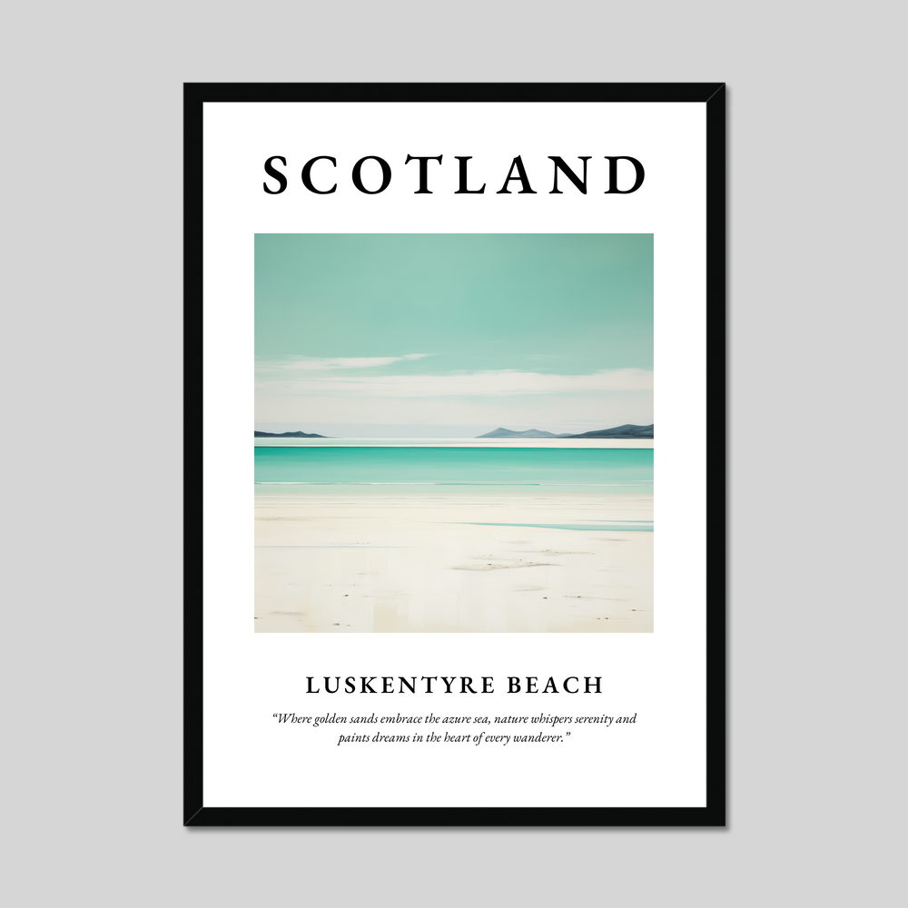 The word “SCOTLAND” proudly crowns the top of the poster in bold lettering, drawing the eye downward to a landscape where golden sands meet the azure sea. Beneath the artwork, the evocative quote captures the essence of this magical place: “Where golden sands embrace the azure sea, nature whispers serenity and paints dreams in the heart of every wanderer.” Choose from three elegant framing options—black, white, or natural wood-effect—to perfectly complement your space.