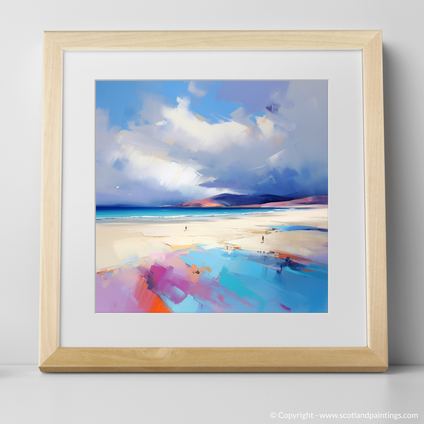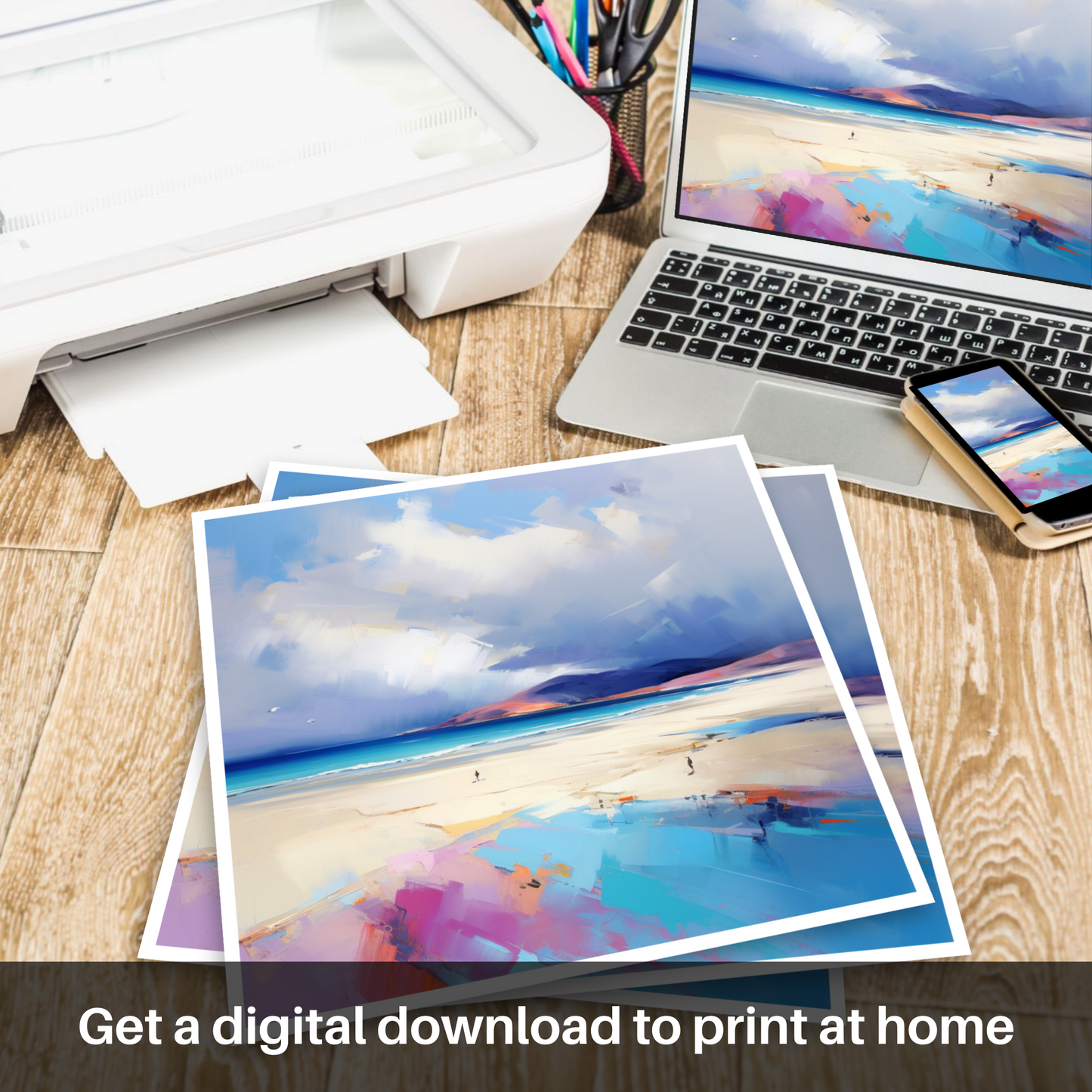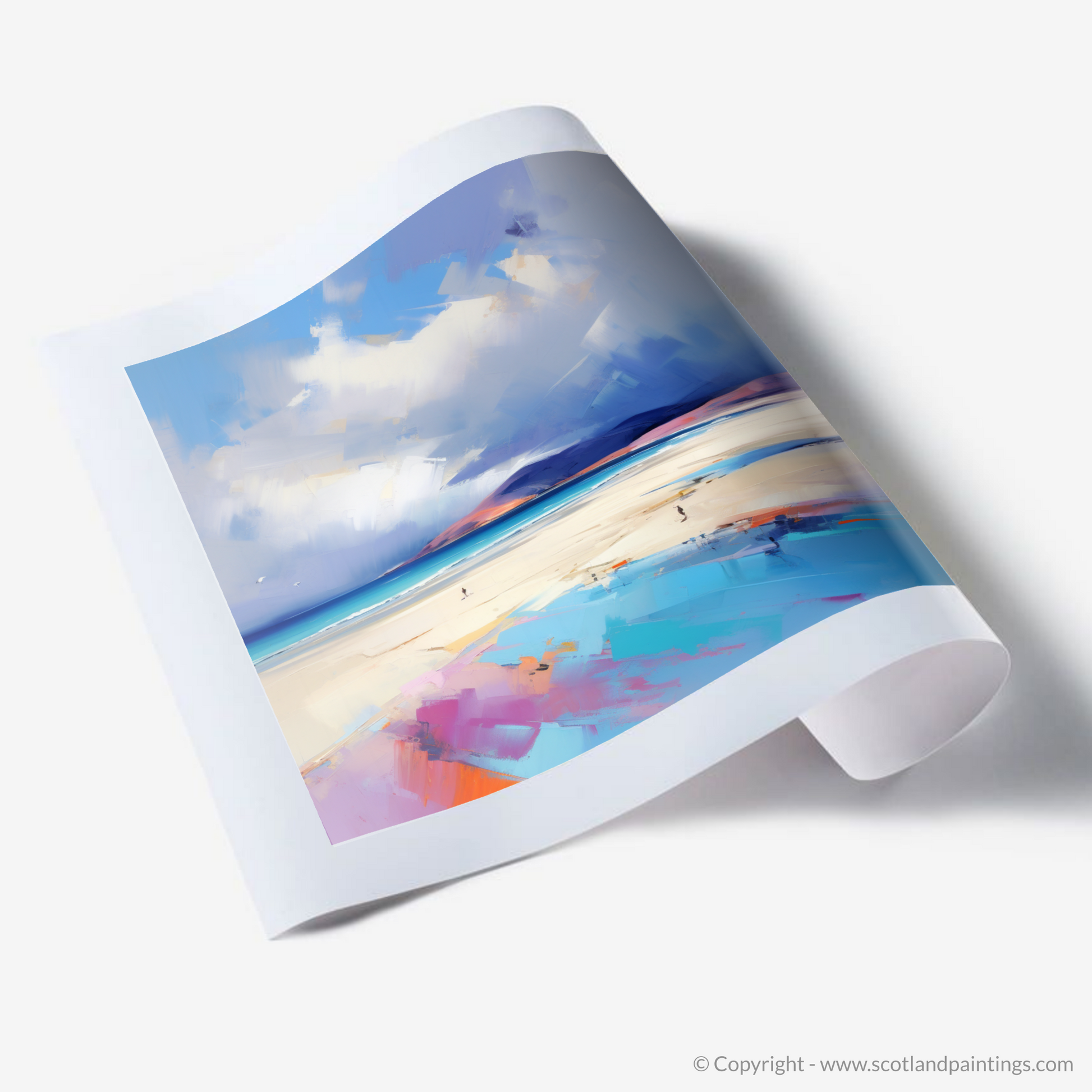 Capturing the serene beauty of Luskentyre Beach on the Isle of Harris, this expressive print is a vibrant homage to one of Scotland's most picturesque coastlines. The artwork vividly portrays the dynamic interplay of light and colour, as bold strokes and a vivid palette convey the wild, untamed energy of the Scottish landscape.