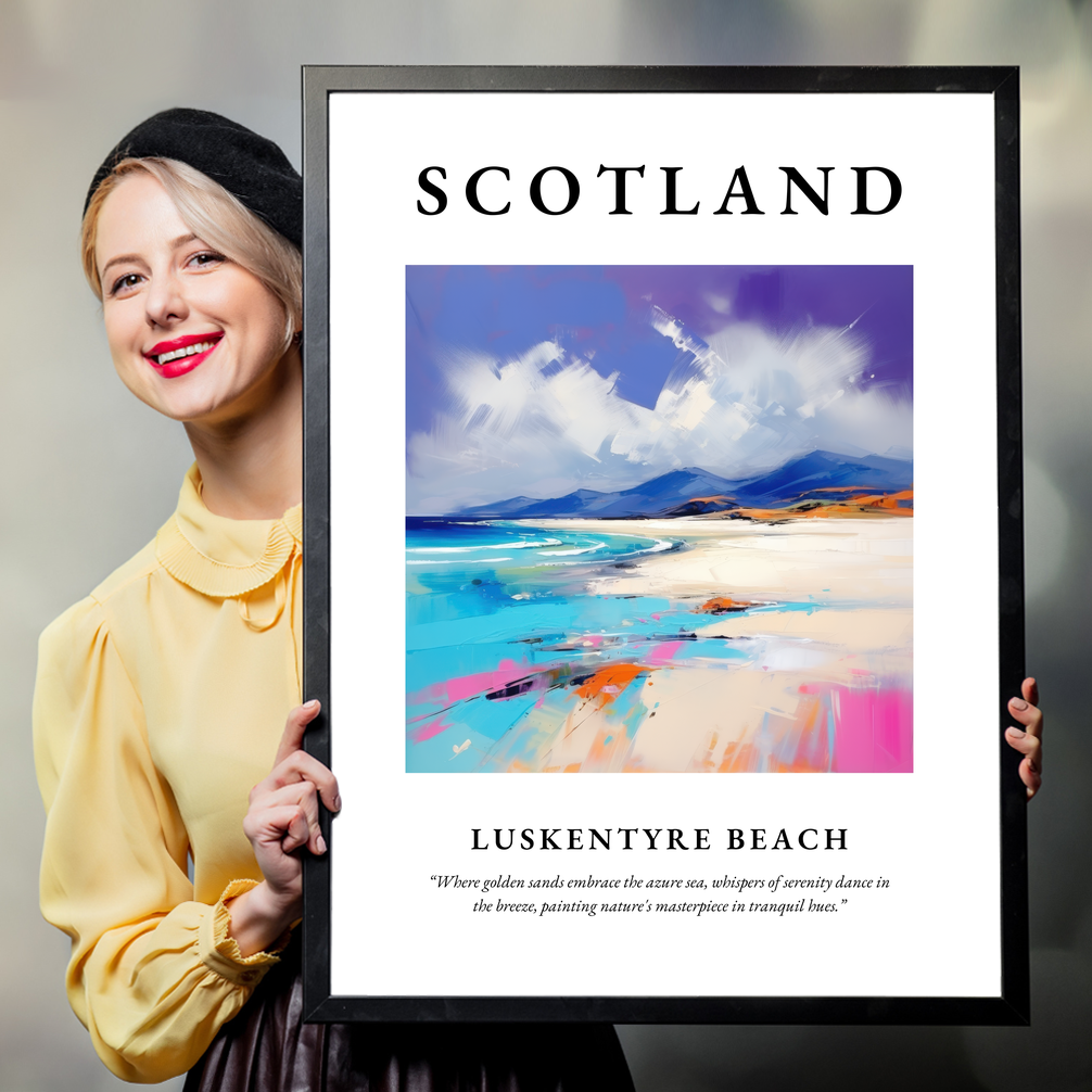 At the heart of this captivating piece is an exquisite expressionist painting that vividly captures the essence of Luskentyre Beach. Bold, sweeping brushstrokes depict the interplay of vibrant azure waters against the soft golden sands, evoking a sense of movement and life. The lush, expressive colours convey an emotional depth, inviting you to feel the whispers of serenity that dance in the gentle breeze. The bold lettering of "SCOTLAND" at the top commands attention, while the poignant quote beneath the painting further enhances the art’s evocative power.