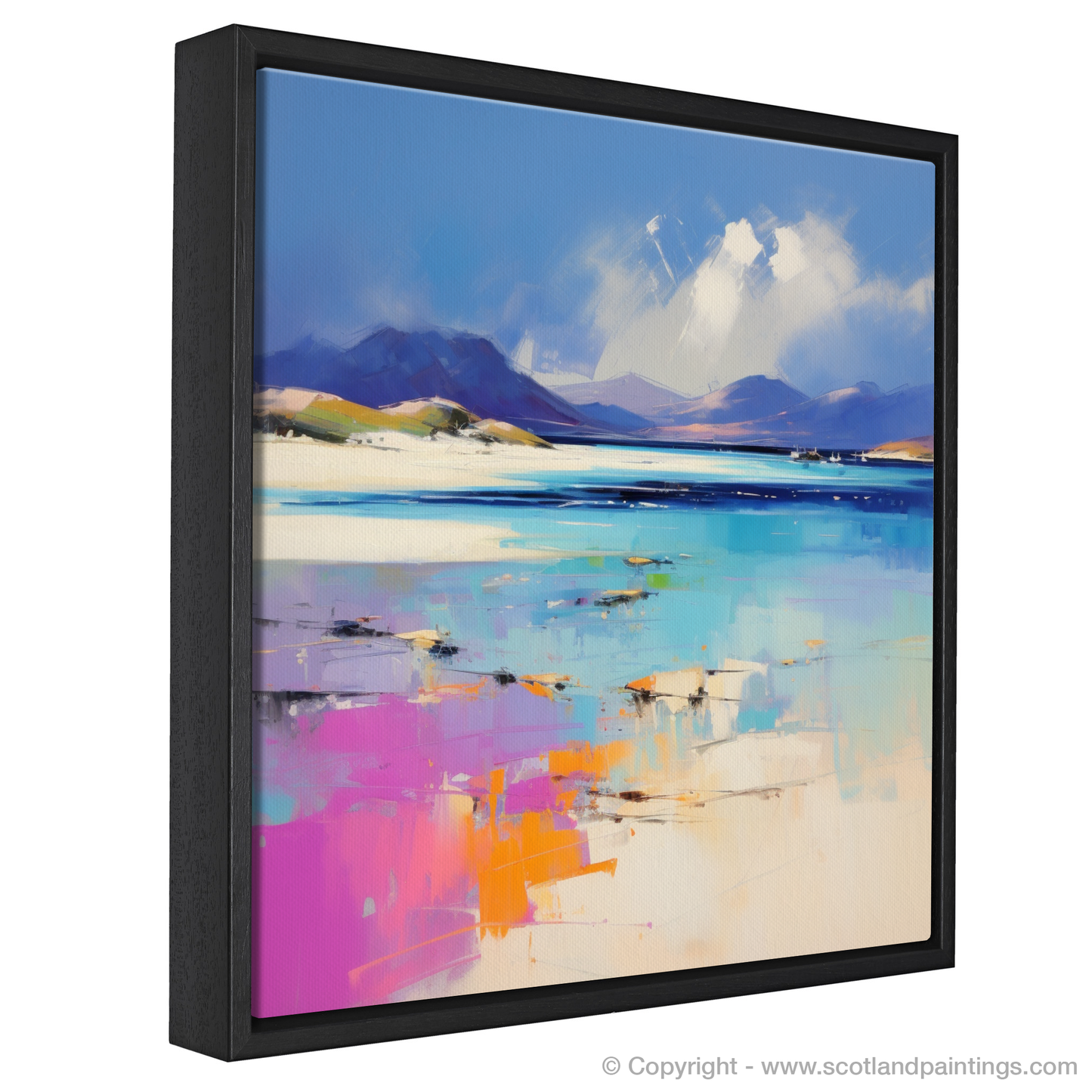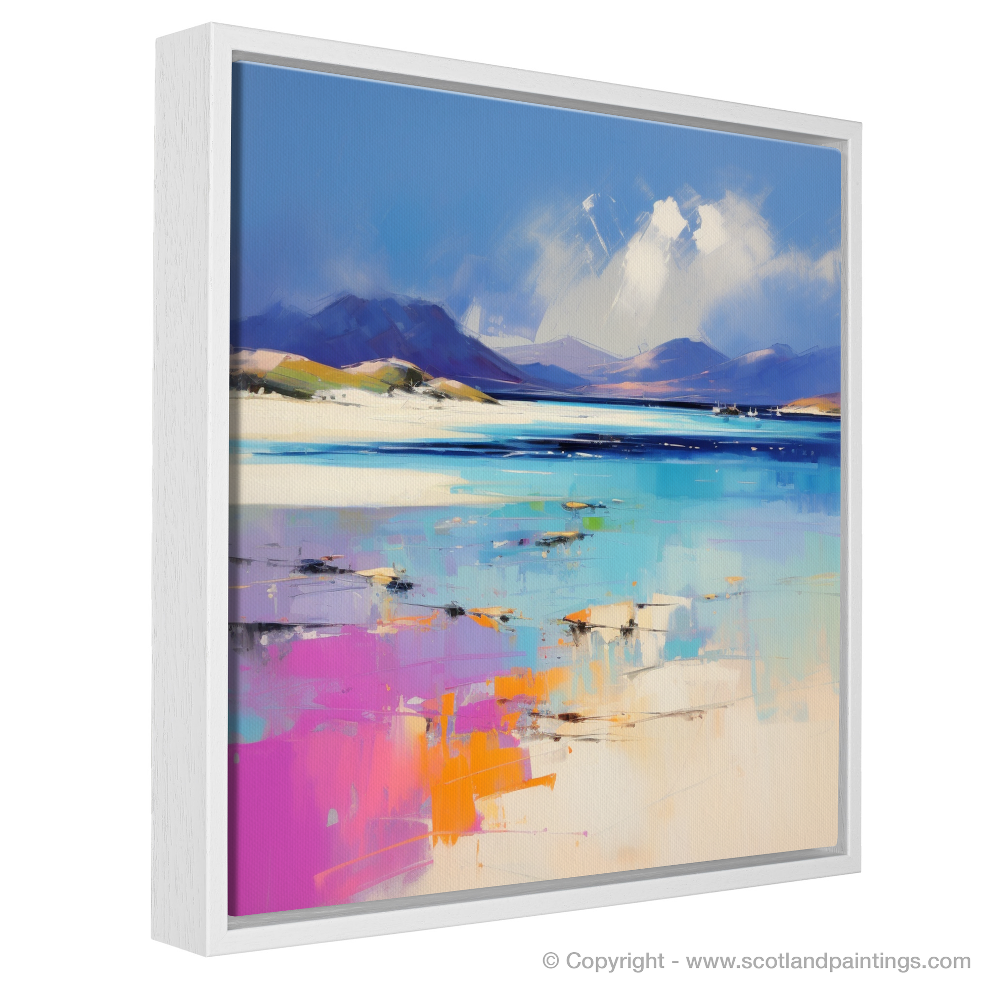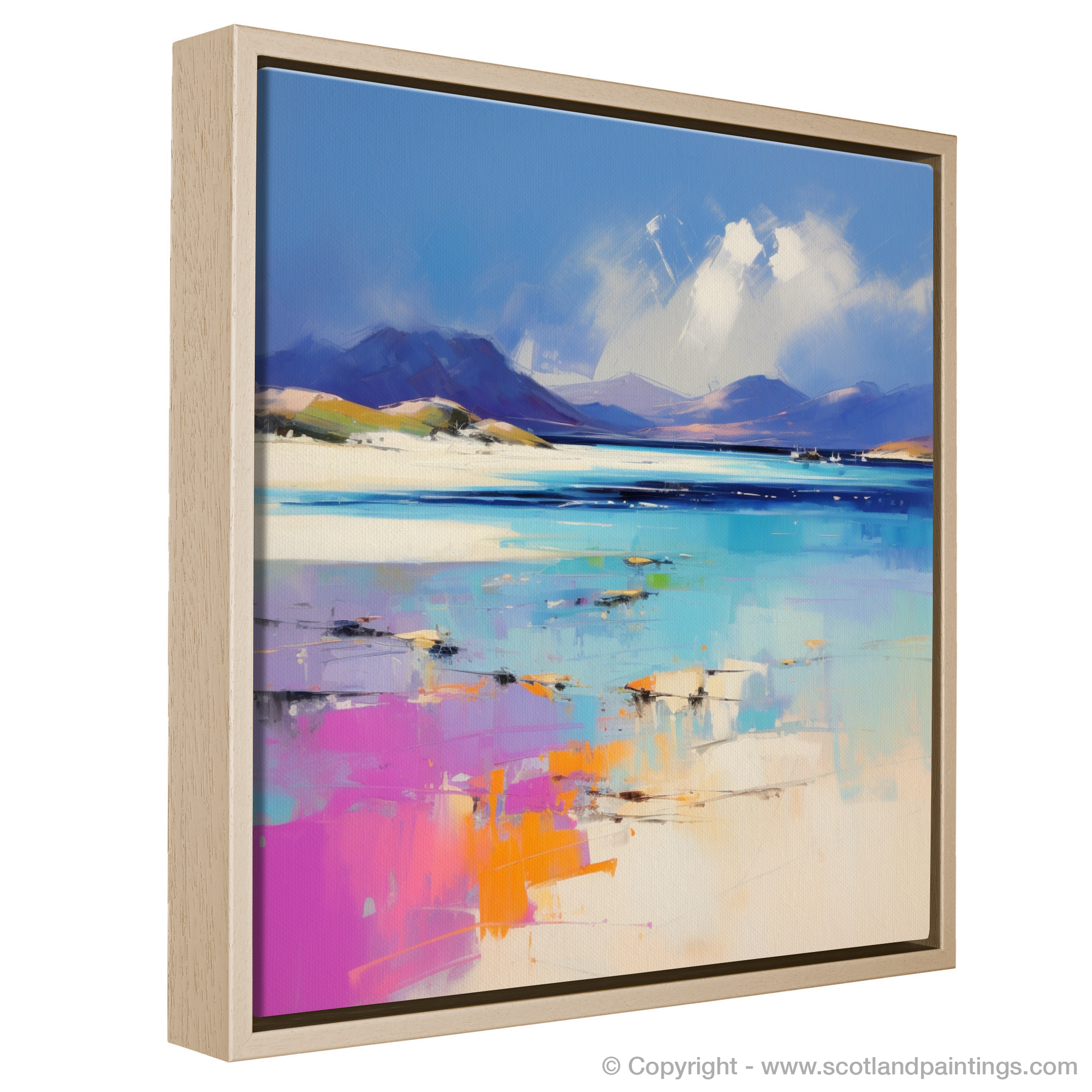 The beach’s iconic white sands are reimagined through a tapestry of creamy whites, muted yellows, and a spectrum of greys, conveying the unique texture of this coastal haven. Vivid magenta and tangerine hues inject an invigorating warmth into the scene, reminiscent of the glint of sunlight on the water during a rare Hebridean summer's day.