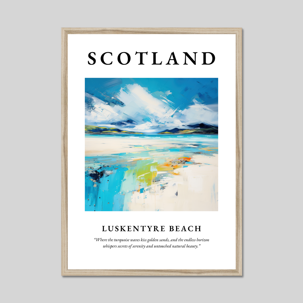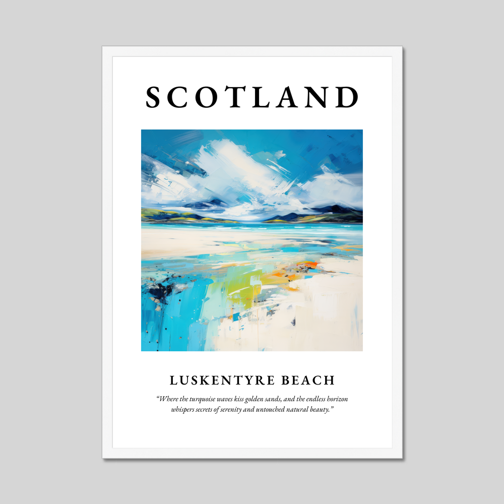 At the top of the poster, the word "SCOTLAND" is prominently displayed in big, bold lettering, immediately setting the scene for the visual journey that follows. Below, an evocative expressionist painting captures the essence of Luskentyre Beach. Brush strokes swirl across the canvas, vibrant with hues of turquoise and gold, mimicking the gentle embrace of the waves against sun-kissed sands. The fluidity of the Expressionism style brings movement to the still image, evoking the dance of light upon water and sand. Underneath, the poetic quote, “Where the turquoise waves kiss golden sands, and the endless horizon whispers secrets of serenity and untouched natural beauty,” captures the evocative nature of this piece.
