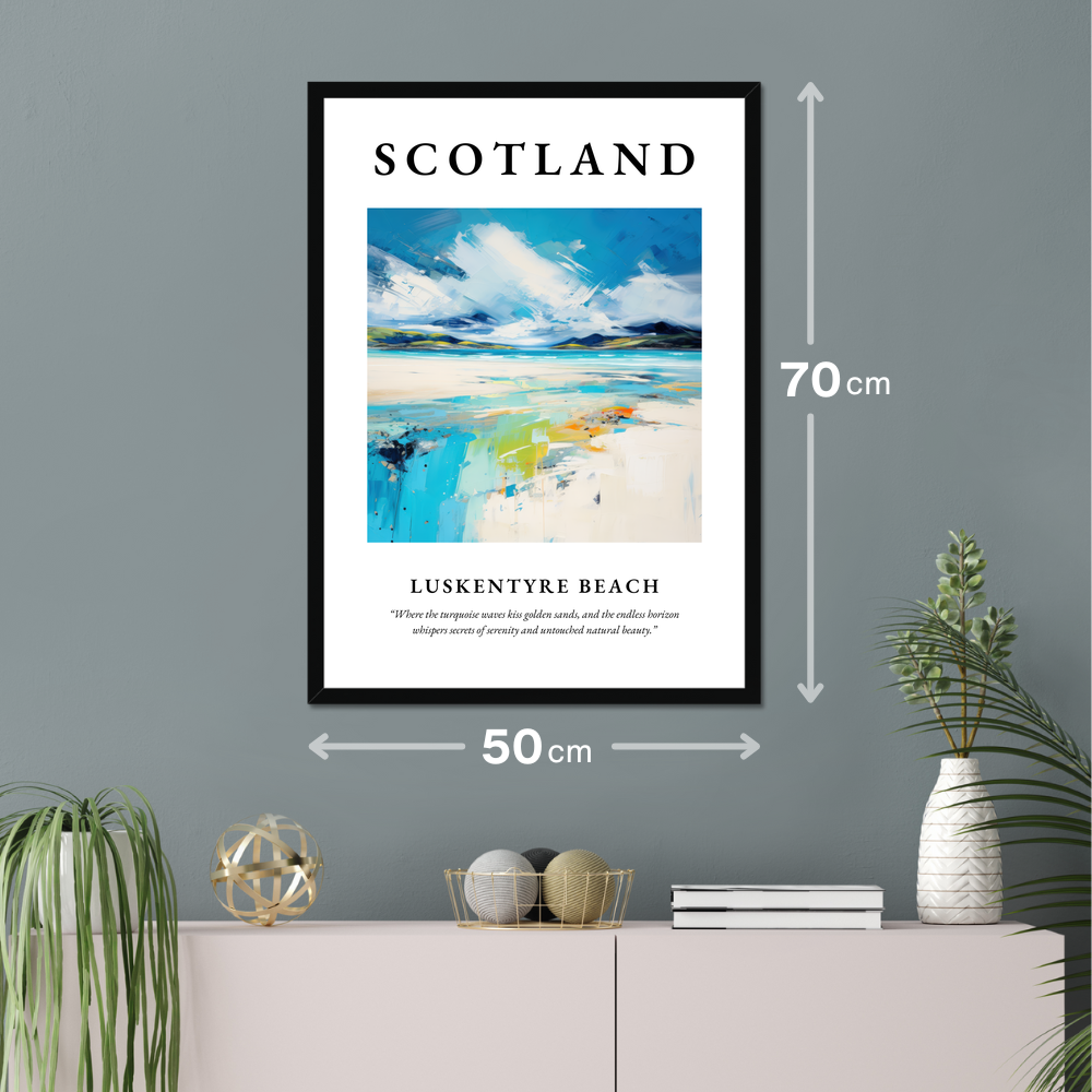 Bring the enchanting beauty of Scotland's beaches into your home with this stunning framed poster print, perfectly encapsulating the idyllic charm of Luskentyre Beach. Measuring a bold 50cm x 70cm, this art piece commands attention, offering a generous splash of colour and style to any room. Available with a sleek black, crisp white, or natural wood-effect frame, this print seamlessly integrates with a variety of interior décors, letting your wall become a window to a serene Scottish seascape.