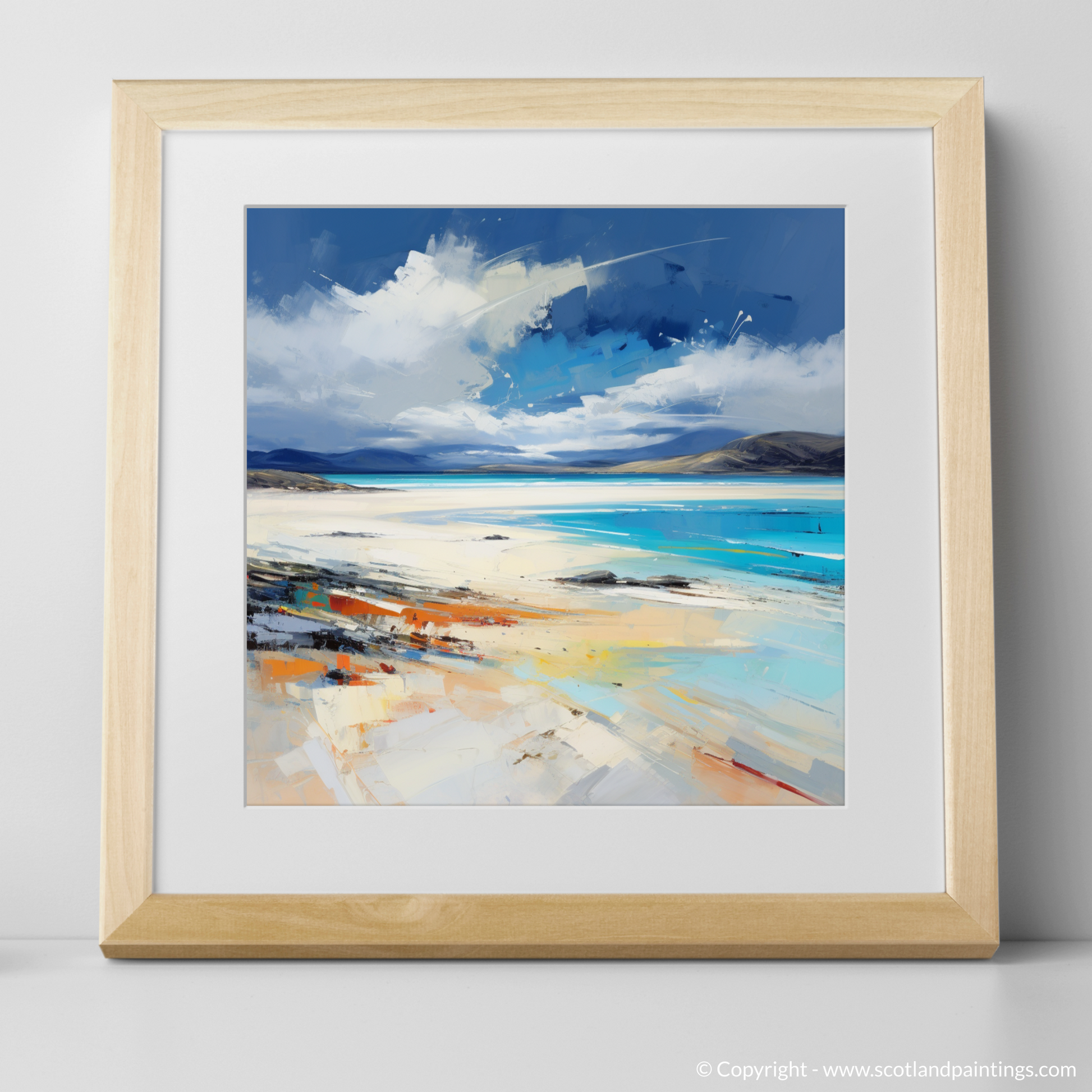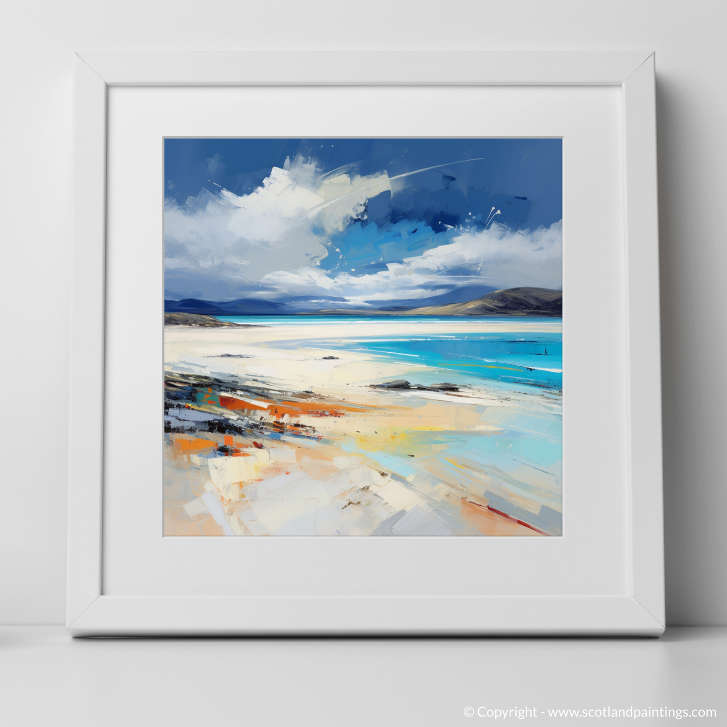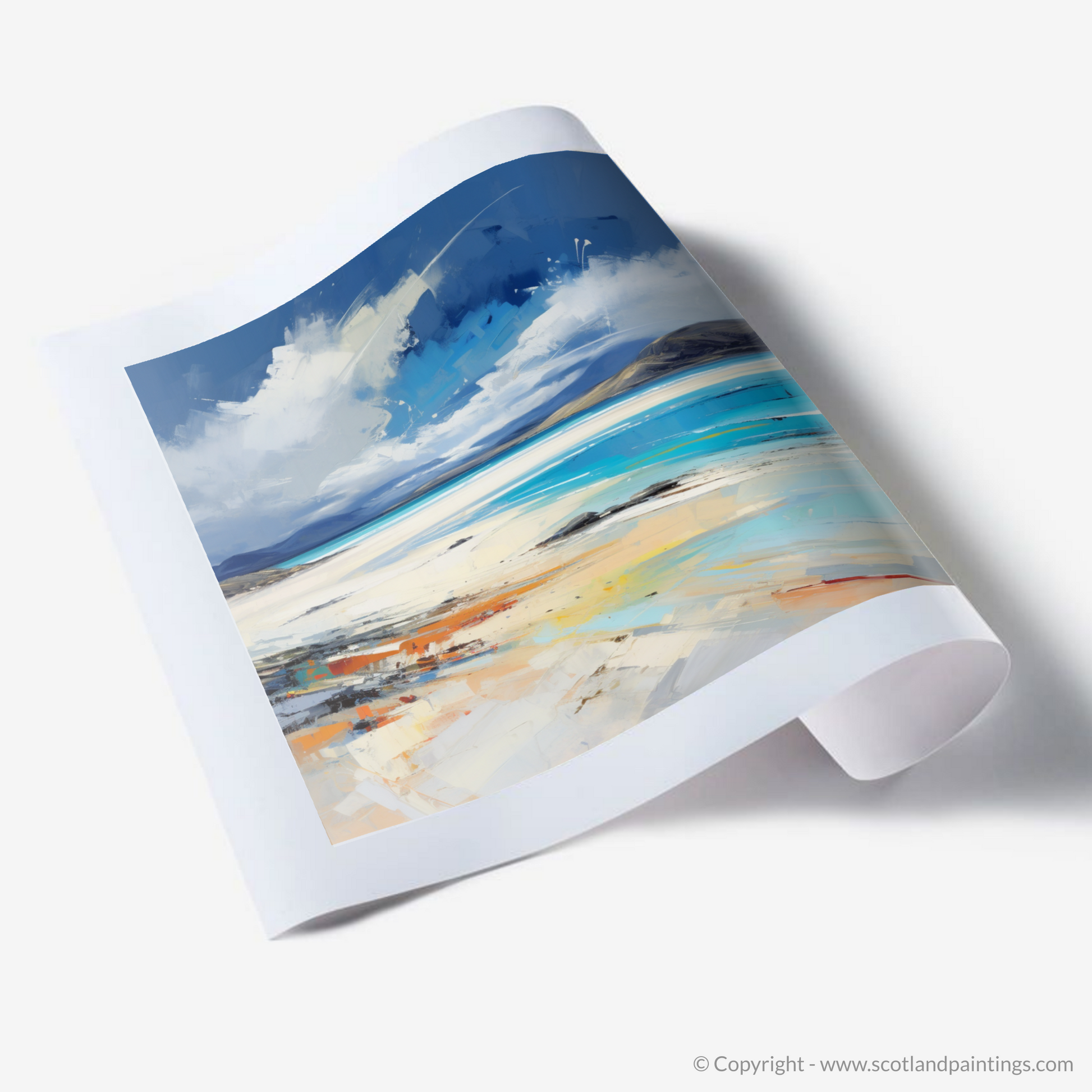 Capturing the raw, dynamic energy of Luskentyre Beach on the Isle of Harris, this expressionist print is a vibrant ode to one of Scotland's most beautiful coastal landscapes. Using a bold, impasto technique, the artwork showcases a wealth of texture, its sweeping strokes of white and blue creating a vivid sky that casts a dramatic interplay of light and shadow. The cerulean and azure hues of the sea are rendered with a fluidity that suggests movement, inviting viewers to feel the rush of the Hebrides' cool, crisp air.