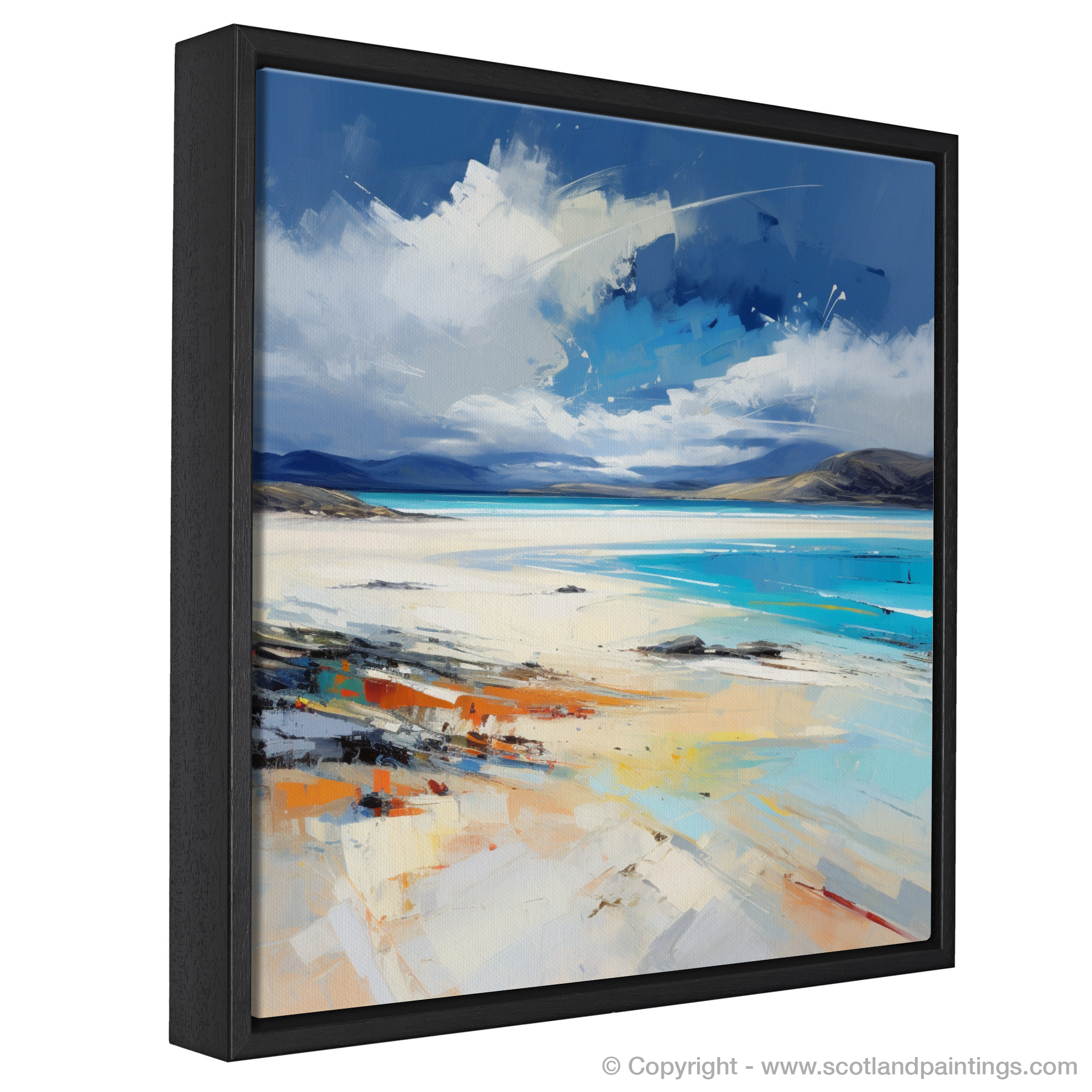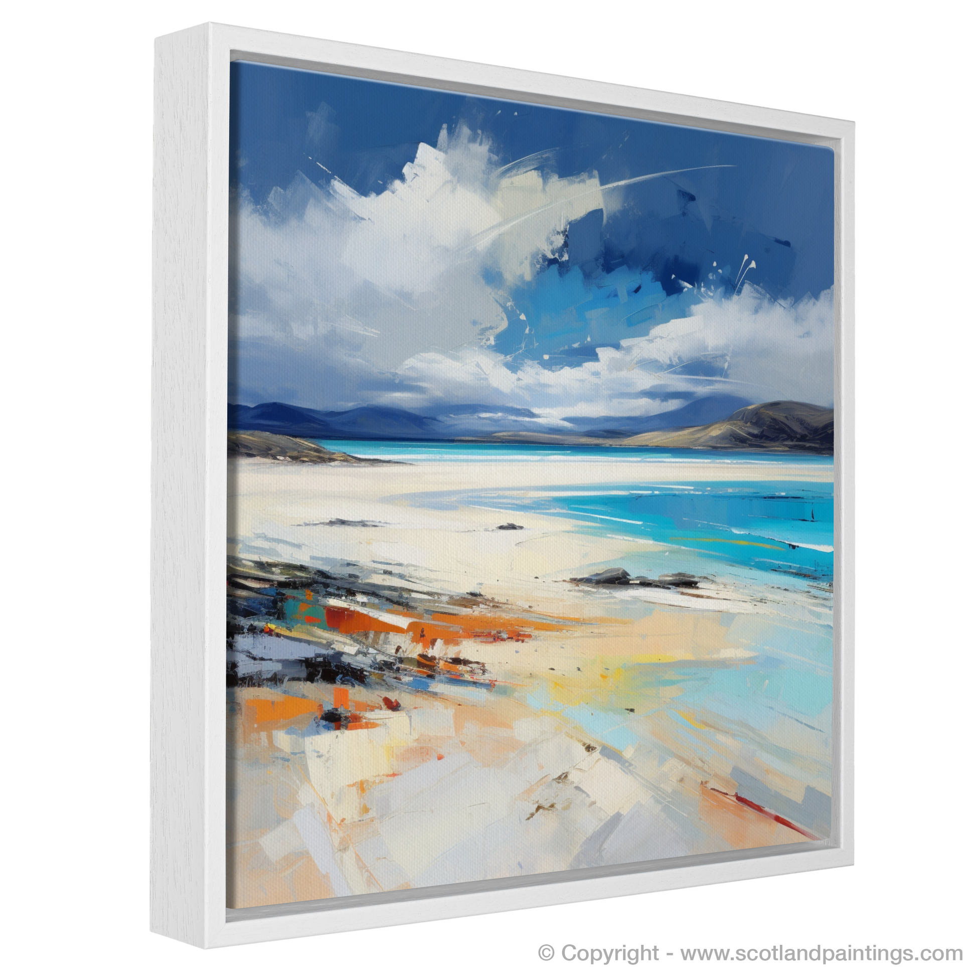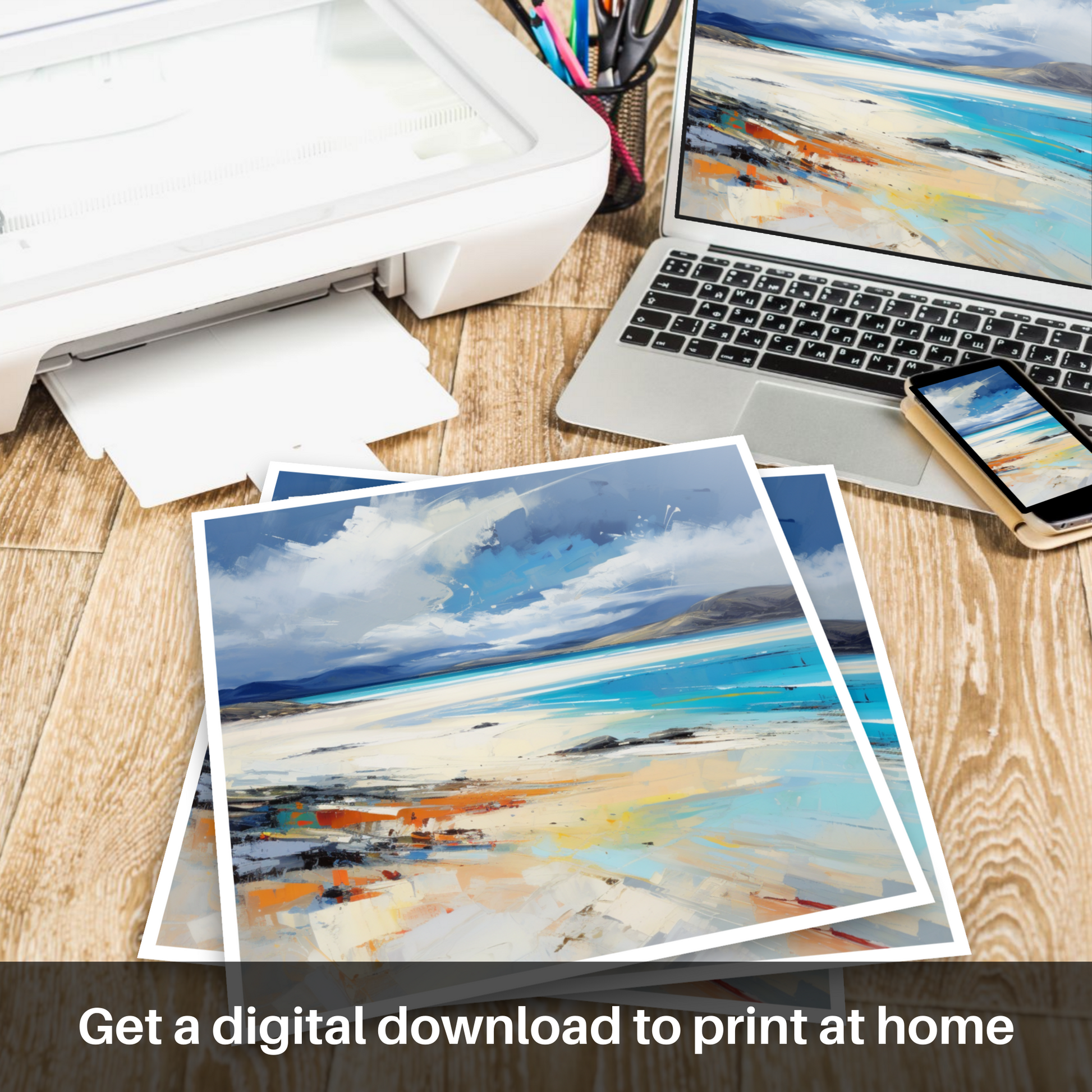 Capturing the raw, dynamic energy of Luskentyre Beach on the Isle of Harris, this expressionist print is a vibrant ode to one of Scotland's most beautiful coastal landscapes. Using a bold, impasto technique, the artwork showcases a wealth of texture, its sweeping strokes of white and blue creating a vivid sky that casts a dramatic interplay of light and shadow. The cerulean and azure hues of the sea are rendered with a fluidity that suggests movement, inviting viewers to feel the rush of the Hebrides' cool, crisp air.
