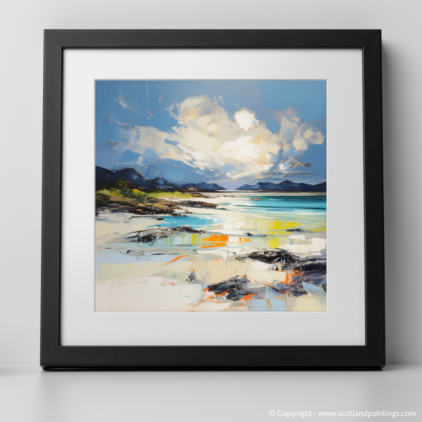 Nestled on the romantic west coast of Scotland, Camusdarach Beach, Arisaig, is renowned for its pristine white sands and breathtaking views of the Isles of Eigg, Rum, and Skye. It is a place where the natural beauty of Scotland’s wilderness is vividly alive, offering a peaceful retreat that perfectly complements the serene tones of these prints. This enchanting location may already be familiar as it graced the silver screen in the classic film "Local Hero." The artwork captures this ethereal charm, allowing you to bring a piece of Scotland's natural beauty into your home.