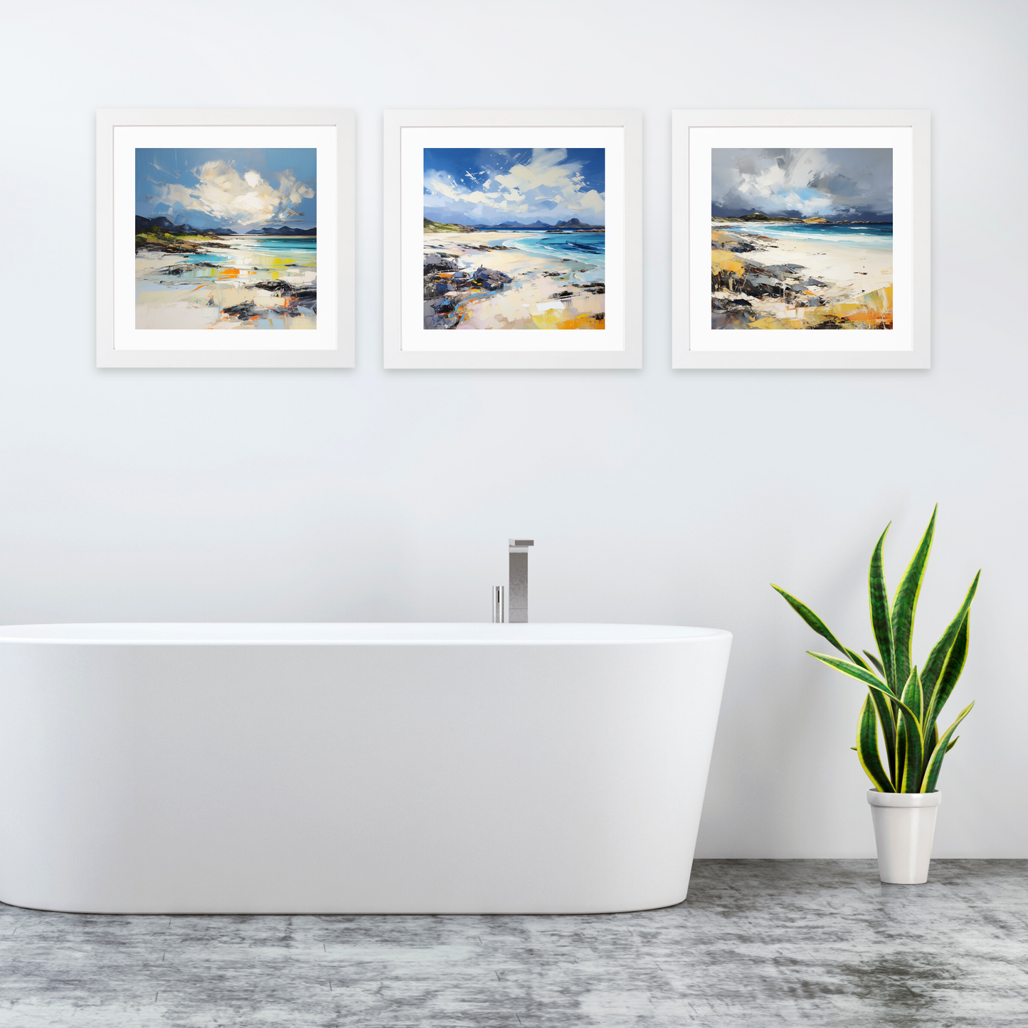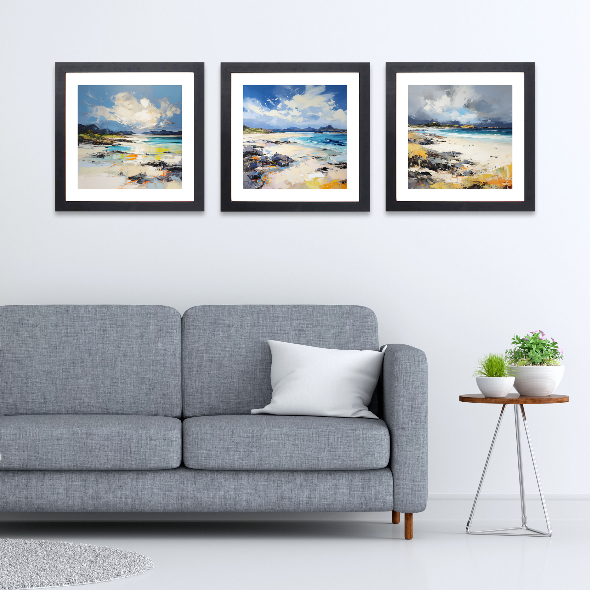 Introduce the serene beauty of Scotland into your home with our exquisite set of three framed prints, showcasing the mesmerising landscapes of Camusdarach Beach, Arisaig. As part of the Scottish Beaches collection available on ScotlandPaintings.com, this captivating trio captures the serene splendour of Scotland’s stunning coastline, inviting tranquillity and elegance into any space.