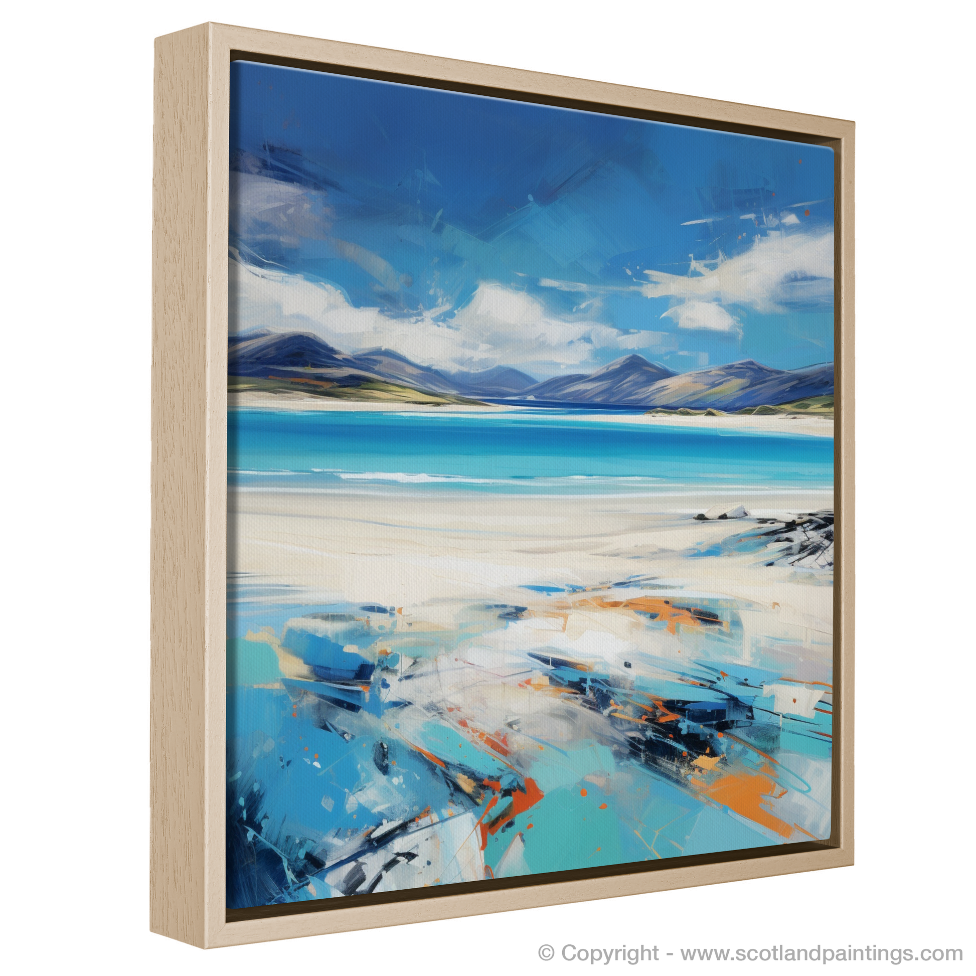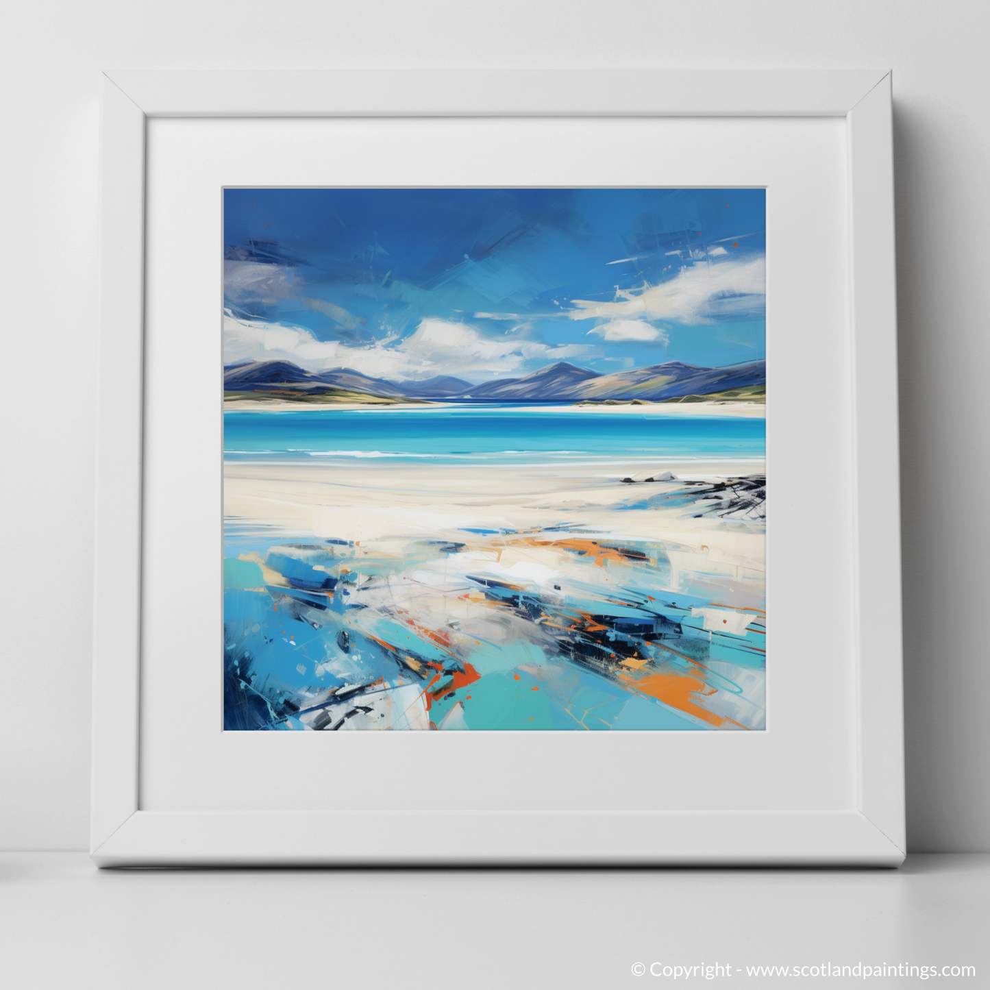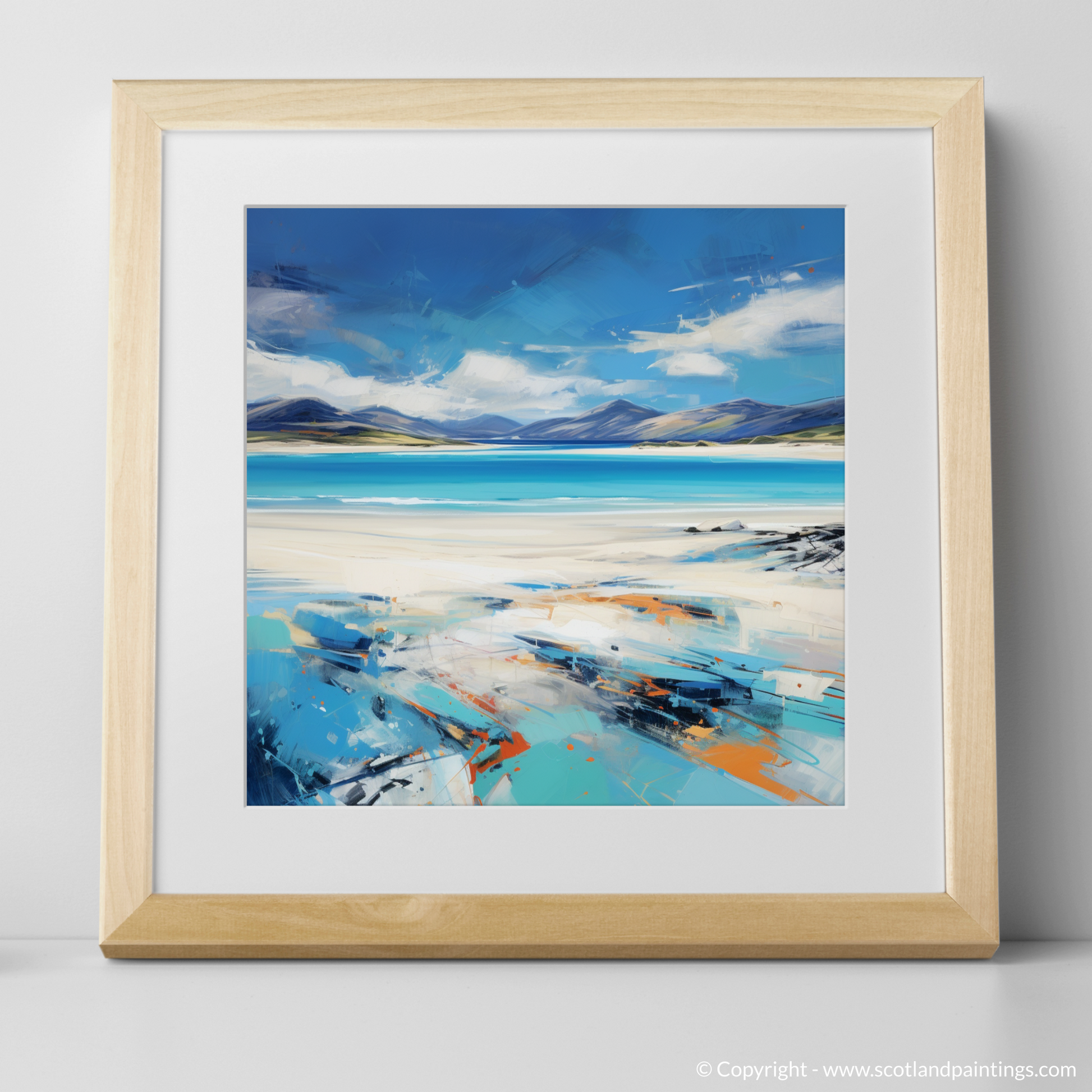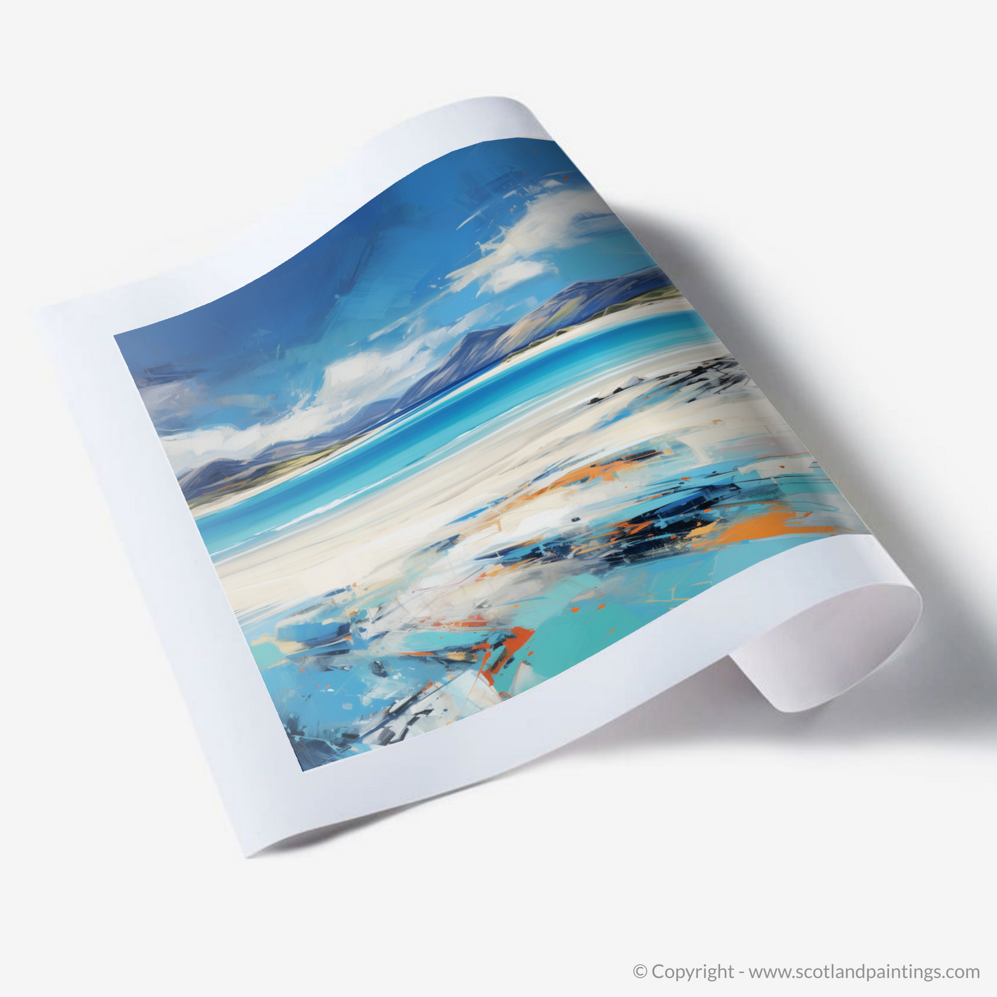This expressive print captures the dynamic spirit and stunning panorama of Luskentyre Beach on the Isle of Harris with a vivacity that breathes life into the scene. The artwork is a symphony of bold strokes and vibrant colour contrasts that evoke the raw beauty and elemental force of the Scottish coastline. Shades of azure and cerulean blue meld seamlessly with the horizon, depicting the vast and welcoming expanse of the sky meeting the sea in a dance of natural splendour. The beach itself is rendered in a palette of whites and sandy tones, interspersed with hints of orange and teal that suggest the unique play of light across its surface. The sweeping brushwork imparts a sense of movement, echoing the windswept grasses and shifting sands that characterise this enchanting destination. As part of the 'Scottish Beaches' collection, this print serves as a captivating homage to one of Scotland's most treasured landscapes, offering viewers a slice of its majesty to adorn their spaces with.