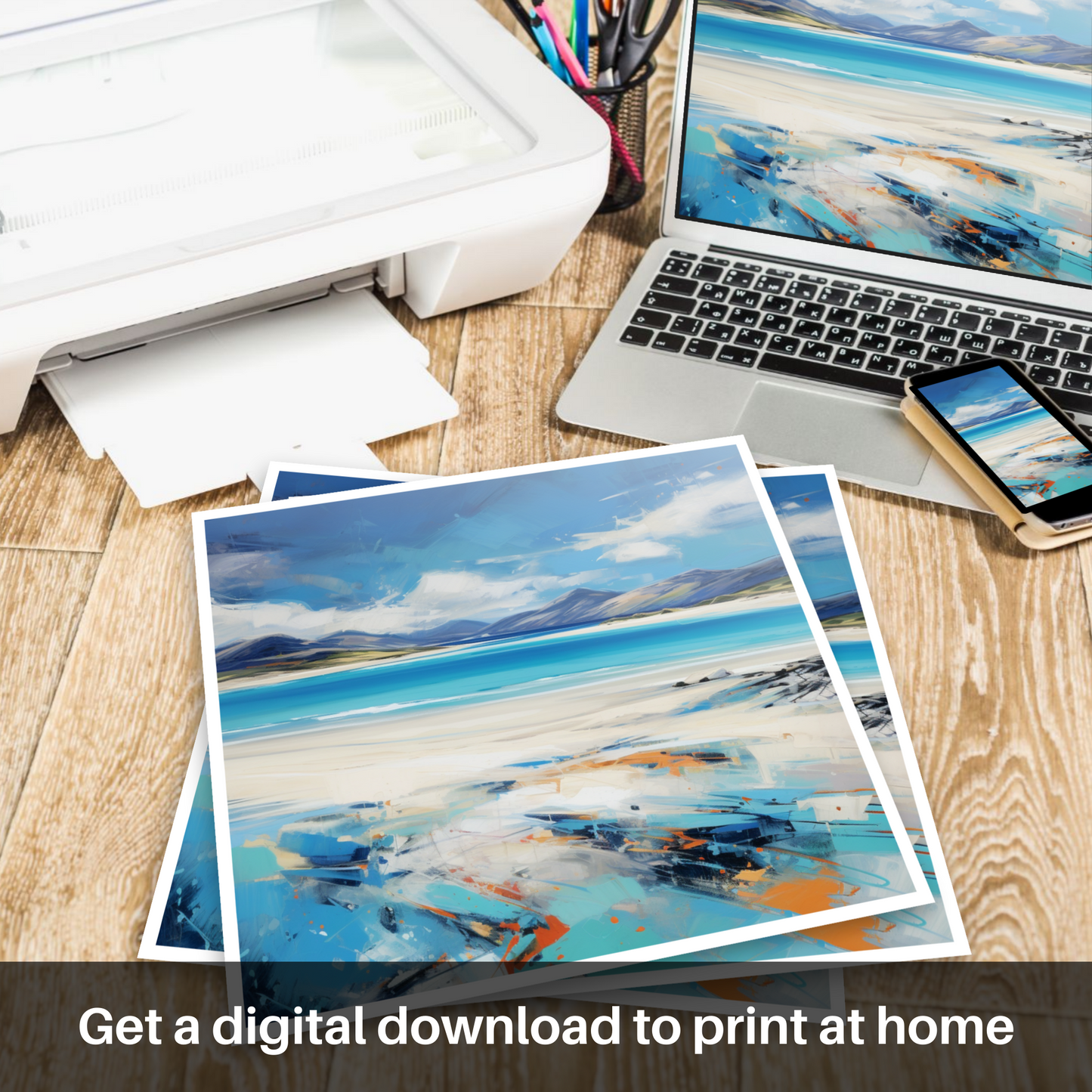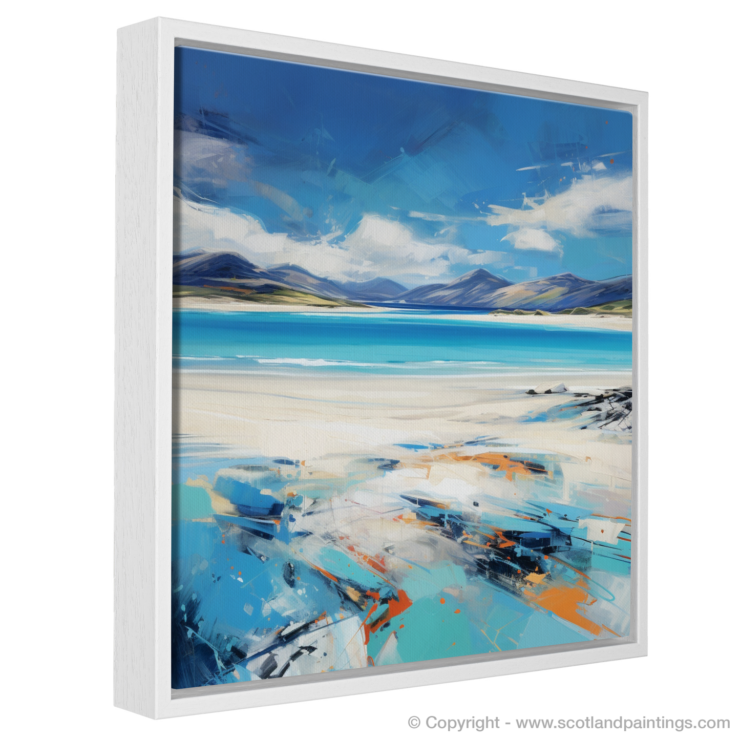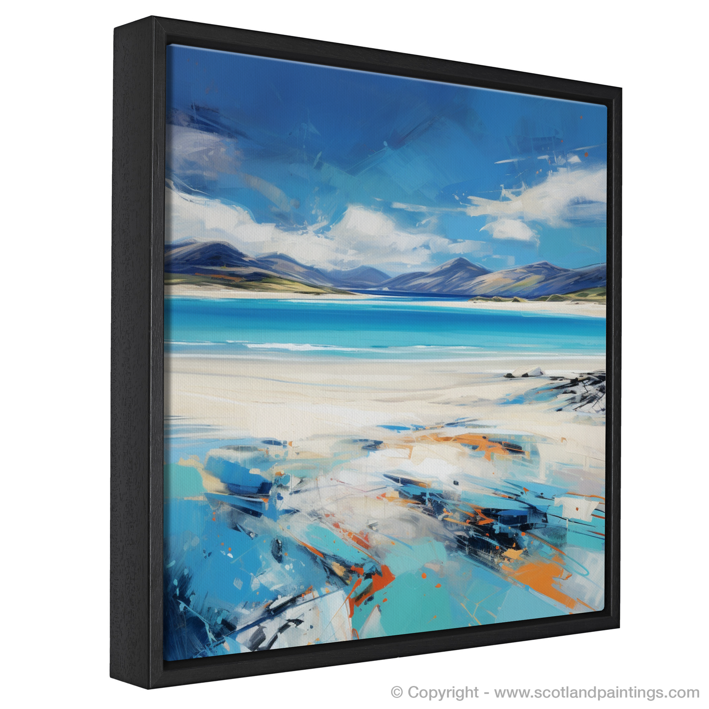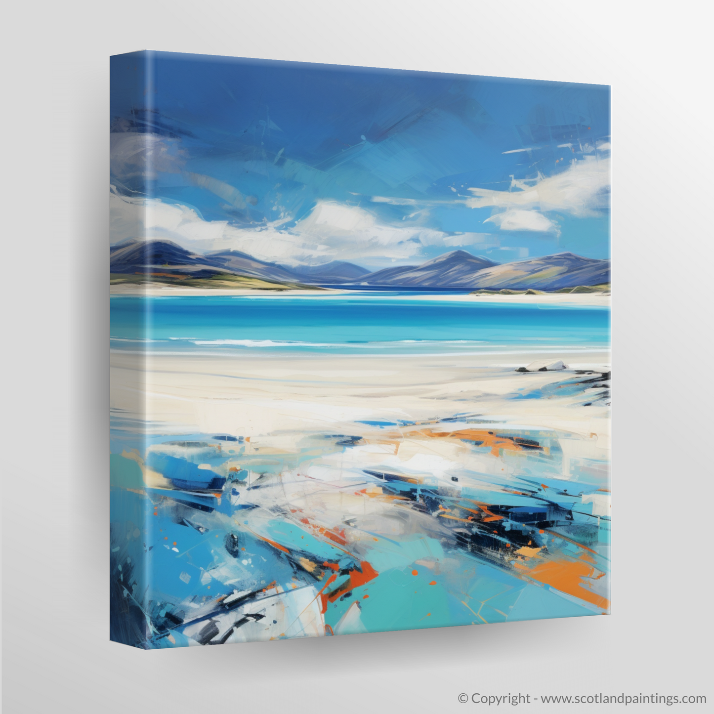 This expressive print captures the dynamic spirit and stunning panorama of Luskentyre Beach on the Isle of Harris with a vivacity that breathes life into the scene. The artwork is a symphony of bold strokes and vibrant colour contrasts that evoke the raw beauty and elemental force of the Scottish coastline. Shades of azure and cerulean blue meld seamlessly with the horizon, depicting the vast and welcoming expanse of the sky meeting the sea in a dance of natural splendour. The beach itself is rendered in a palette of whites and sandy tones, interspersed with hints of orange and teal that suggest the unique play of light across its surface. The sweeping brushwork imparts a sense of movement, echoing the windswept grasses and shifting sands that characterise this enchanting destination. As part of the 'Scottish Beaches' collection, this print serves as a captivating homage to one of Scotland's most treasured landscapes, offering viewers a slice of its majesty to adorn their spaces with.