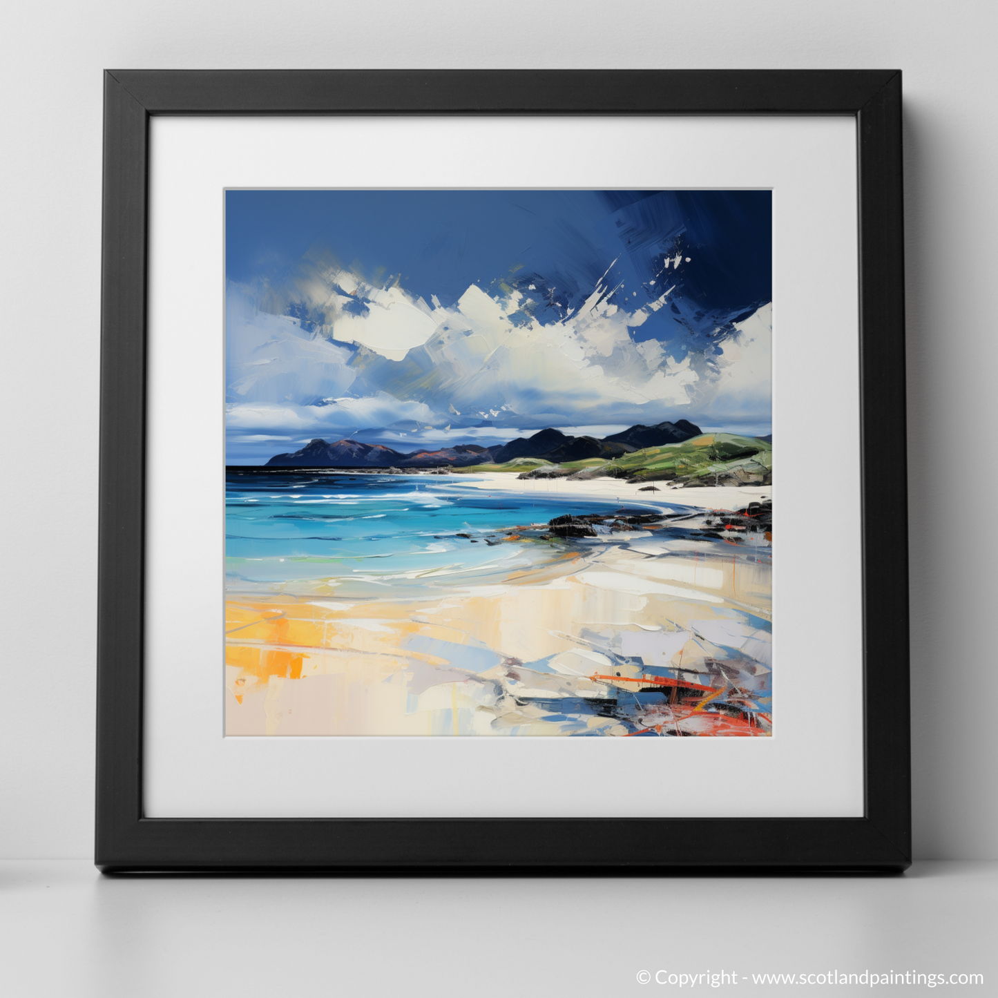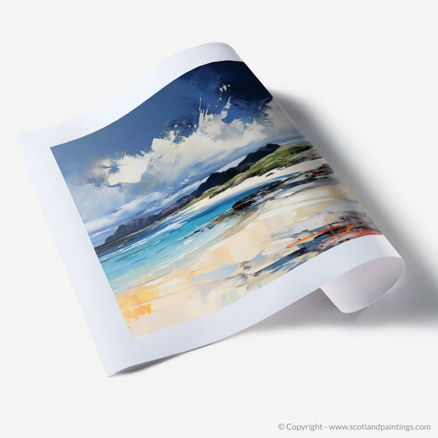 Captured in a whirlwind of colour and emotion, this expressionist piece offers a vibrant interpretation of Camusdarach Beach, located near Arisaig on the west coast of Scotland. The print features a dynamic portrayal of the beach's sweeping sands, framed by rugged coastline and backed by the undulating silhouettes of distant hills.