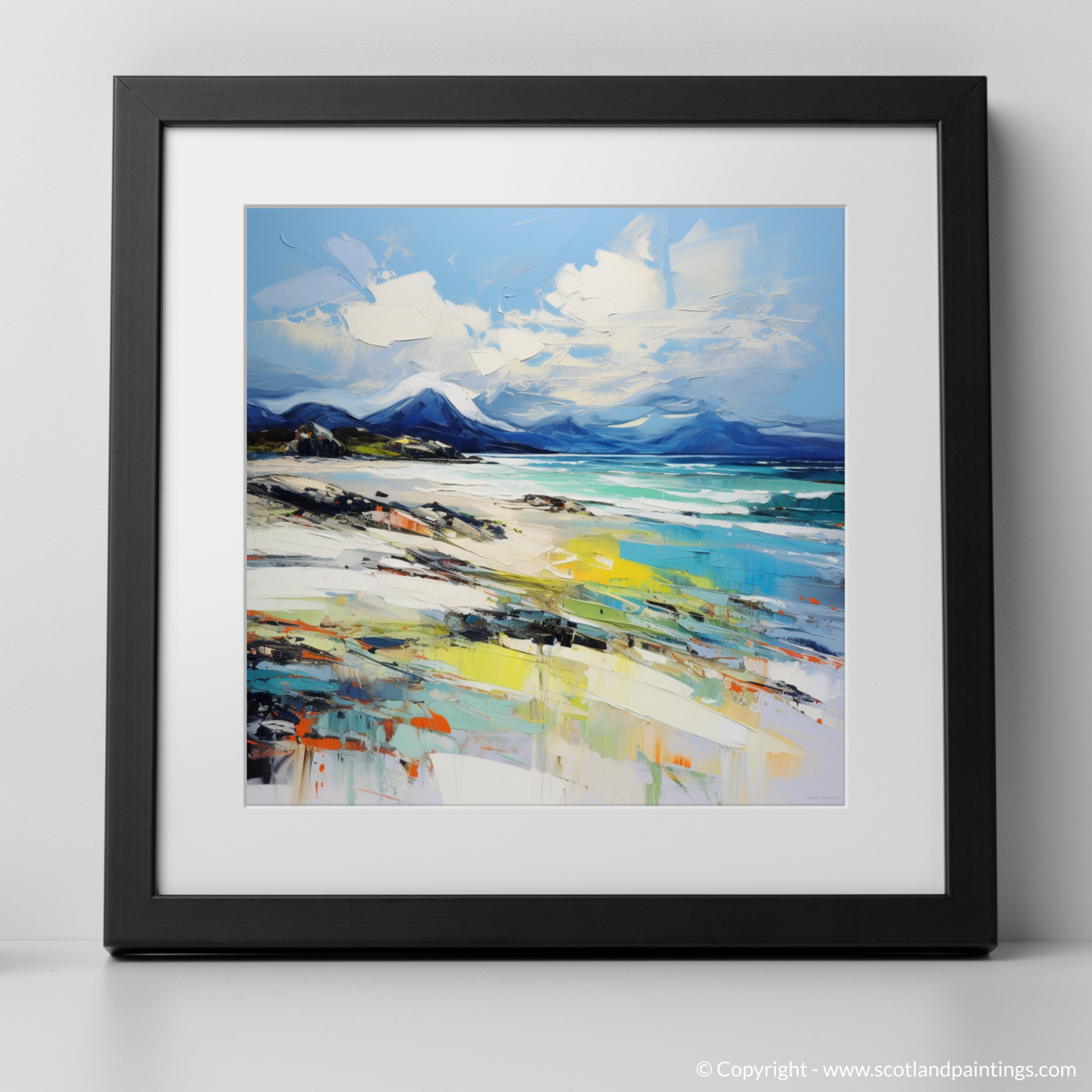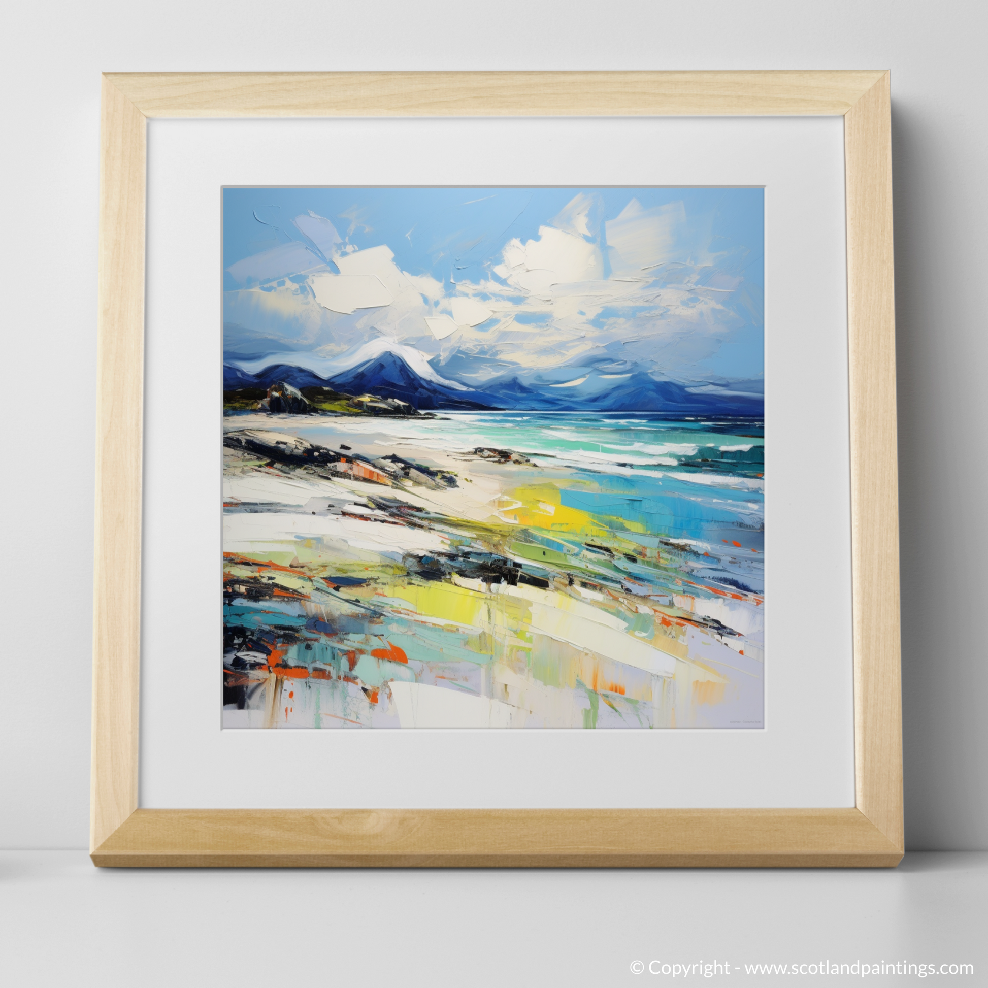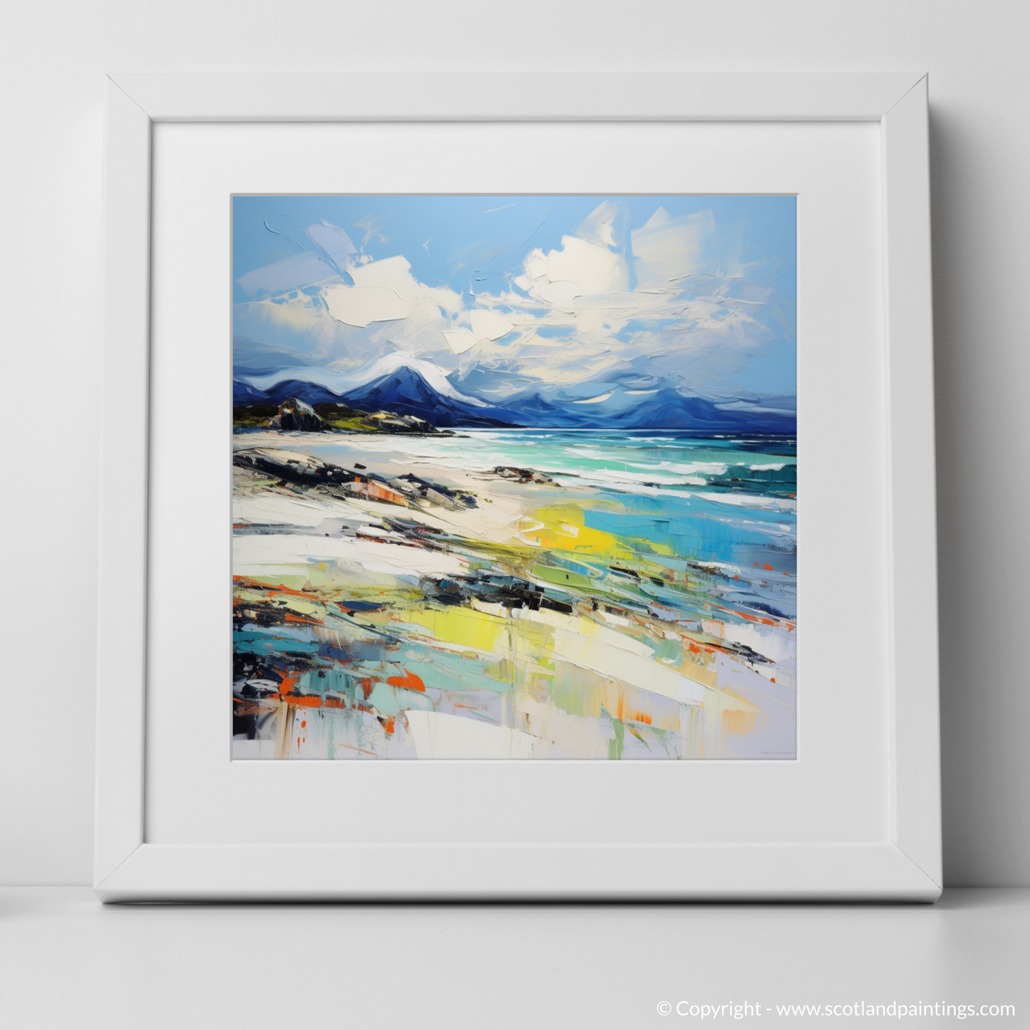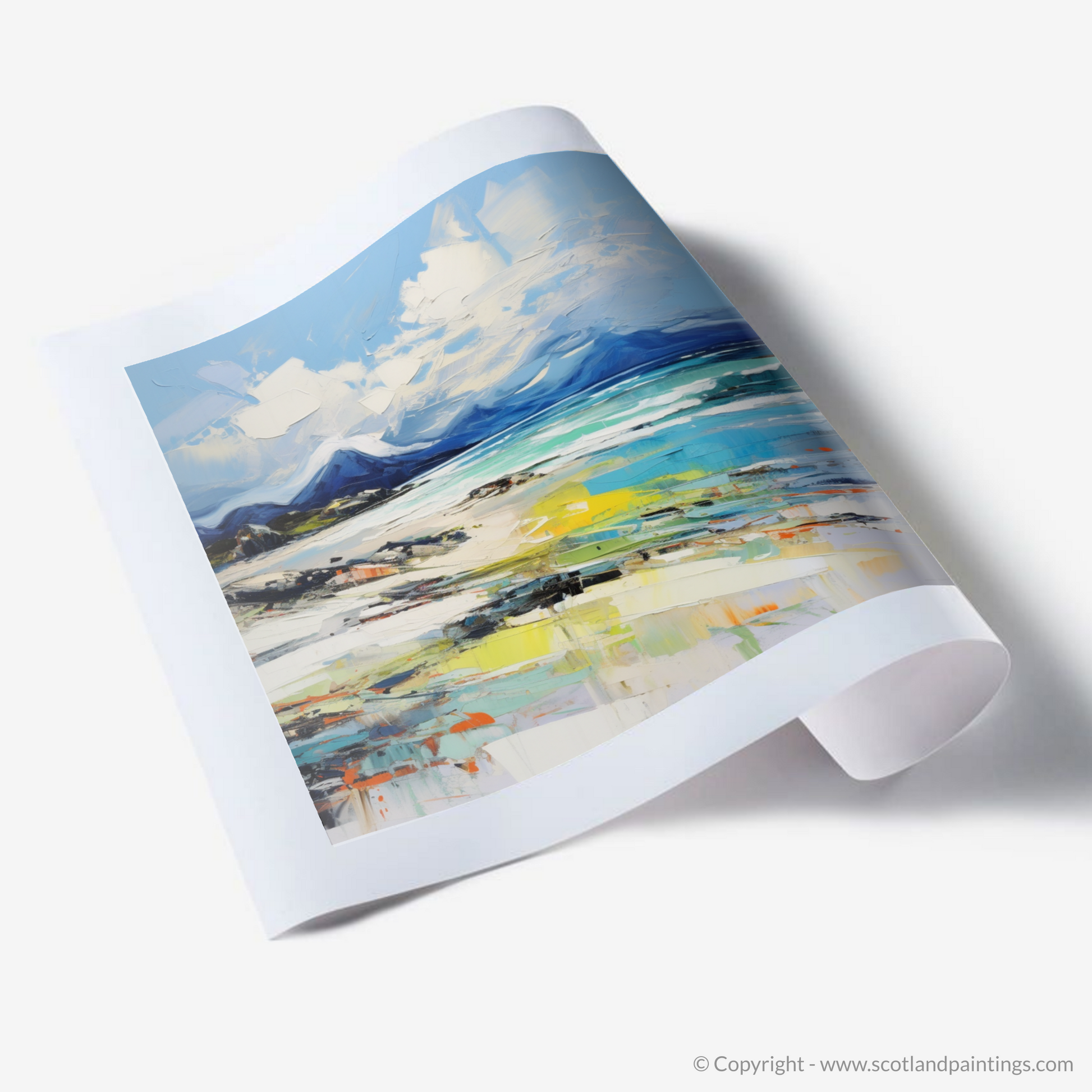 Capturing the wild, unspoilt beauty of Camusdarach Beach, Arisaig, this expressive print is a vibrant homage to one of Scotland's most picturesque coastal treasures. With a whirlwind of bold colours and dynamic brushstrokes, the piece evokes the stirring energy of the Scottish shores. The azure blues and emerald greens of the sea dance with the pure whites of the sandy beach, while the distant mountains, rendered in moody blues and greys, add a sense of majestic tranquillity to the scene.
