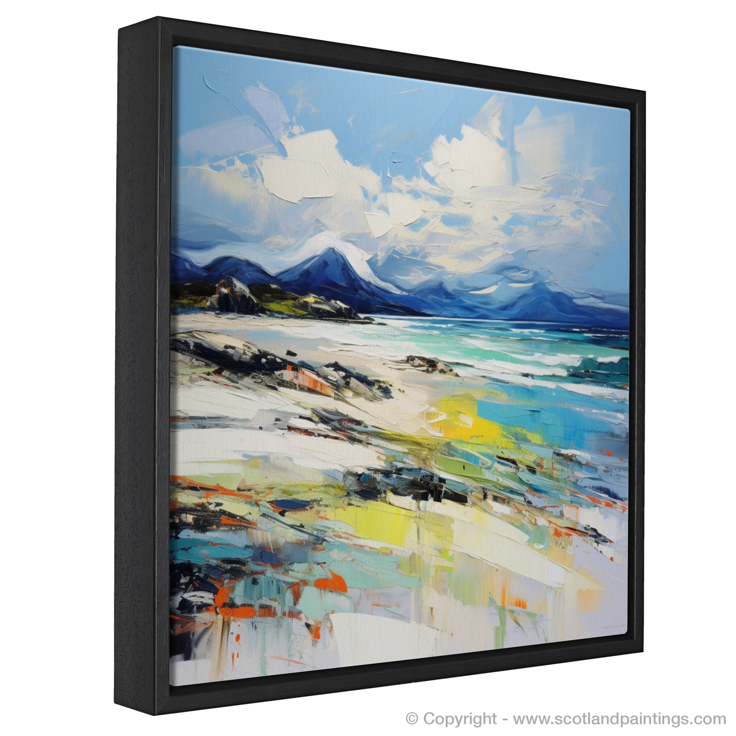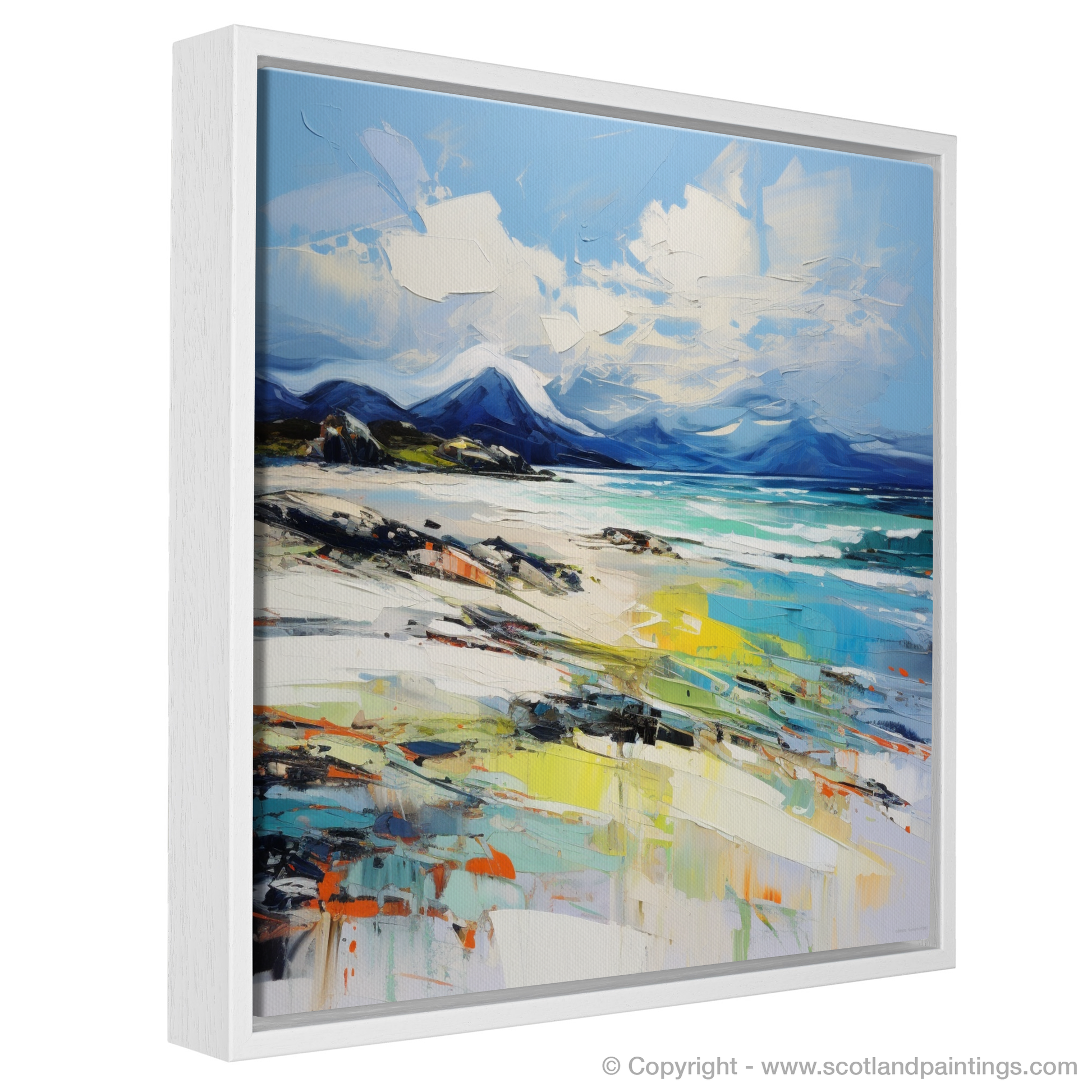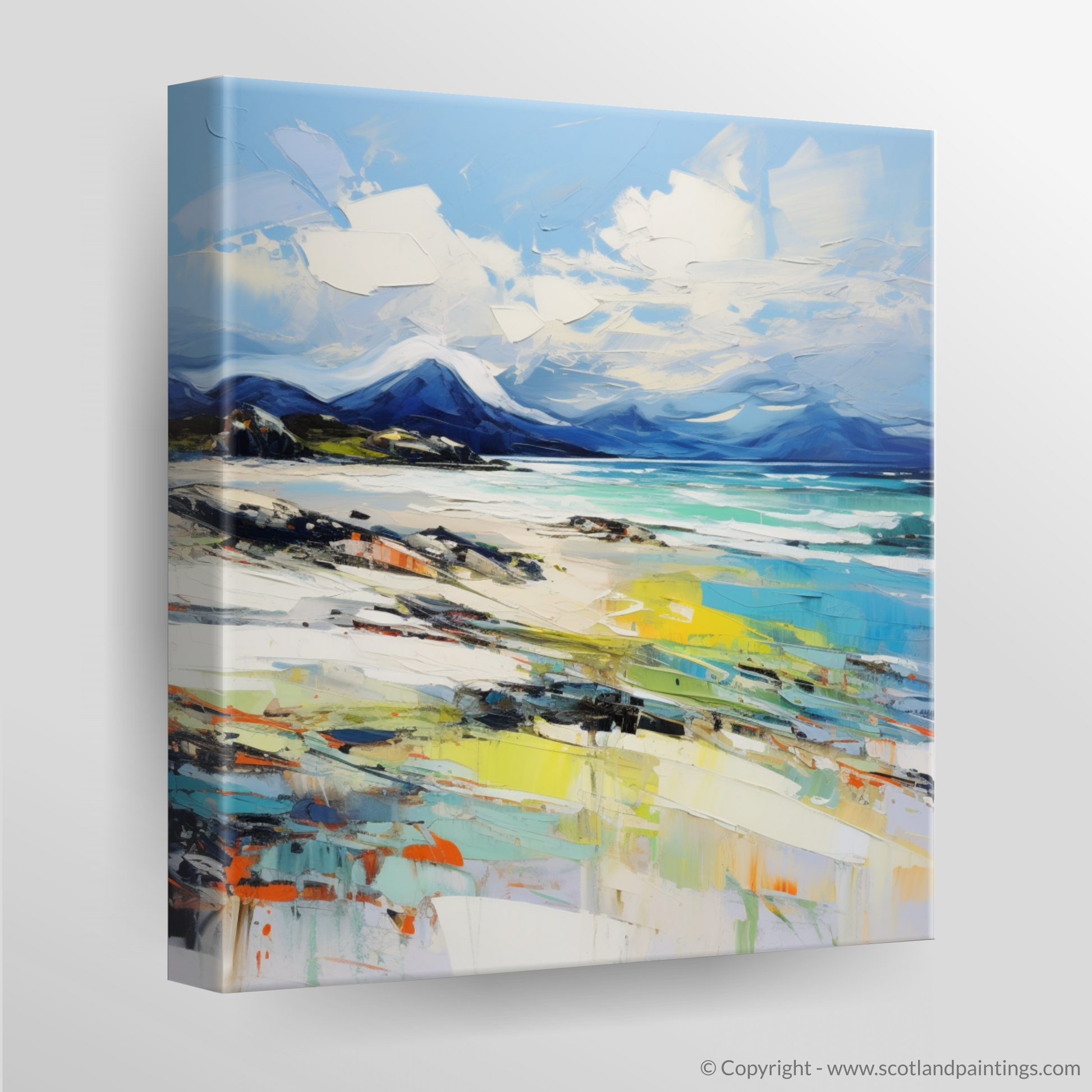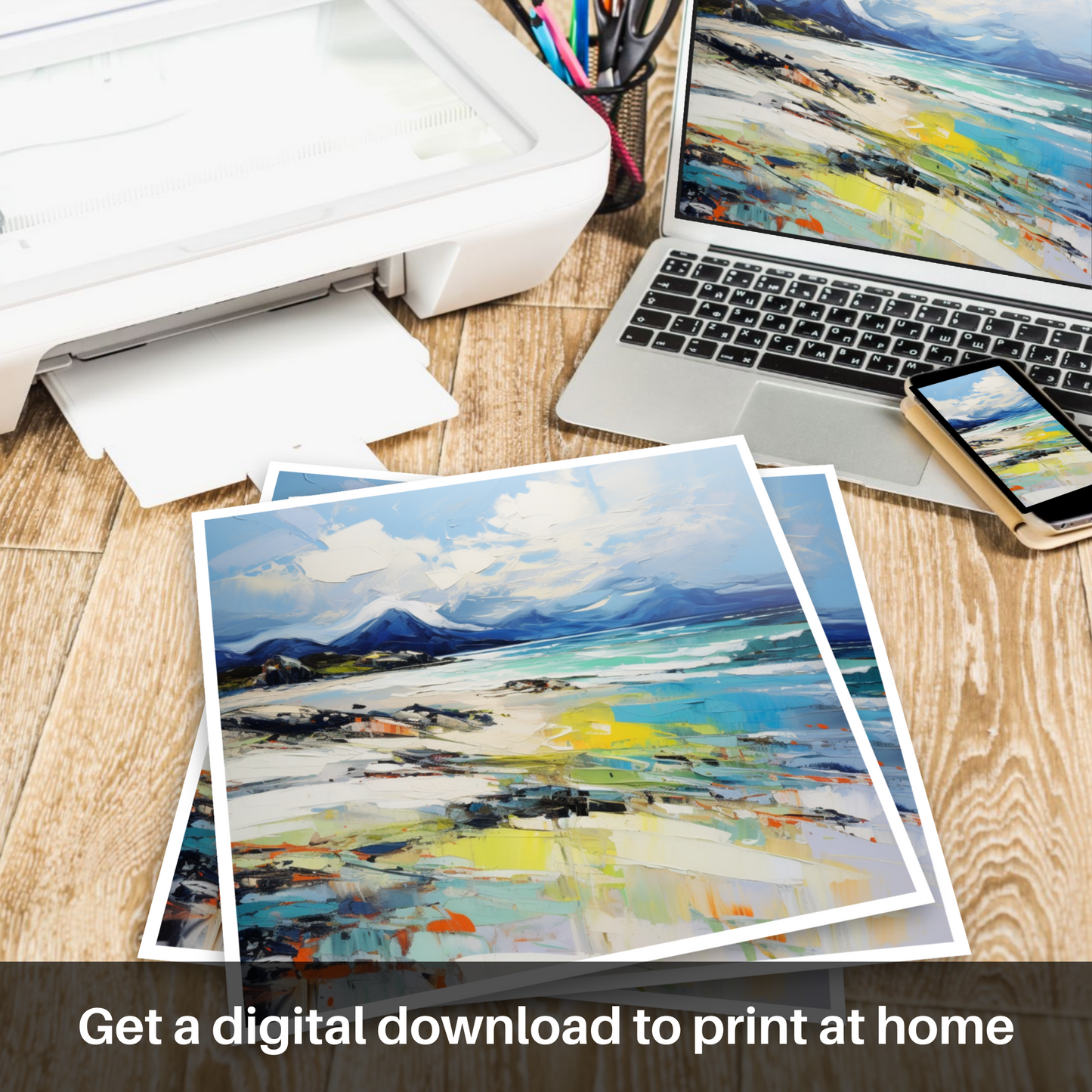 Capturing the wild, unspoilt beauty of Camusdarach Beach, Arisaig, this expressive print is a vibrant homage to one of Scotland's most picturesque coastal treasures. With a whirlwind of bold colours and dynamic brushstrokes, the piece evokes the stirring energy of the Scottish shores. The azure blues and emerald greens of the sea dance with the pure whites of the sandy beach, while the distant mountains, rendered in moody blues and greys, add a sense of majestic tranquillity to the scene.