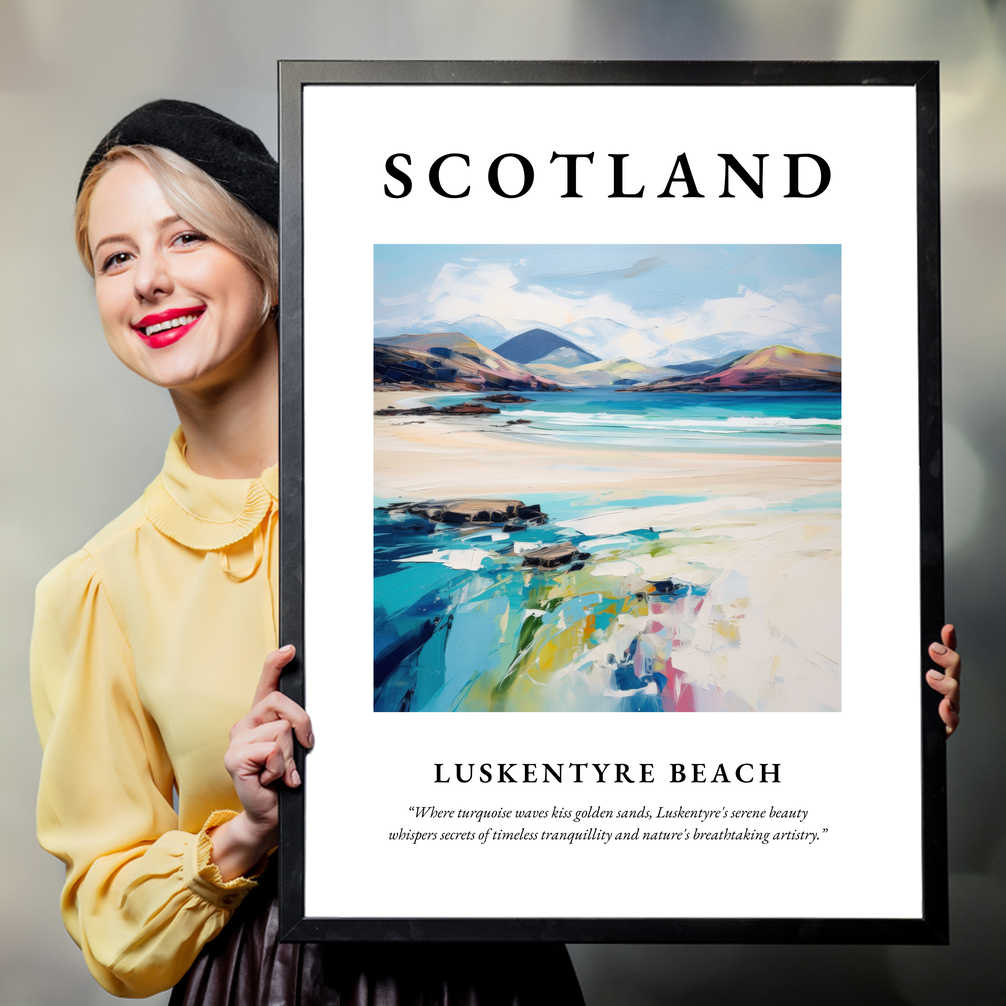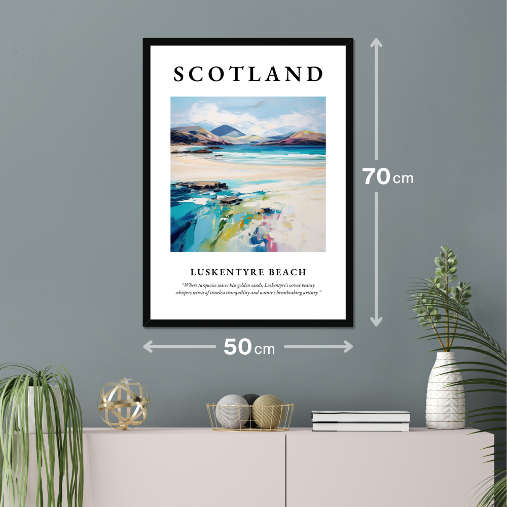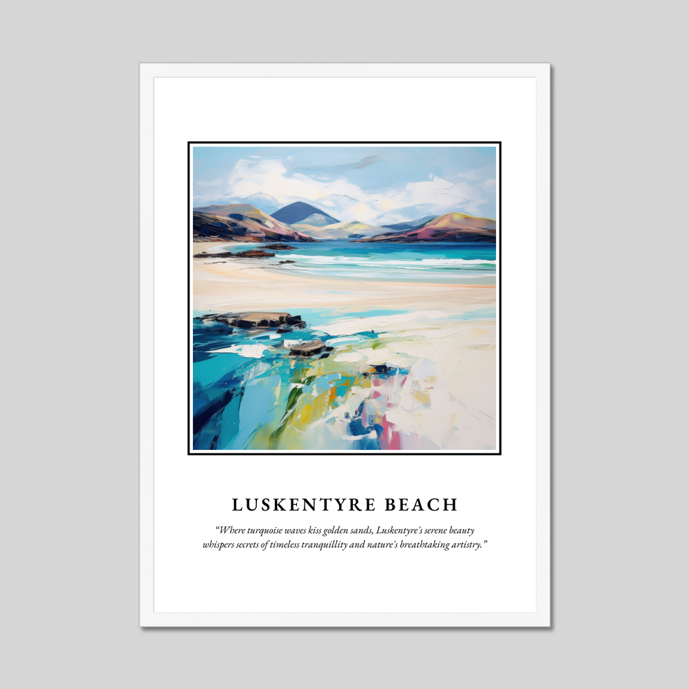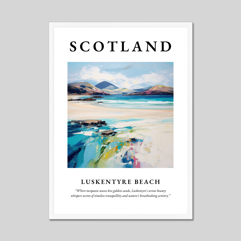 As you gaze upon this exquisite poster, let yourself be transported to this serene haven. Imagine the gentle whisper of the sea breeze, the soft sand beneath your feet, and the vast sky stretching infinitely above you. Whether you've strolled these shores or dream of such a journey, this piece captures Luskentyre's essence—an inspiration for all who cherish the natural wonders of Scotland.