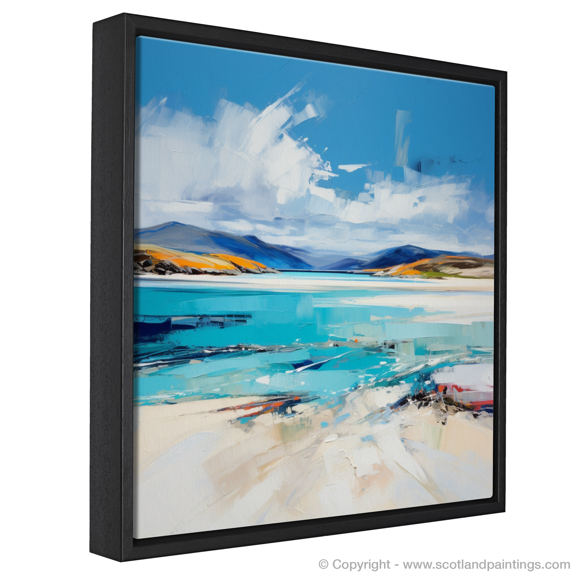 Capturing the wild beauty of Luskentyre Beach on the Isle of Harris, this evocative print is a celebration of colour and movement, reminiscent of the Expressionist movement that sought to depict the world beyond just literal representation. The piece showcases a dynamic symphony of strokes, where azure and cerulean blues merge to render the sea, conveying both its tranquillity and its power. The sky, a canvas within a canvas, is an overture of sweeping white and subtle grey tones, which suggest the movement of clouds across the expansive horizon.