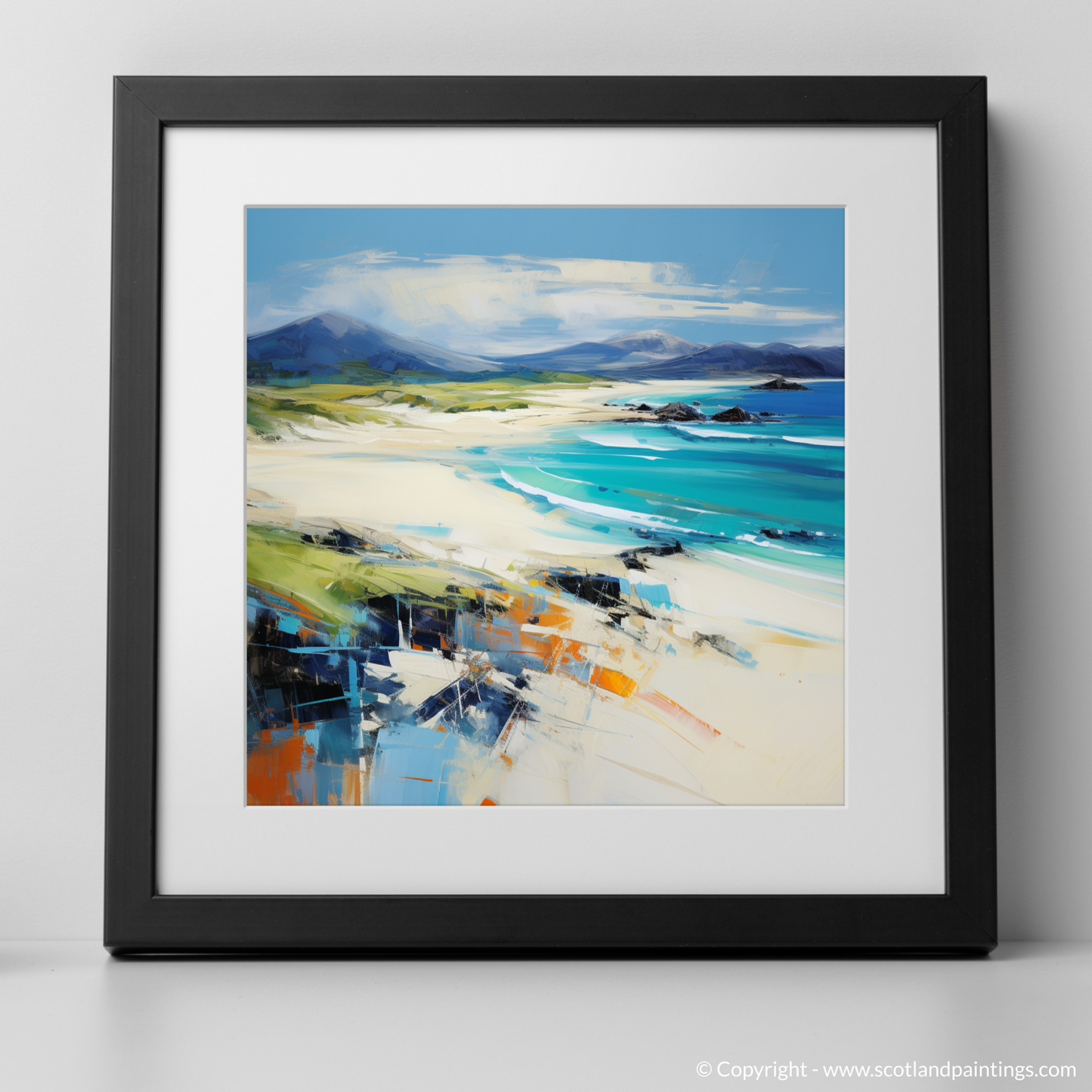 This captivating print is a magnificent portrayal of the natural beauty found at Luskentyre Beach on the Isle of Harris. With a vibrant and dynamic approach typical of Expressionist art, the piece exudes raw emotional energy and a deep connection to the Scottish landscape.