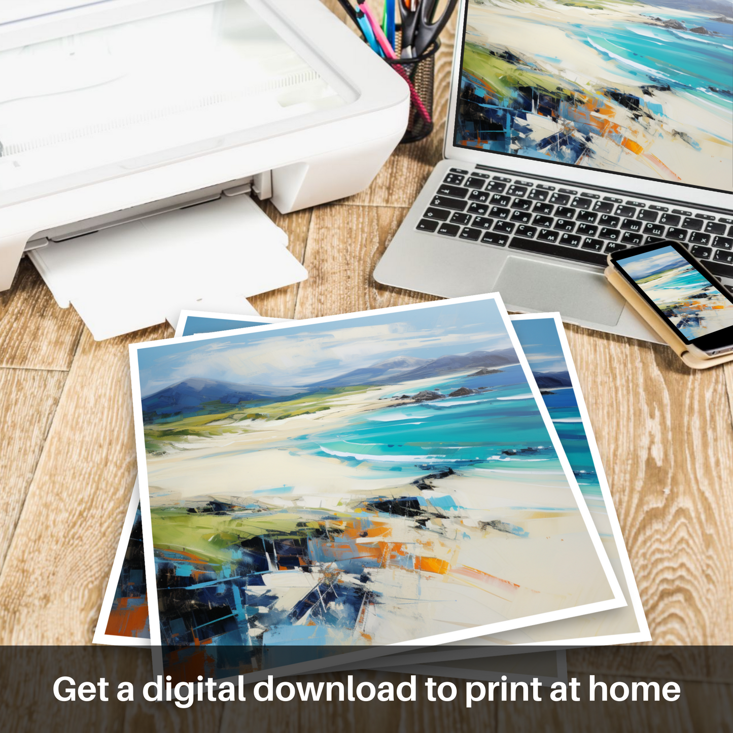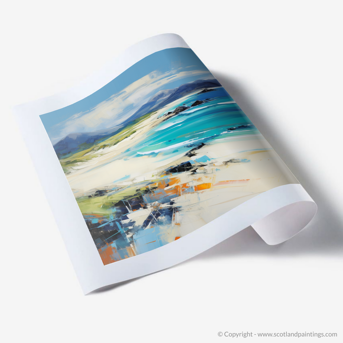 This print offers more than a beautiful scene; it is an invitation to experience the rugged splendour of one of Scotland's most enchanting beaches. It serves as a sublime reminder of the wild, untouched landscapes that still exist, waiting to be explored and appreciated. Through this expressive piece, your space will be infused with the spirit of Scottish nature and the profound emotions it stirs.