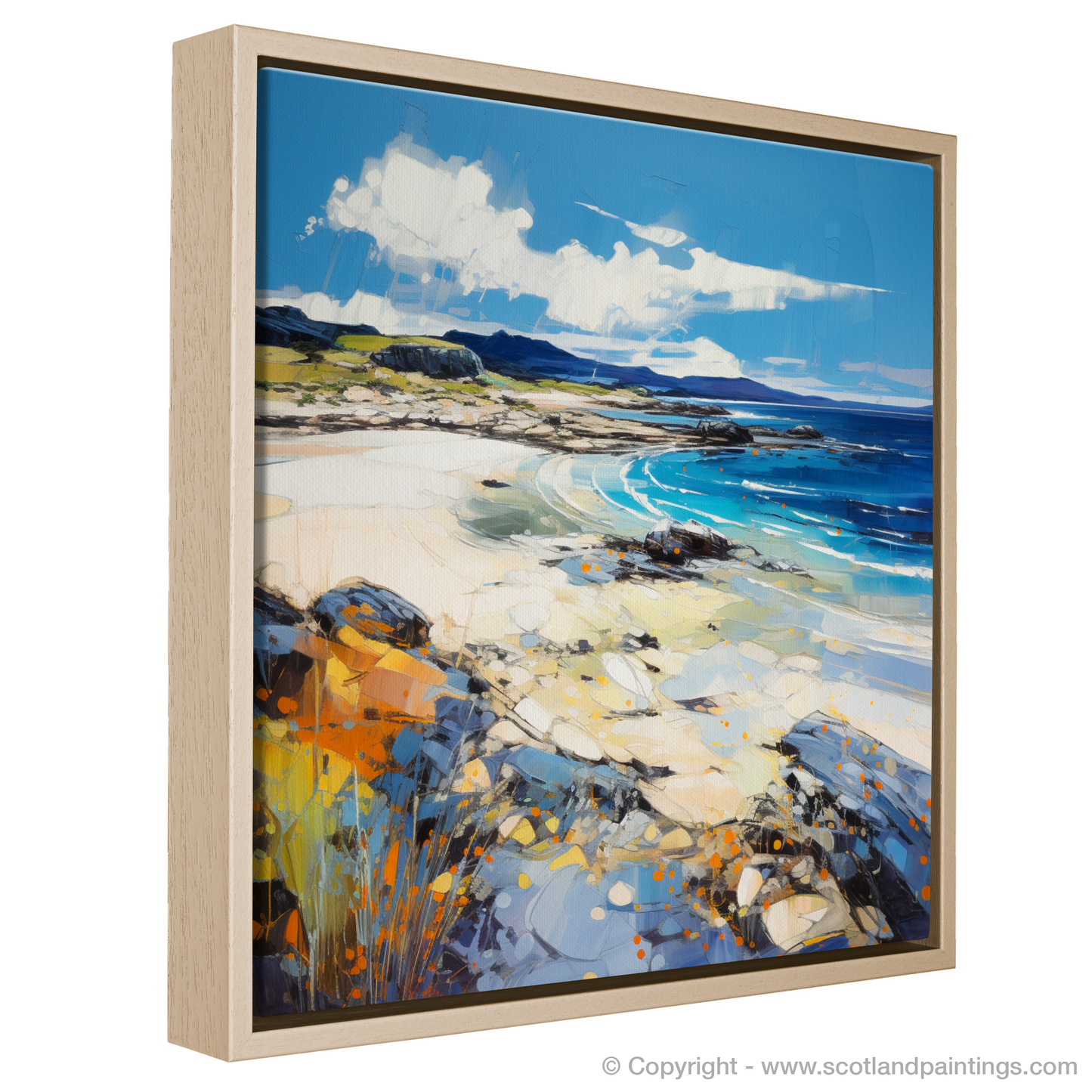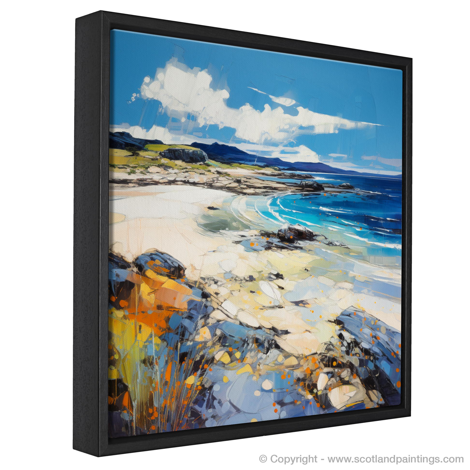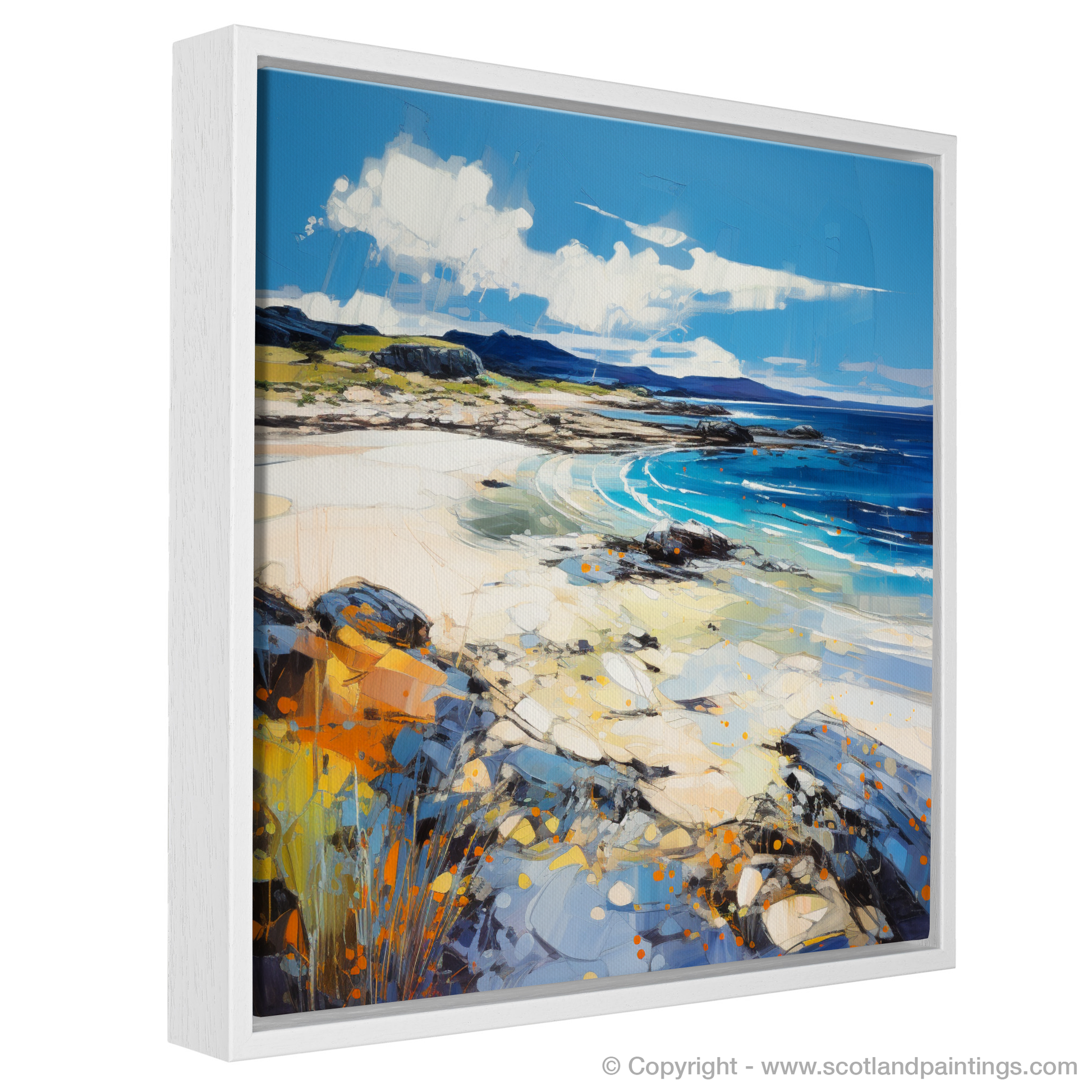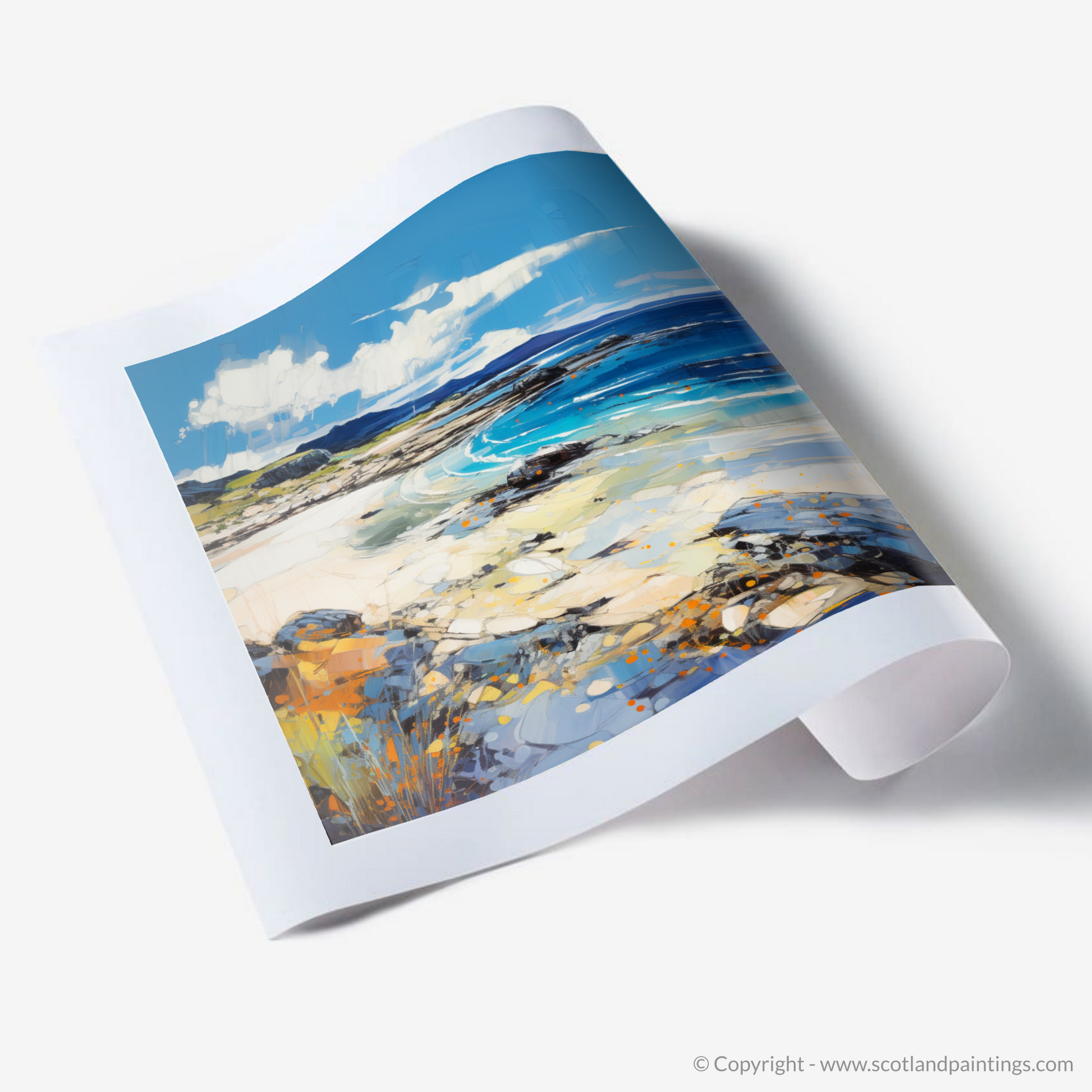 This evocative print captures the vibrant essence of Camusdarach Beach in Arisaig, a treasure of the Scottish coast. The artist employs a vivacious expressionist technique, infusing the scene with dynamic strokes and a rich palette that breathes life into the landscape. Bold blues and tranquil turquoises depict the wash of waves and the depth of the sea, while the golden hues of sand intermingle with patches of warm orange, suggesting a beachscape warmed by the kiss of the sun.