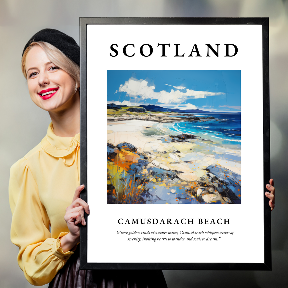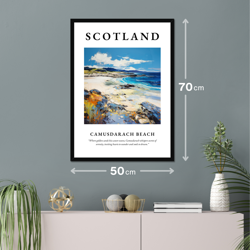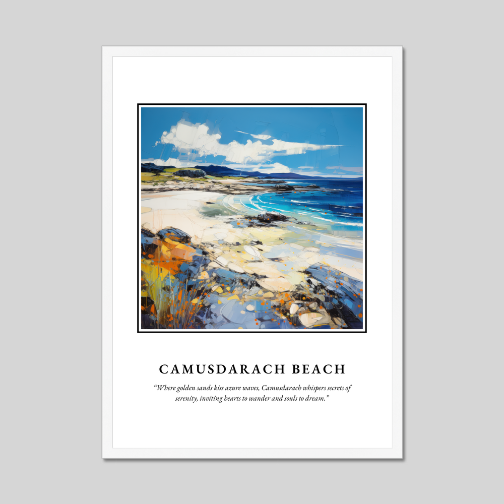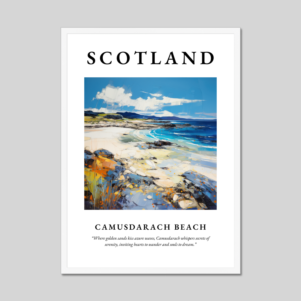 This captivating artwork encapsulates the unique spirit of Camusdarach, inviting you to pause and appreciate the harmonious blend of land and sea. Whether as a reminder of cherished memories or an inspiration for future adventures, this poster brings a piece of Scotland's natural wonder to your home.