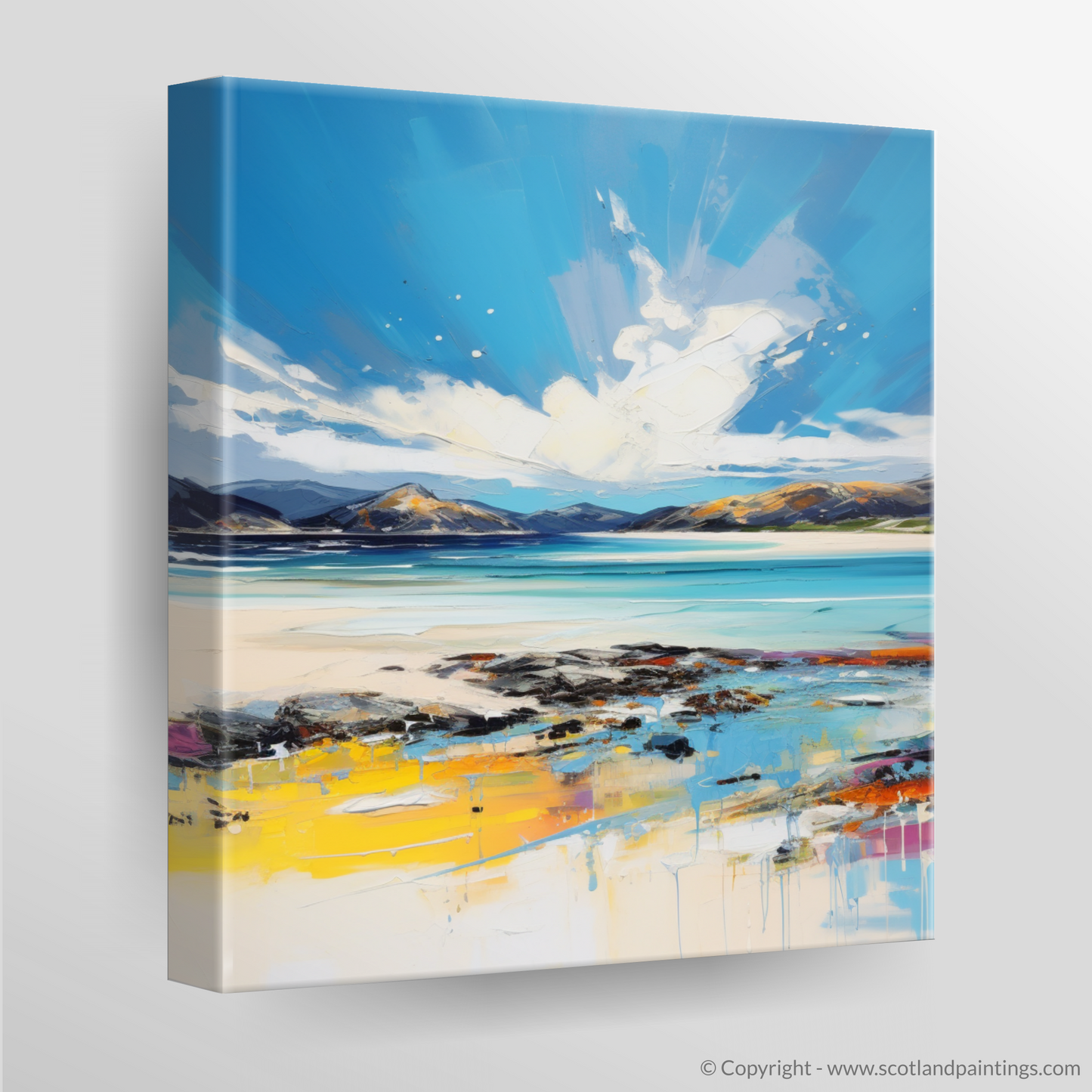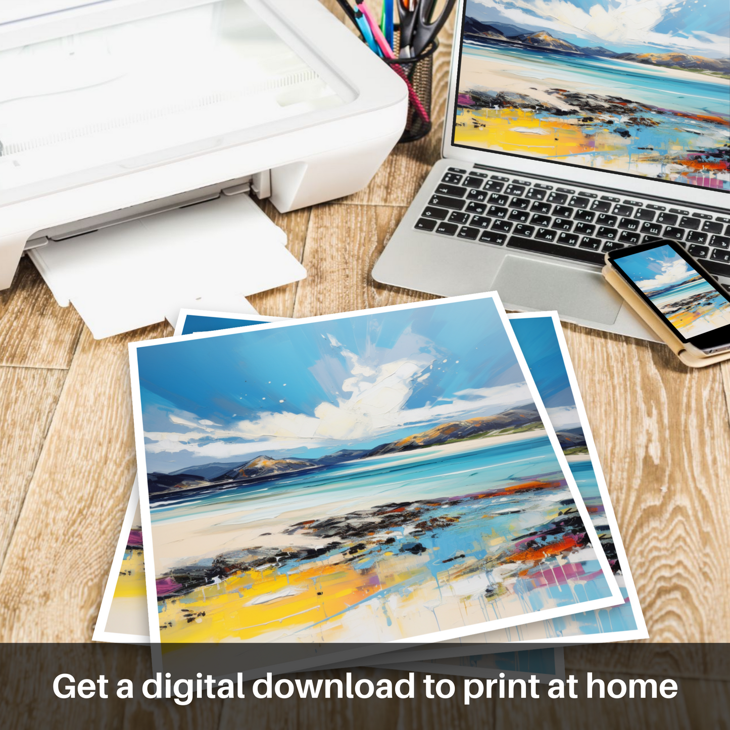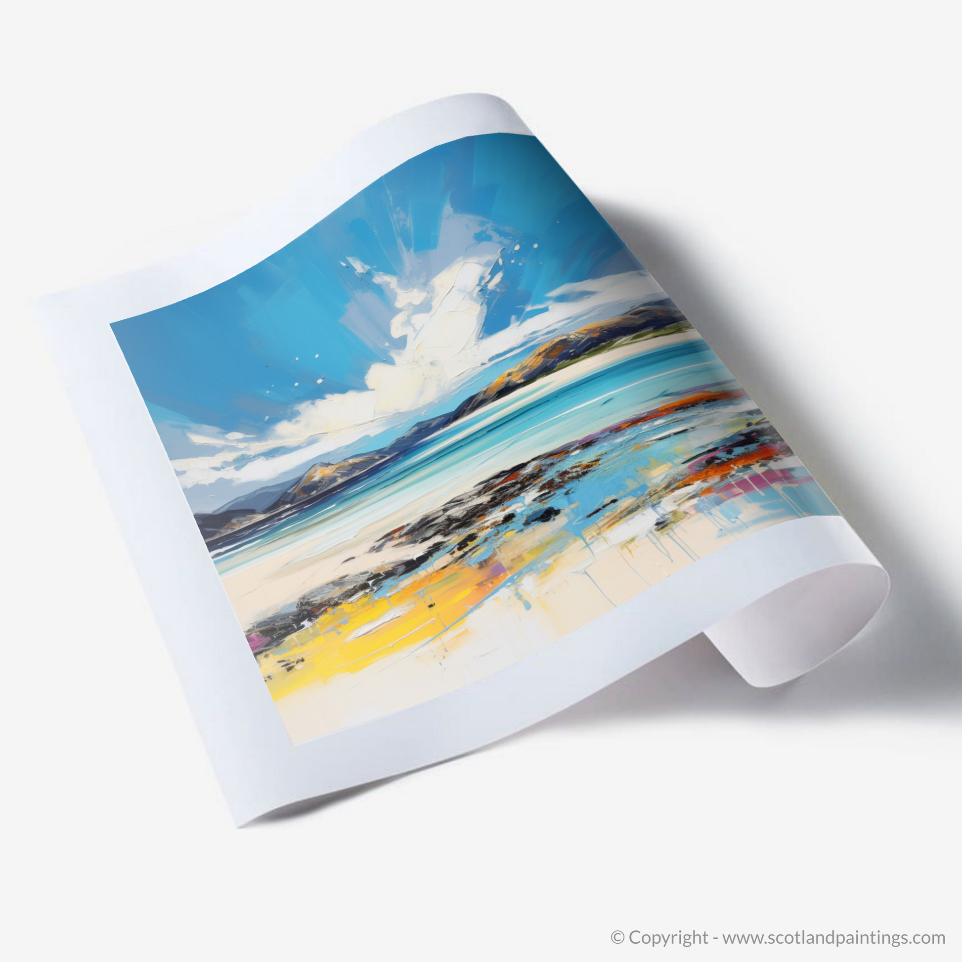 Capturing the unbridled spirit of one of Scotland's most breathtaking locations, this print embodies the raw beauty of Luskentyre Beach on the Isle of Harris. Streaks of vibrant blues and turquoises clash and converge, depicting the dynamic interplay of sky and sea, while the bold brushstrokes in the foreground suggest the wild, untamed nature of the beach's sands and scattered rocks.