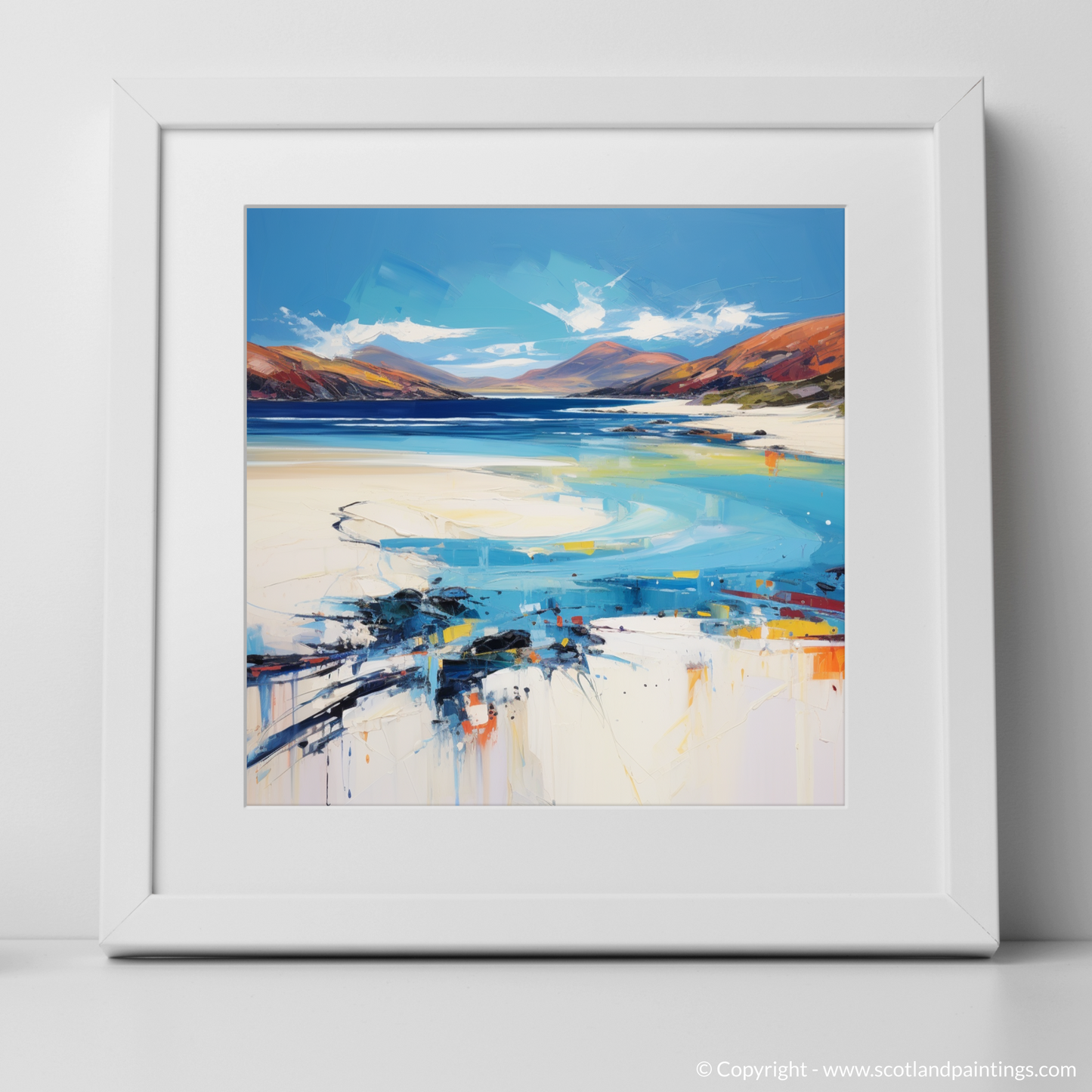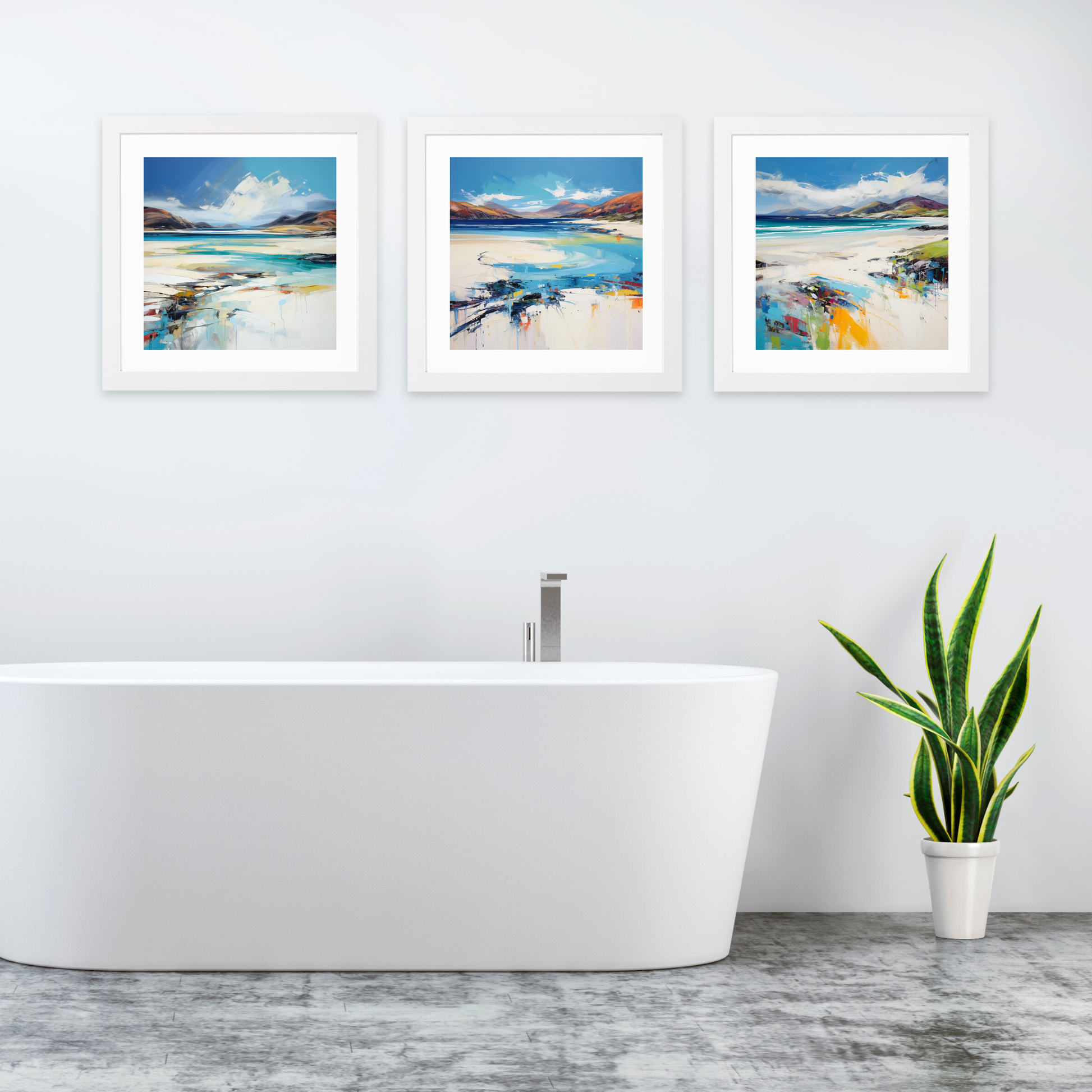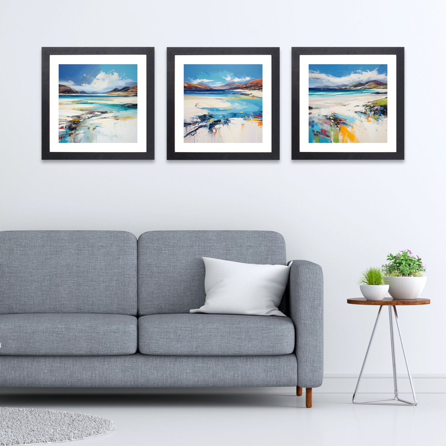 Introducing a stunning set of three framed prints from the Scottish Beaches collection, available exclusively on ScotlandPaintings.com. These captivating prints feature the serene beauty of Luskentyre Beach, Isle of Harris, encapsulating the essence of Scotland’s rugged coastline. Each piece transports you to the shores of the Outer Hebrides with vivid blues, tranquil sands, and dynamic strokes of colour that evoke the feeling of waves gently lapping against the shore.