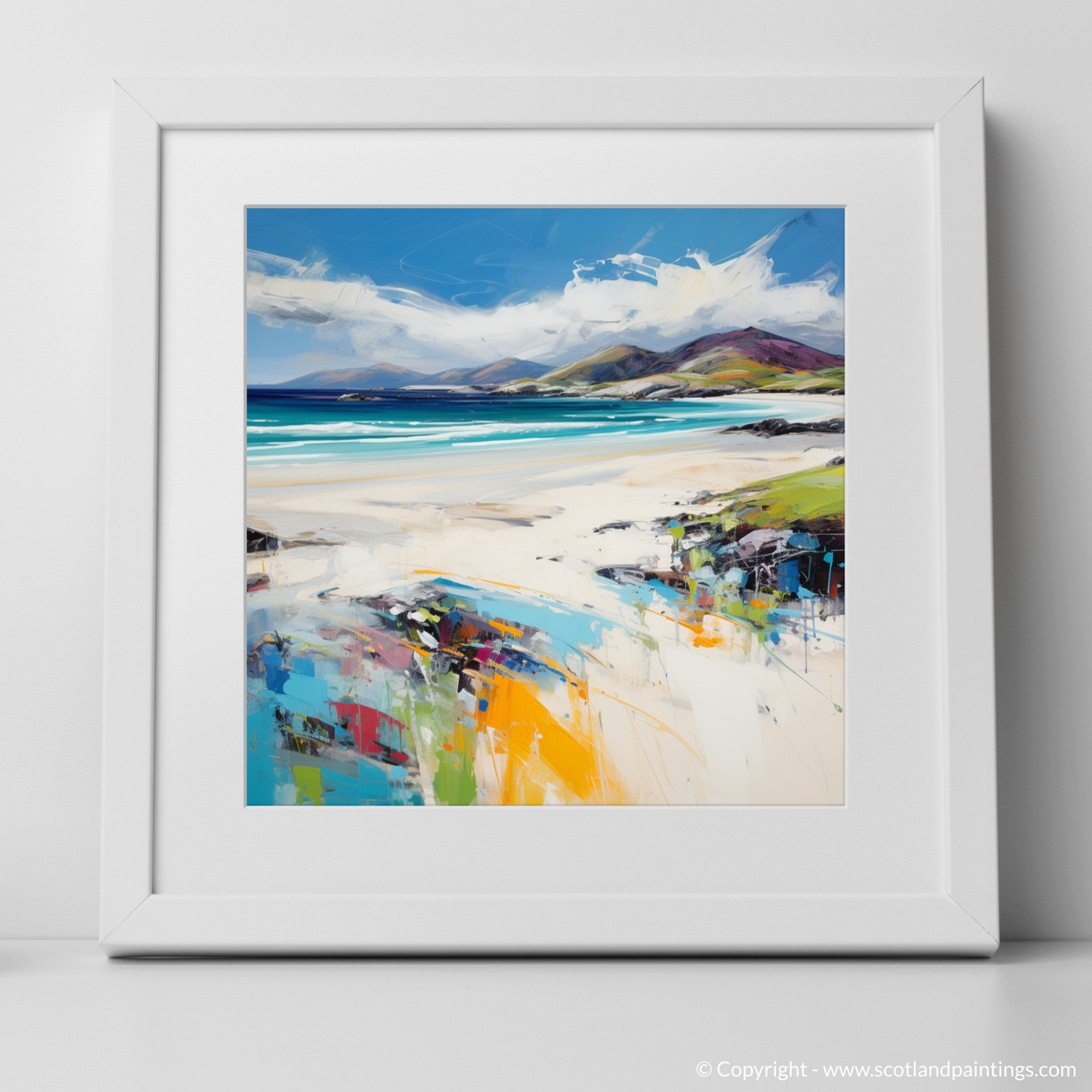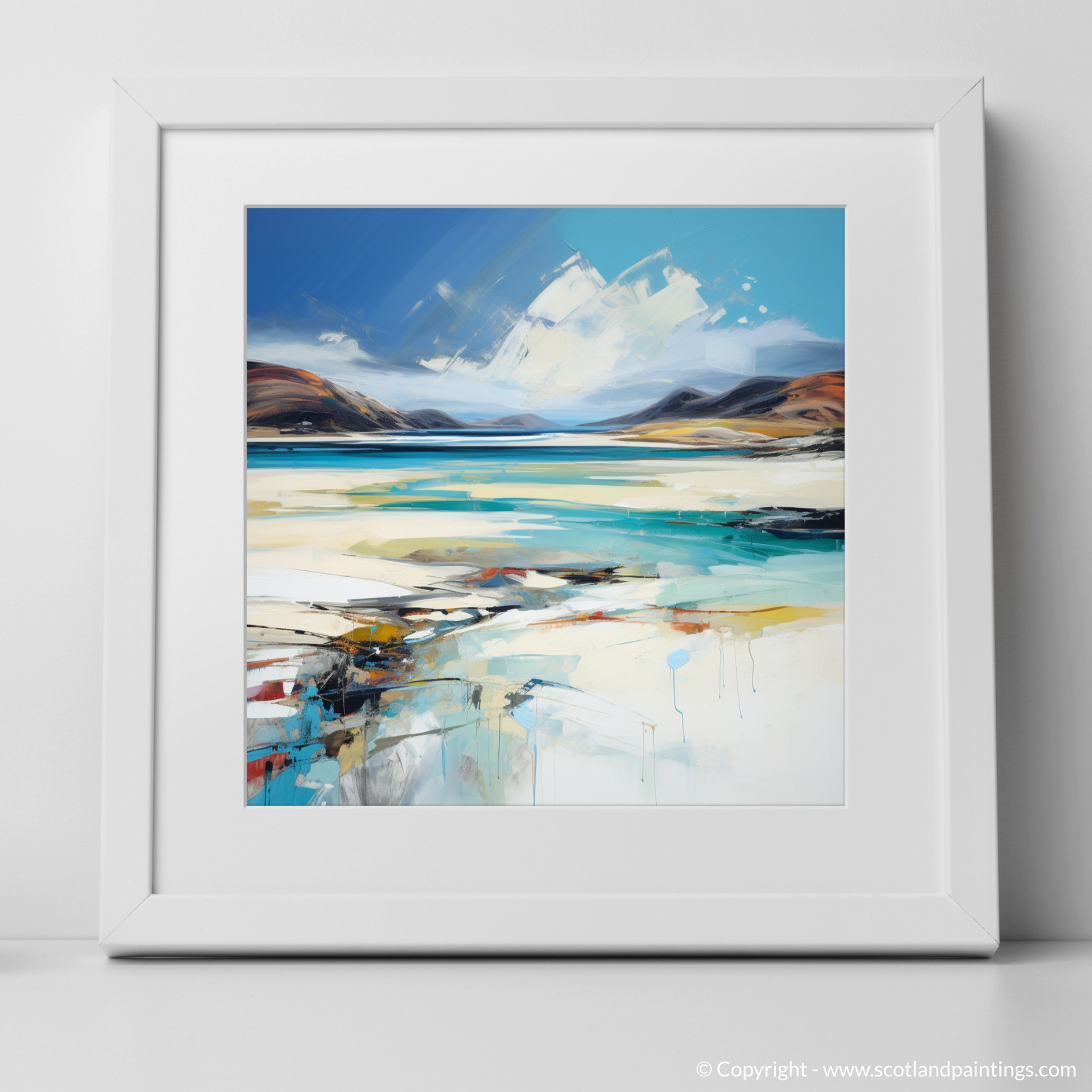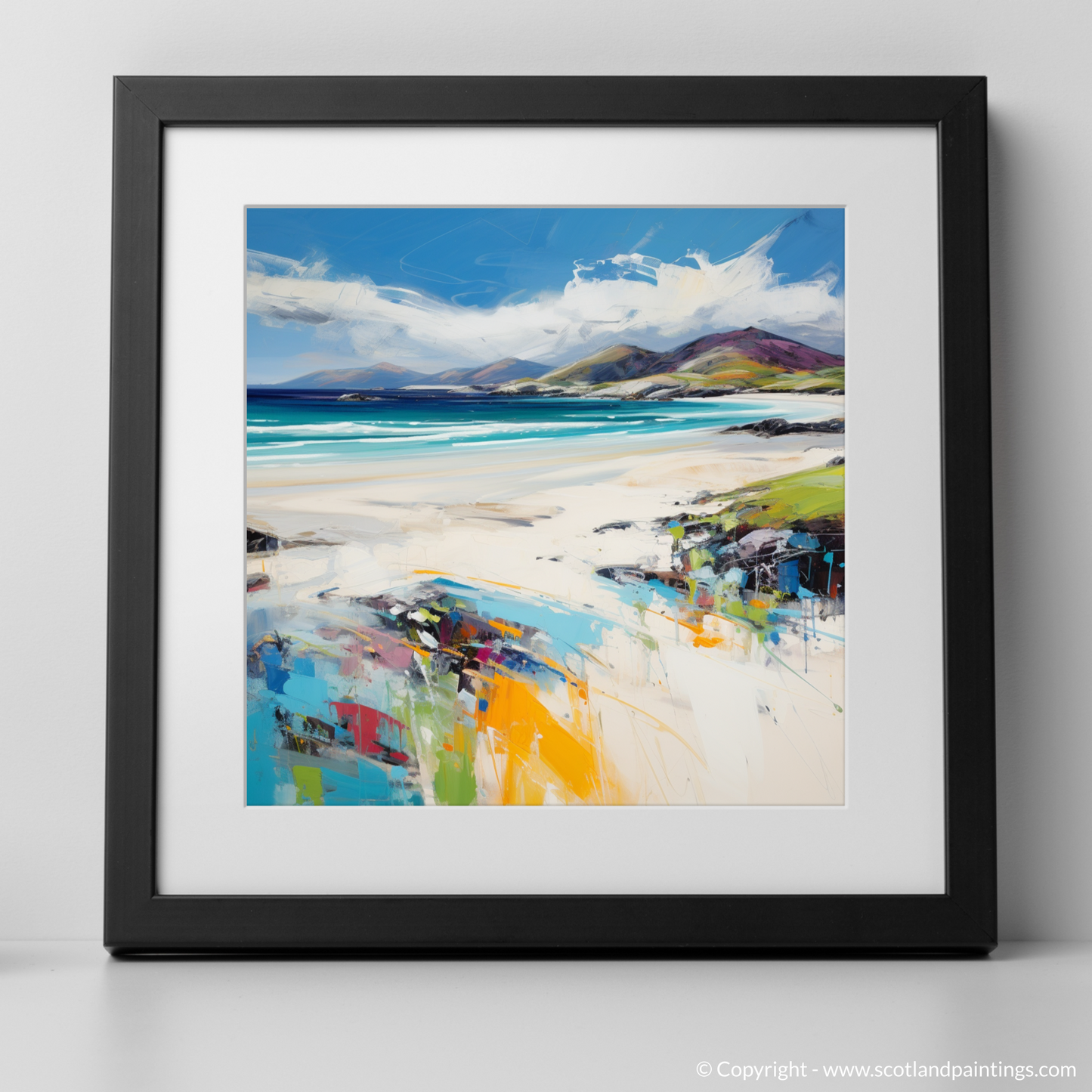 Introducing a stunning set of three framed prints from the Scottish Beaches collection, available exclusively on ScotlandPaintings.com. These captivating prints feature the serene beauty of Luskentyre Beach, Isle of Harris, encapsulating the essence of Scotland’s rugged coastline. Each piece transports you to the shores of the Outer Hebrides with vivid blues, tranquil sands, and dynamic strokes of colour that evoke the feeling of waves gently lapping against the shore.