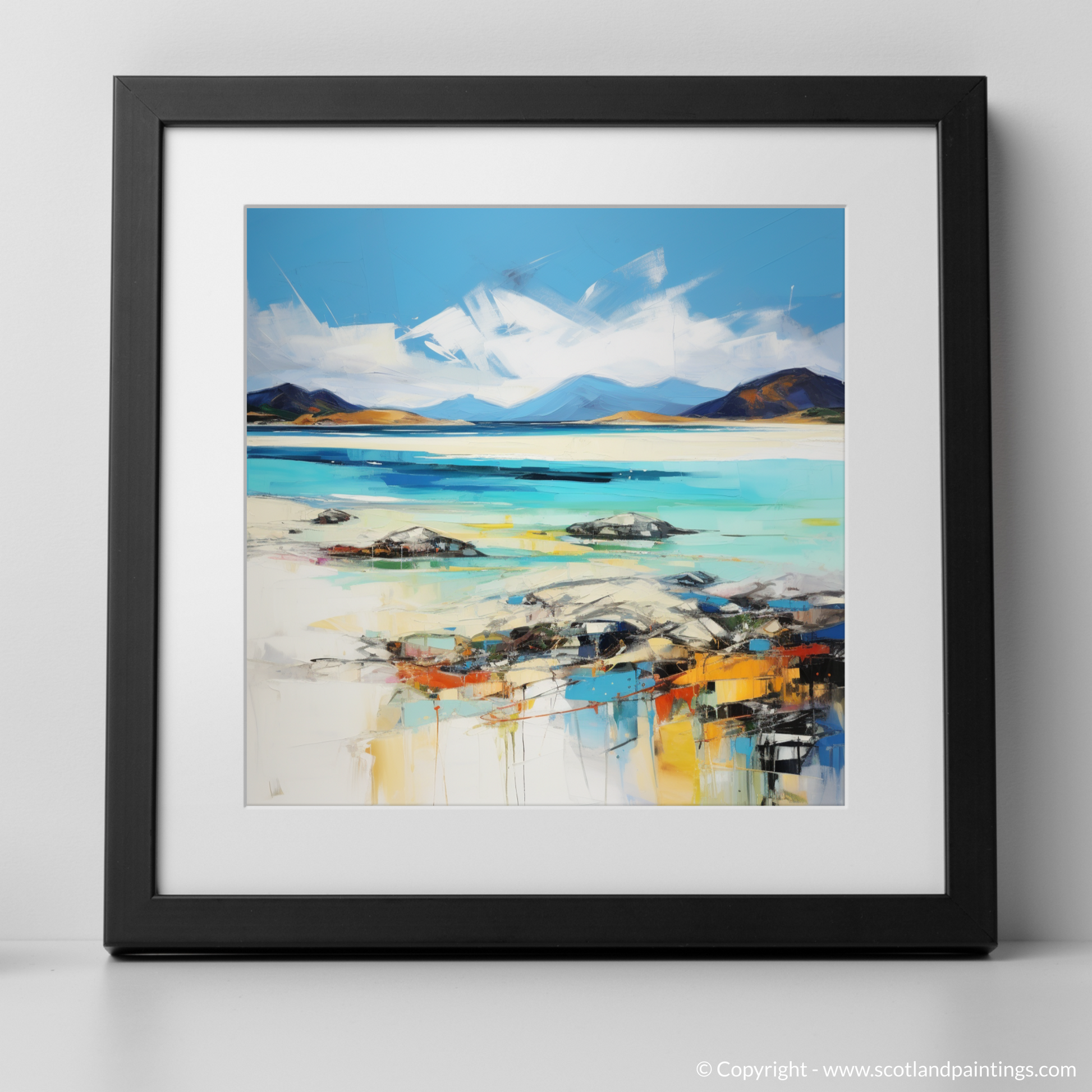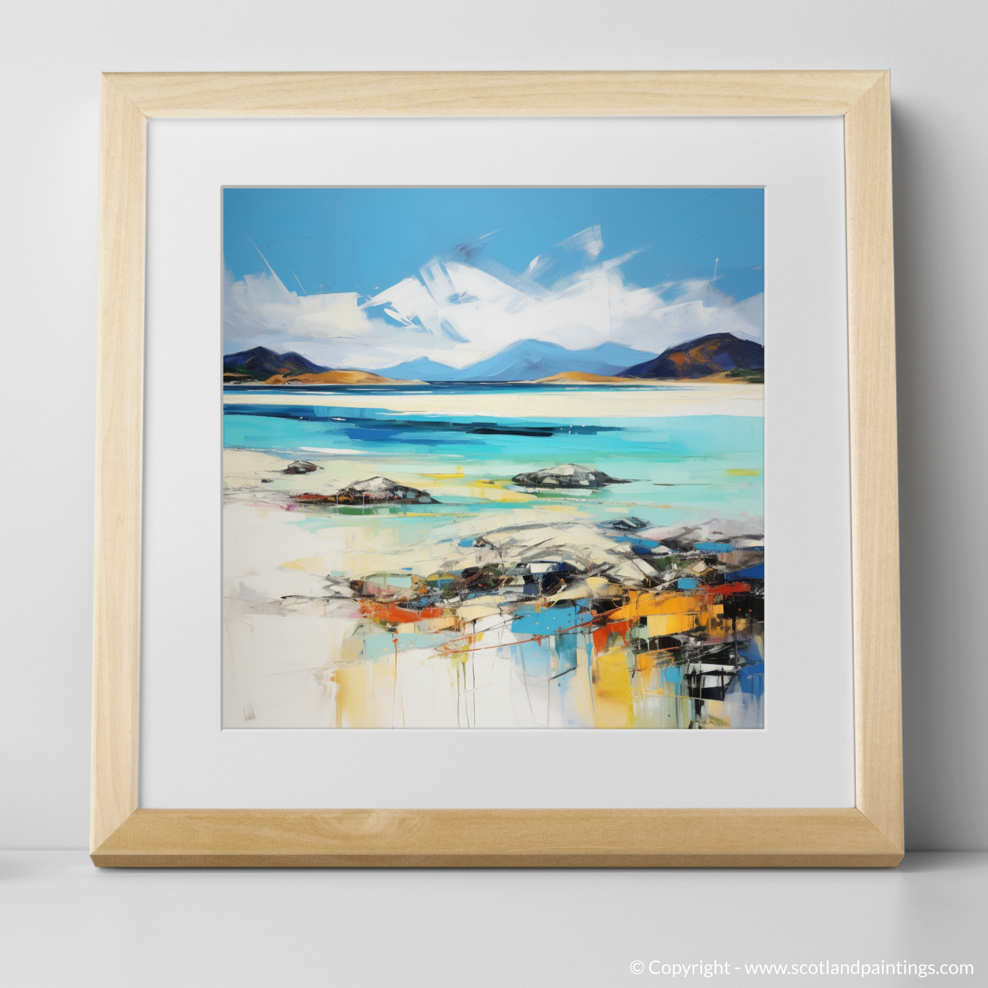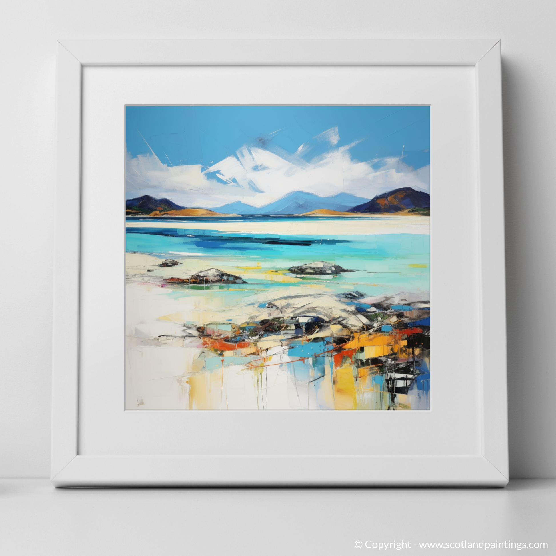 Capturing the untamed beauty of Luskentyre Beach on the Isle of Harris, this stunning print is a remarkable representation of Scotland's natural splendour, articulated through a vibrant expressionist lens. Streaks of azure and turquoise blend with pristine white, reflecting the meeting of sky and sand, while colours seem to dance across the canvas, suggesting the movement of water and light.