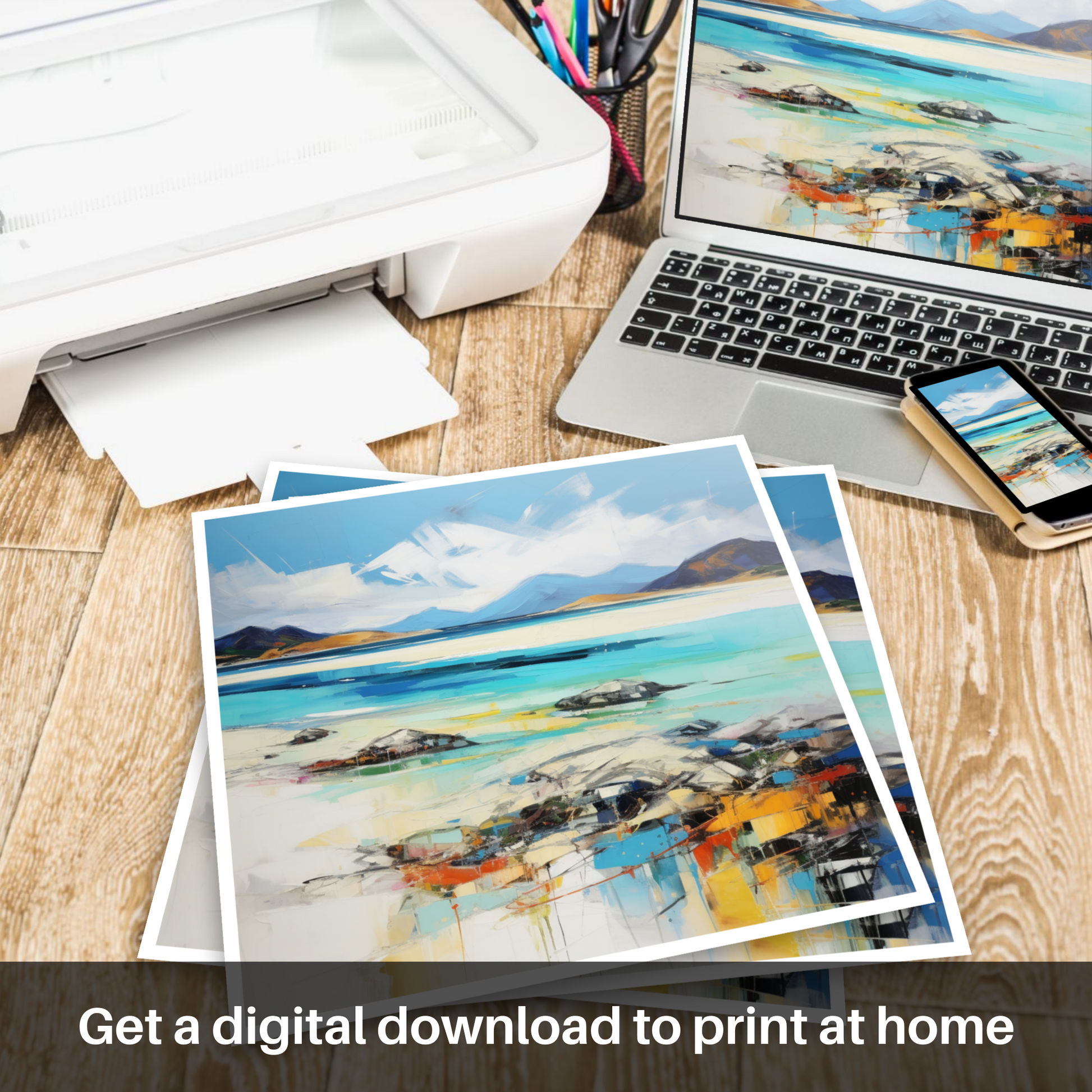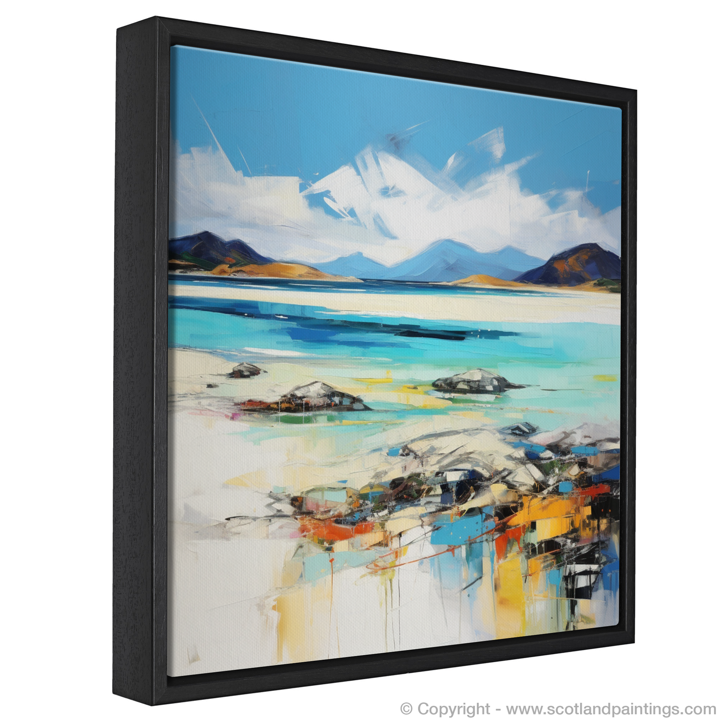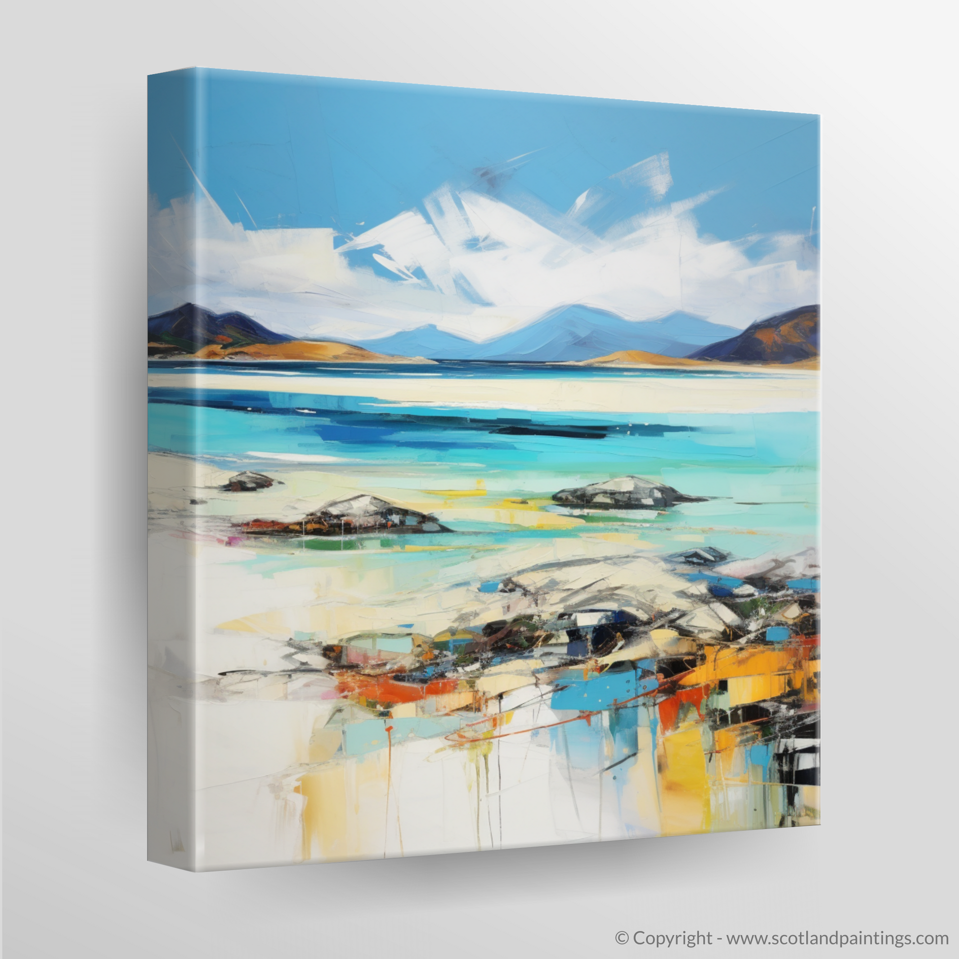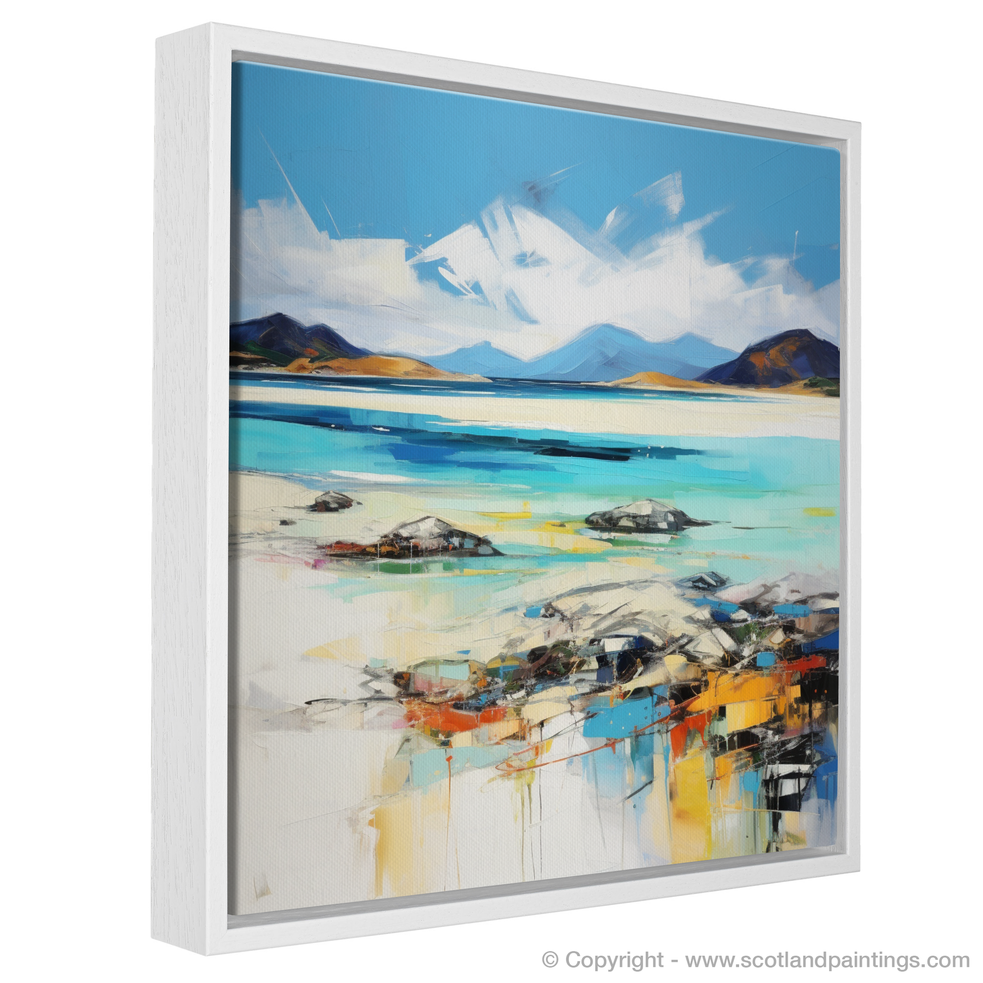 Capturing the untamed beauty of Luskentyre Beach on the Isle of Harris, this stunning print is a remarkable representation of Scotland's natural splendour, articulated through a vibrant expressionist lens. Streaks of azure and turquoise blend with pristine white, reflecting the meeting of sky and sand, while colours seem to dance across the canvas, suggesting the movement of water and light.